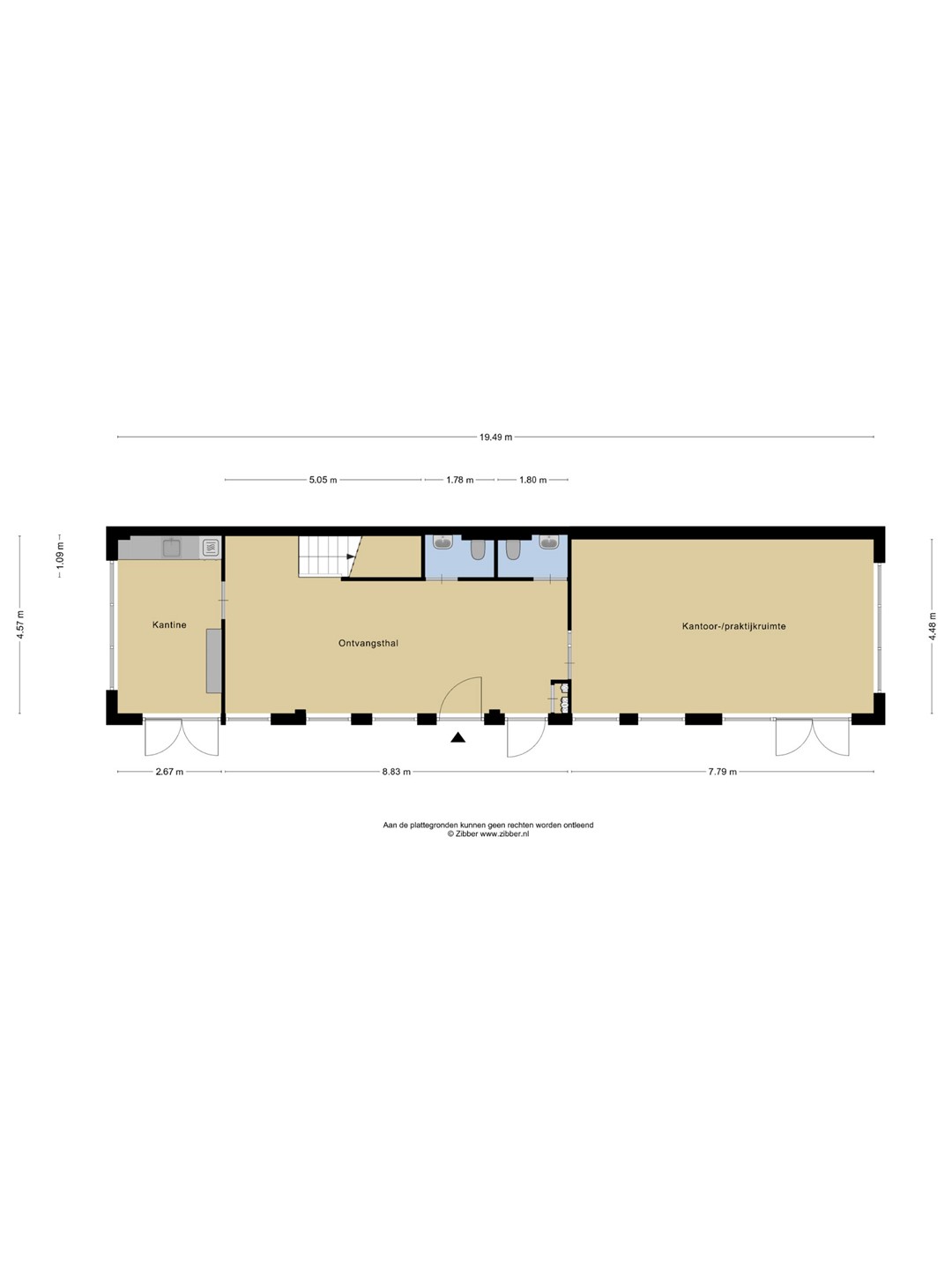 U parkeert uw auto op één van de zes parkeerplaatsen voor het gebouw en betreedt het pand via de centrale entree. Vanuit hier komt u in een ruime en lichte ontvangstruimte met toegang tot twee toiletruimten, de meterkast en de vaste trap naar de verdieping. Vanuit de ontvangsthal heeft u tevens toegang tot een kantoorruimte op de begane grond en de kantine.
