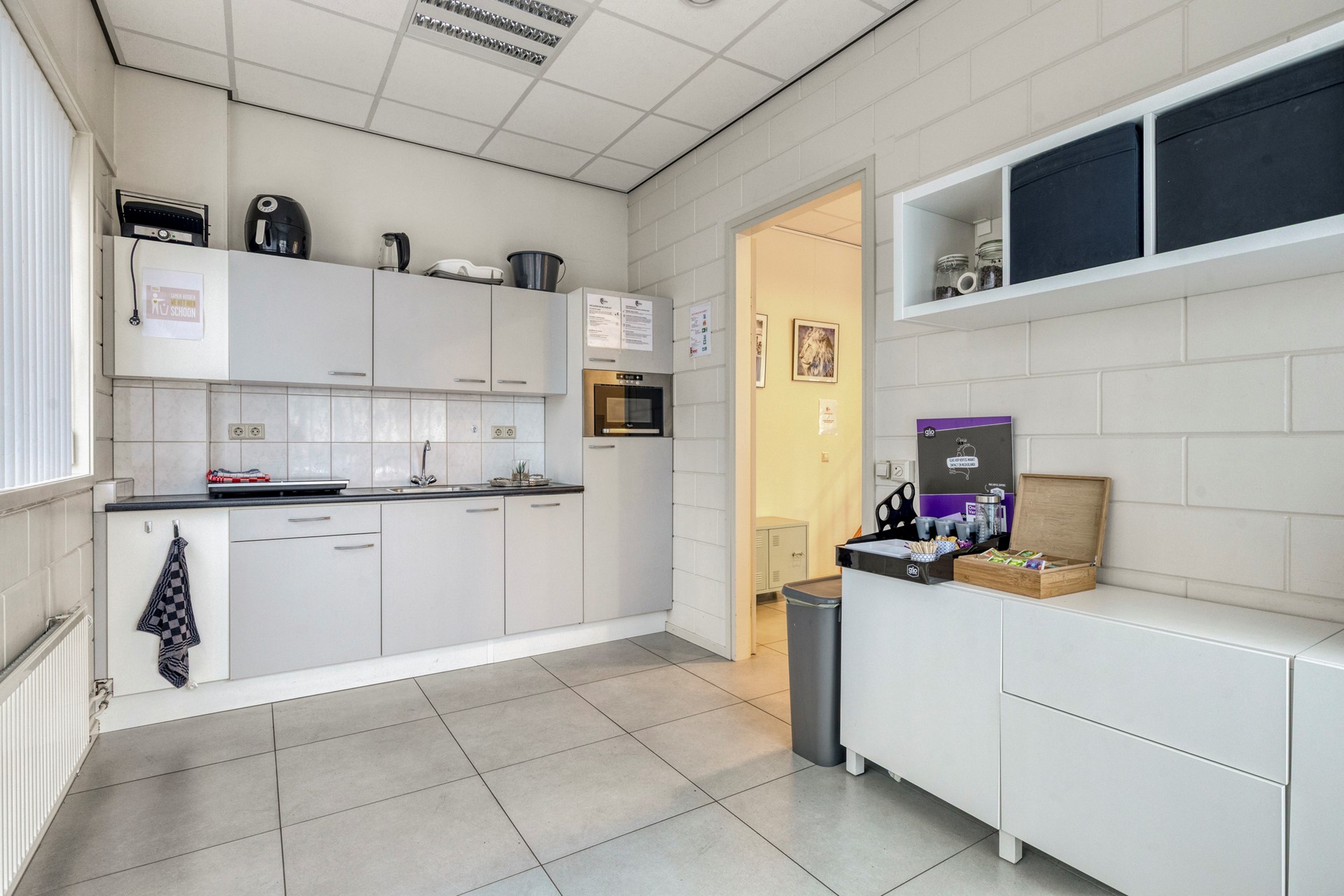 Aan de linkerzijde van de ontvangstruimte bevindt zich de kantine, voorzien van pantry en via twee openslaande deuren direct verbonden met de voorzijde van het pand.
