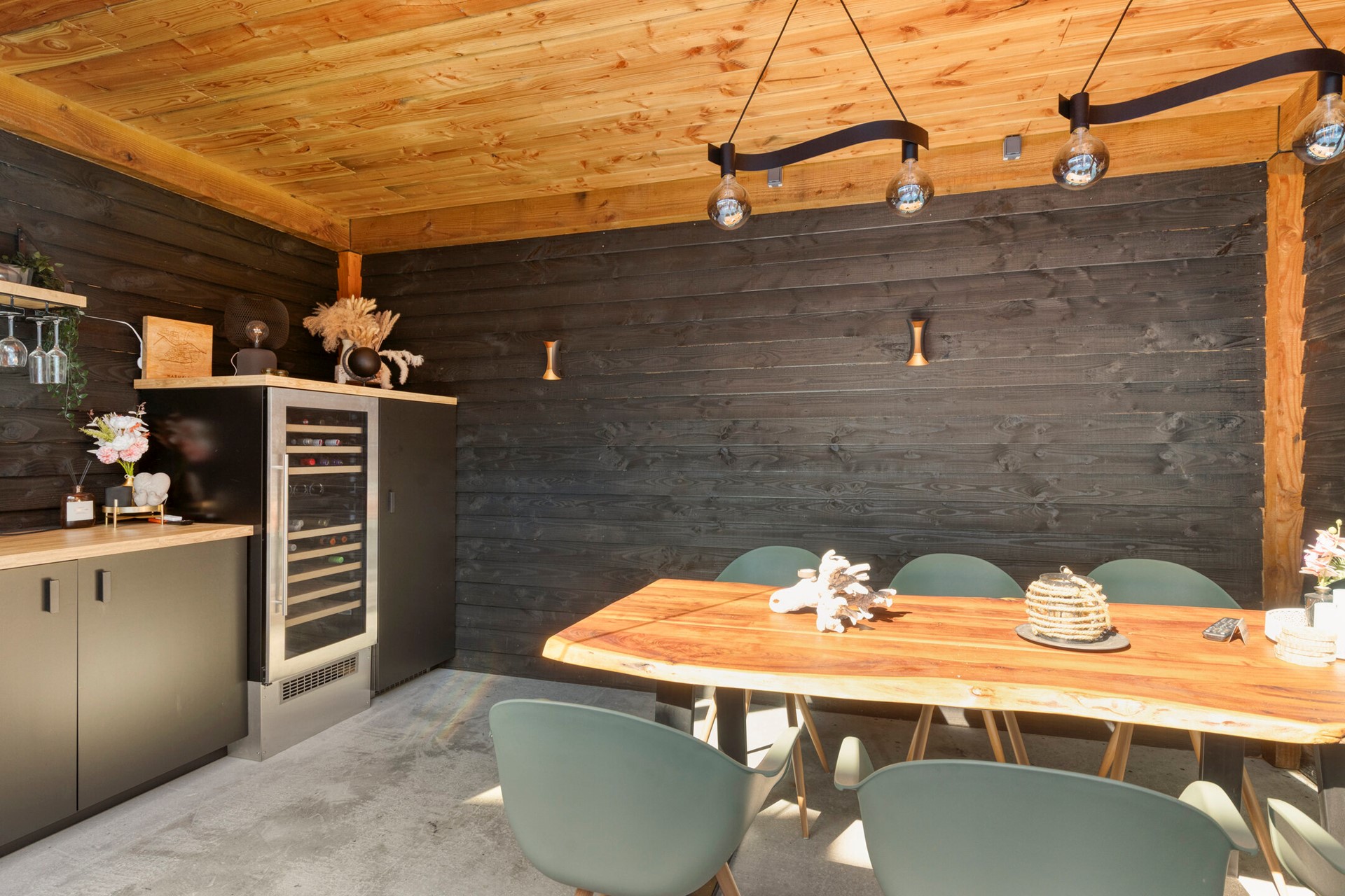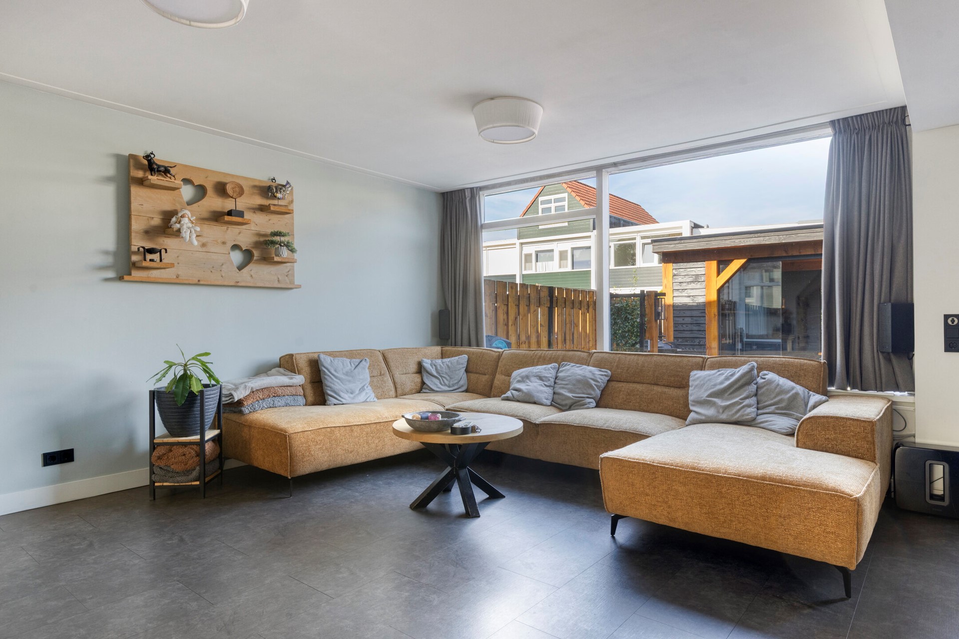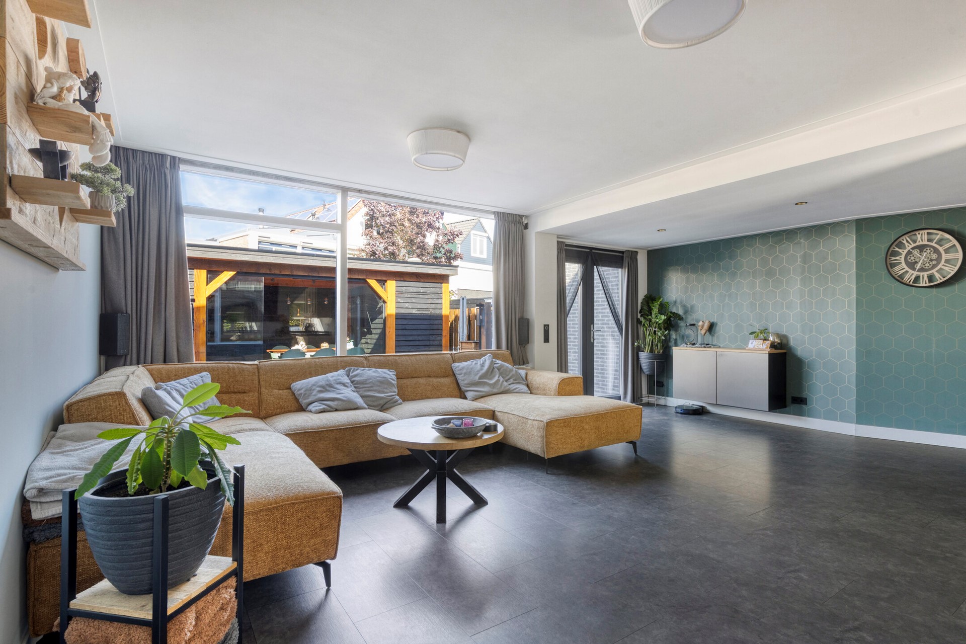De woning is aan de zijkant uitgebouwd, waardoor de woonkamer een royale leefruimte heeft gekregen. De tuingerichte woonkamer is heerlijk licht dankzij de grote raampartijen en de openslaande deuren naar de achtertuin. De uitbouw is voorzien van een verlaagd plafond met inbouwspots, wat zorgt voor een gezellige sfeer. Hier is voldoende plek voor een ruime zithoek én een royale eethoek. De eethoek beschikt over een elektrische verwarming en een fraaie industriële lamp, welke beide achterblijven.