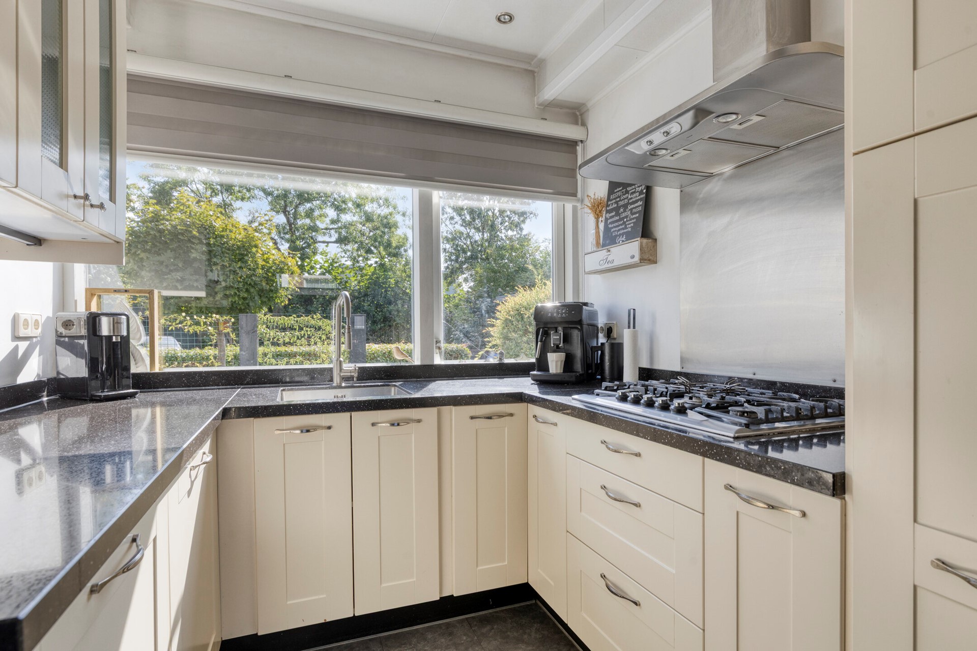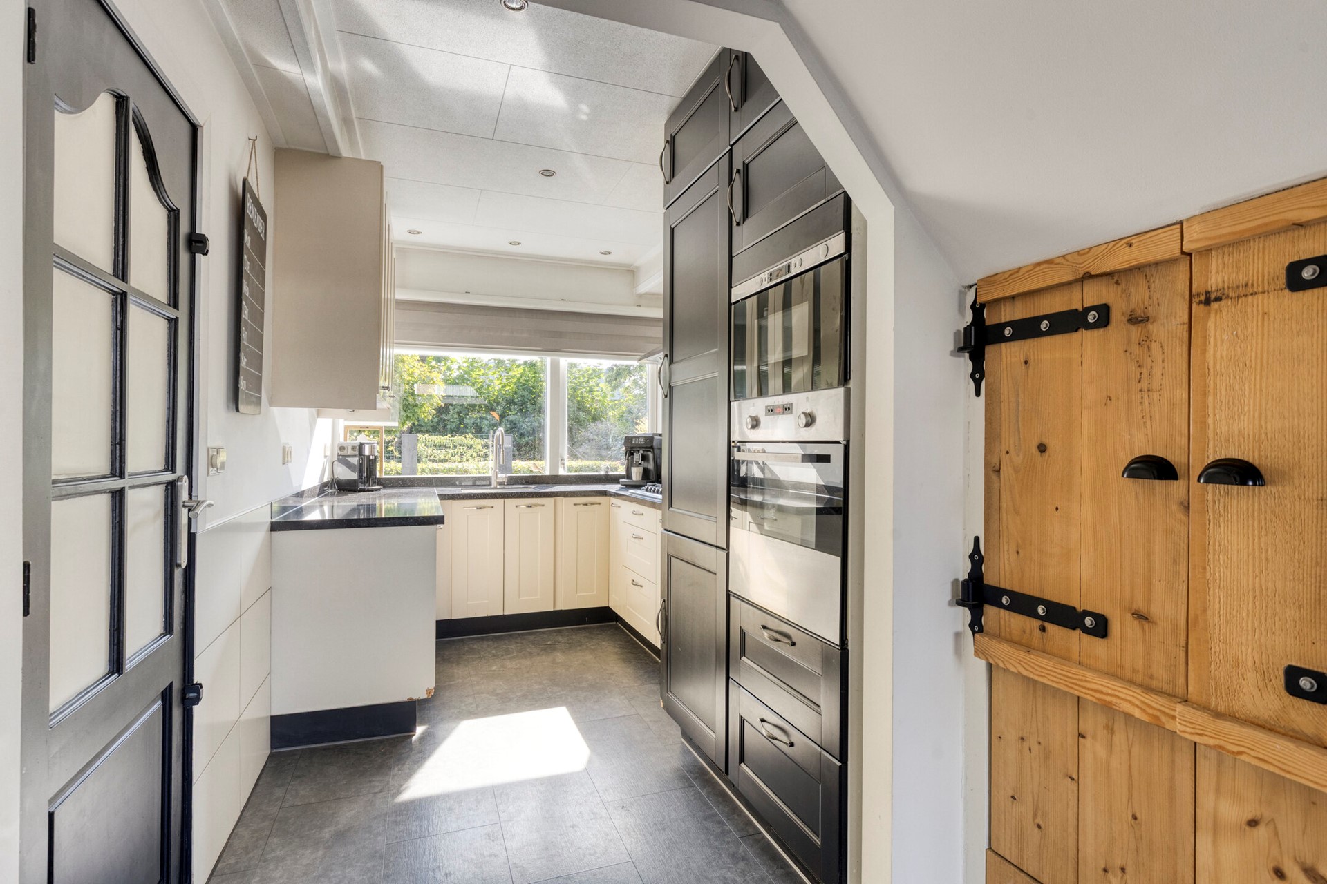 De halfopen keuken is aan de voorzijde gesitueerd en kijkt uit op de voortuin. De keuken is in U-vorm opgesteld en beschikt daarnaast over een praktische kastenwand. Aan apparatuur vindt u onder meer een 5-pits gaskookplaat, afzuigkap, koel-vriescombinatie, vaatwasser, oven en magnetron. Vanuit de keuken bereikt u de inpandige berging, die tevens via de voortuin toegankelijk is.