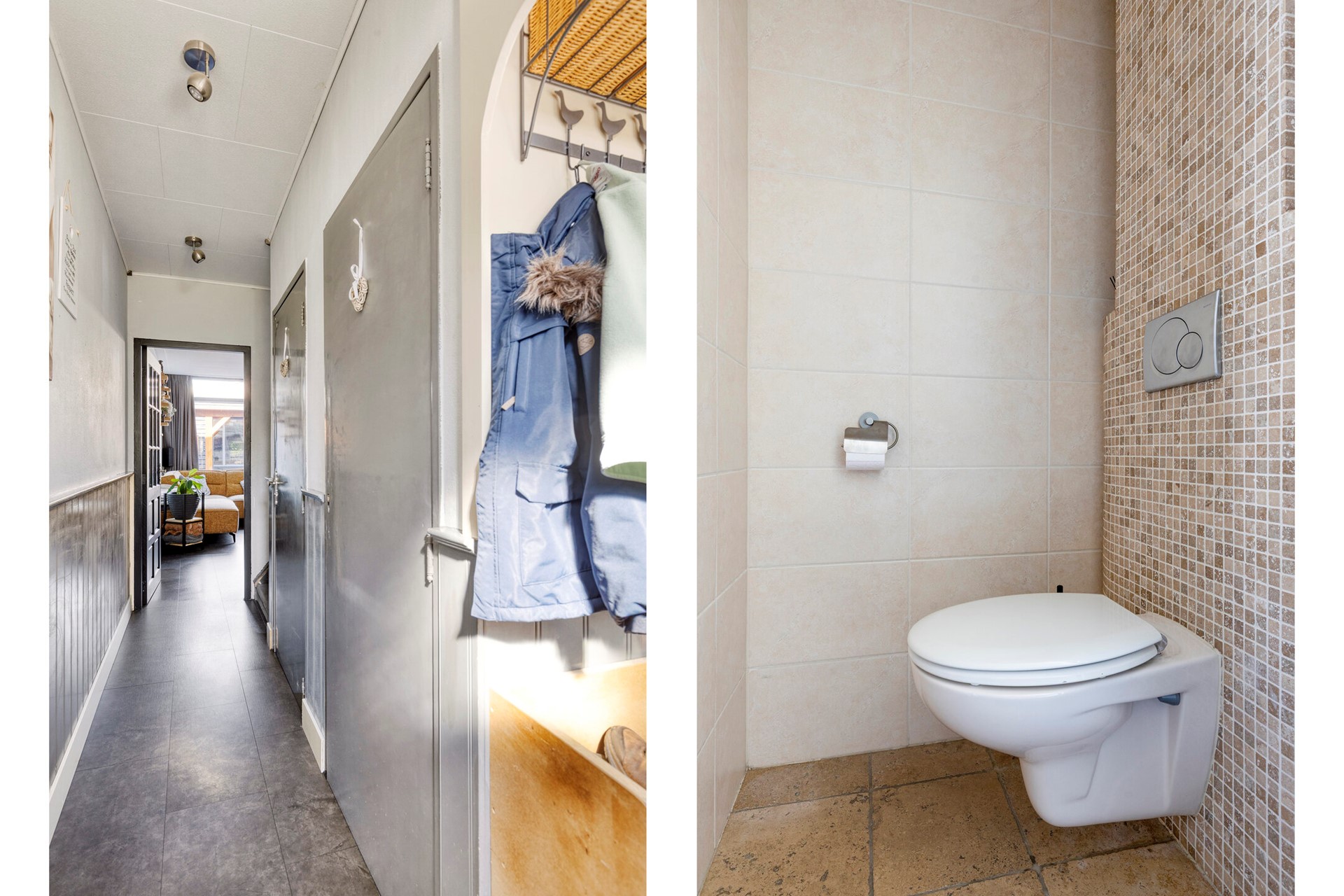 U parkeert uw auto aan de openbare weg en loopt vervolgens via een looppad naar de voortuin van de woning. Vanuit de strak aangelegde voortuin bereikt u de voordeur en komt u binnen in de ruime hal, voorzien van meterkast, garderobe, toilet, de trapopgang naar de verdieping en toegang tot de woonkamer.