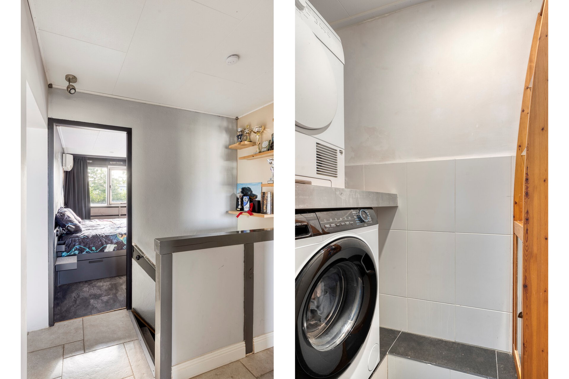 Via de vaste trap komt u op de overloop met toegang tot twee slaapkamers, de walk-in closet met aansluitend een derde slaapkamer, de badkamer, een kast en de separate wasruimte.
