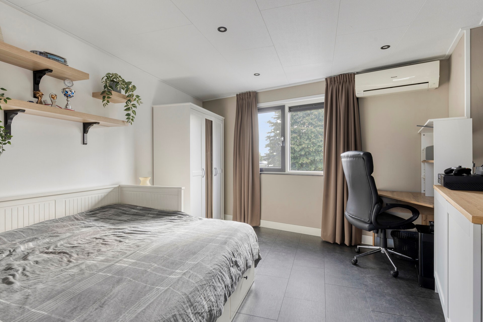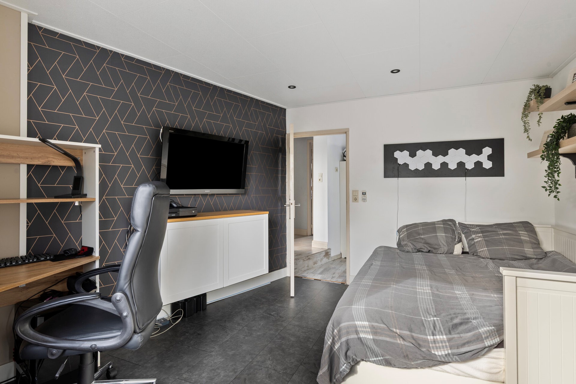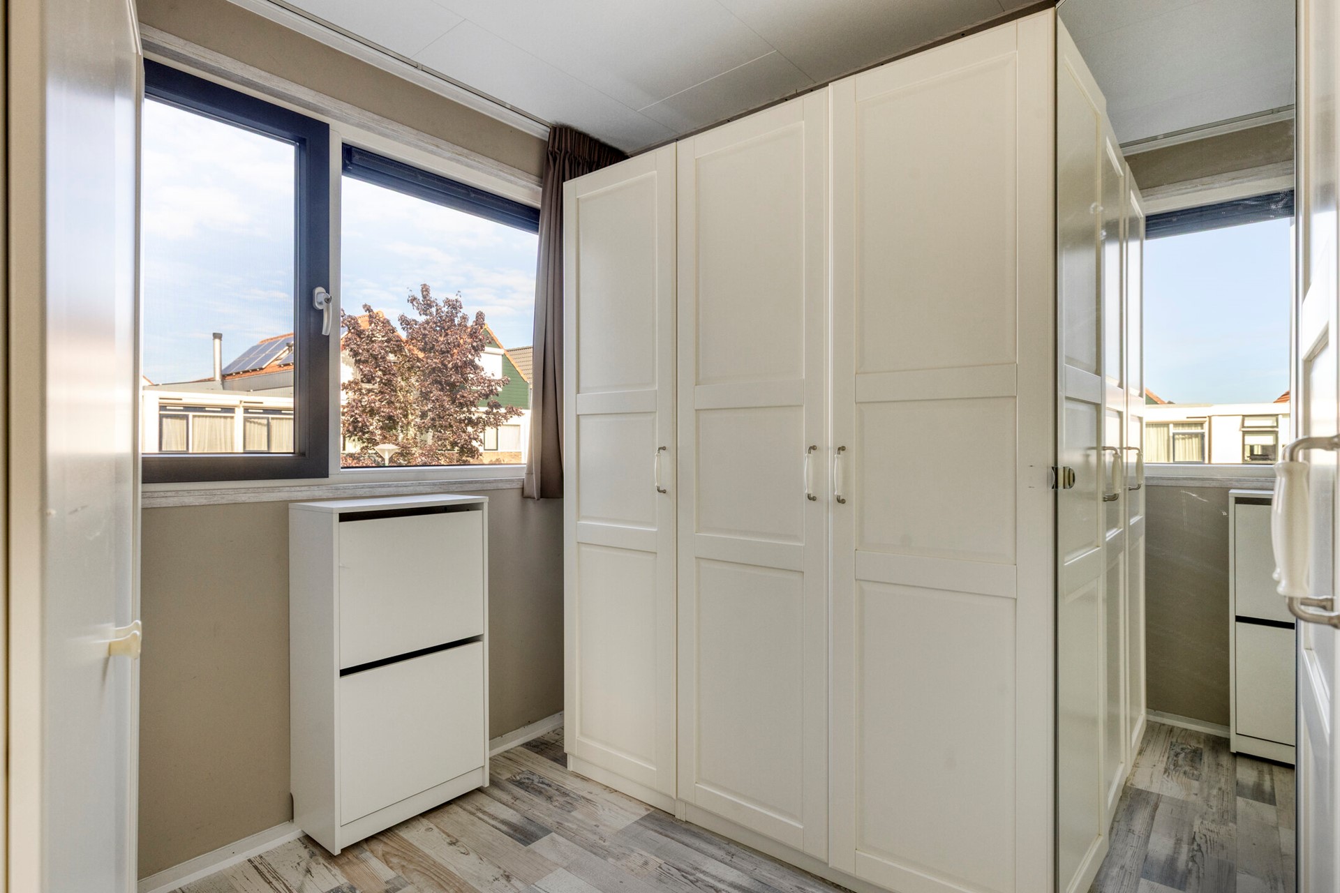 De masterbedroom bevindt zich aan de voorzijde en is opvallend licht door de brede raampartij. De tweede slaapkamer ligt aan de achterzijde en kijkt uit over de tuin. De derde slaapkamer, gelegen boven de zij-aanbouw, is bereikbaar via de walk-in-closet en beschikt eveneens over inbouwspots.