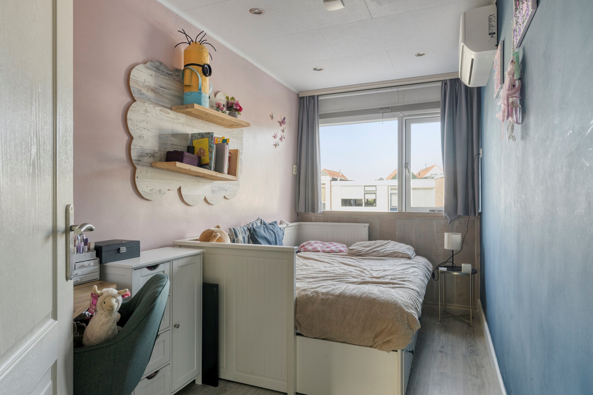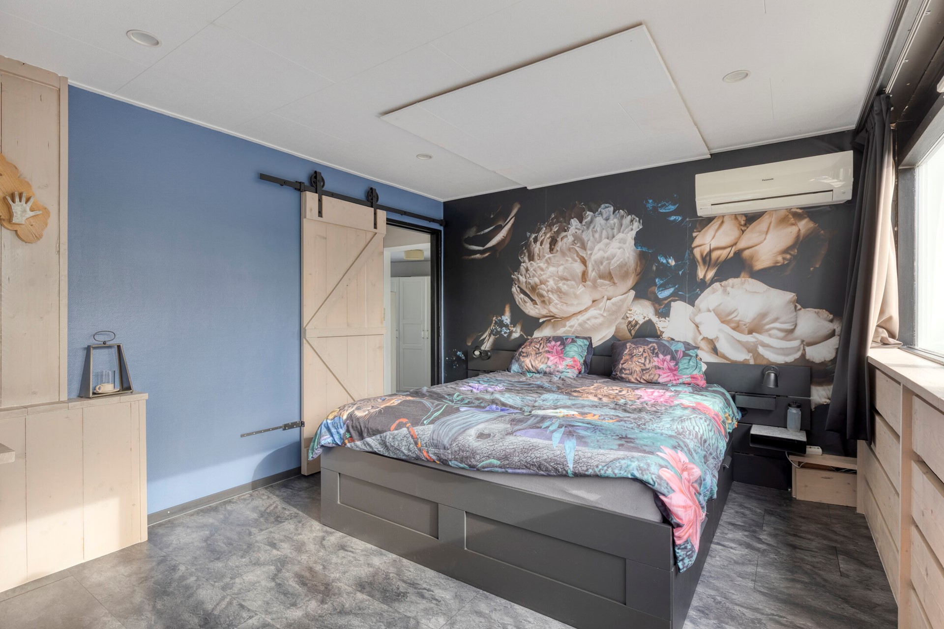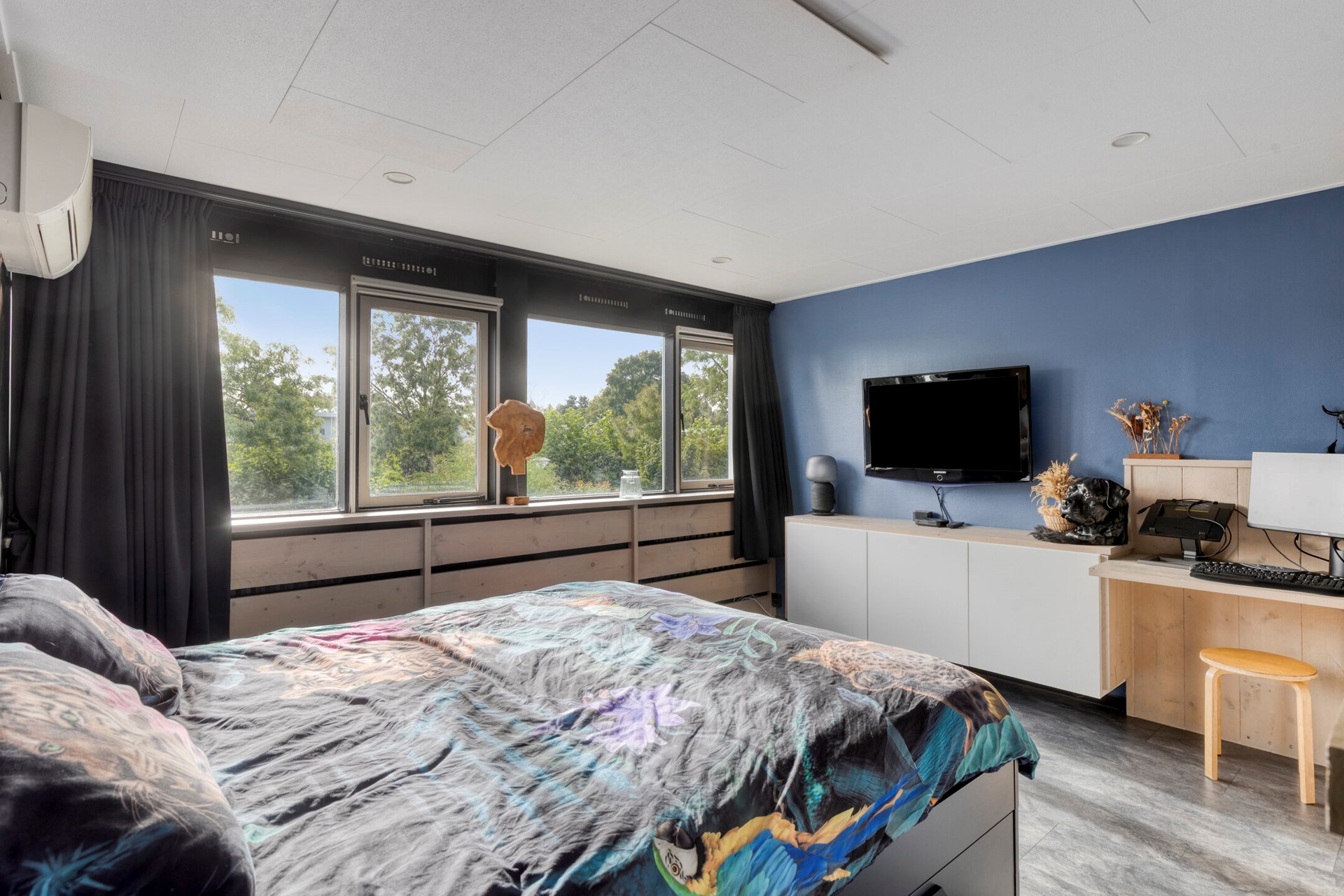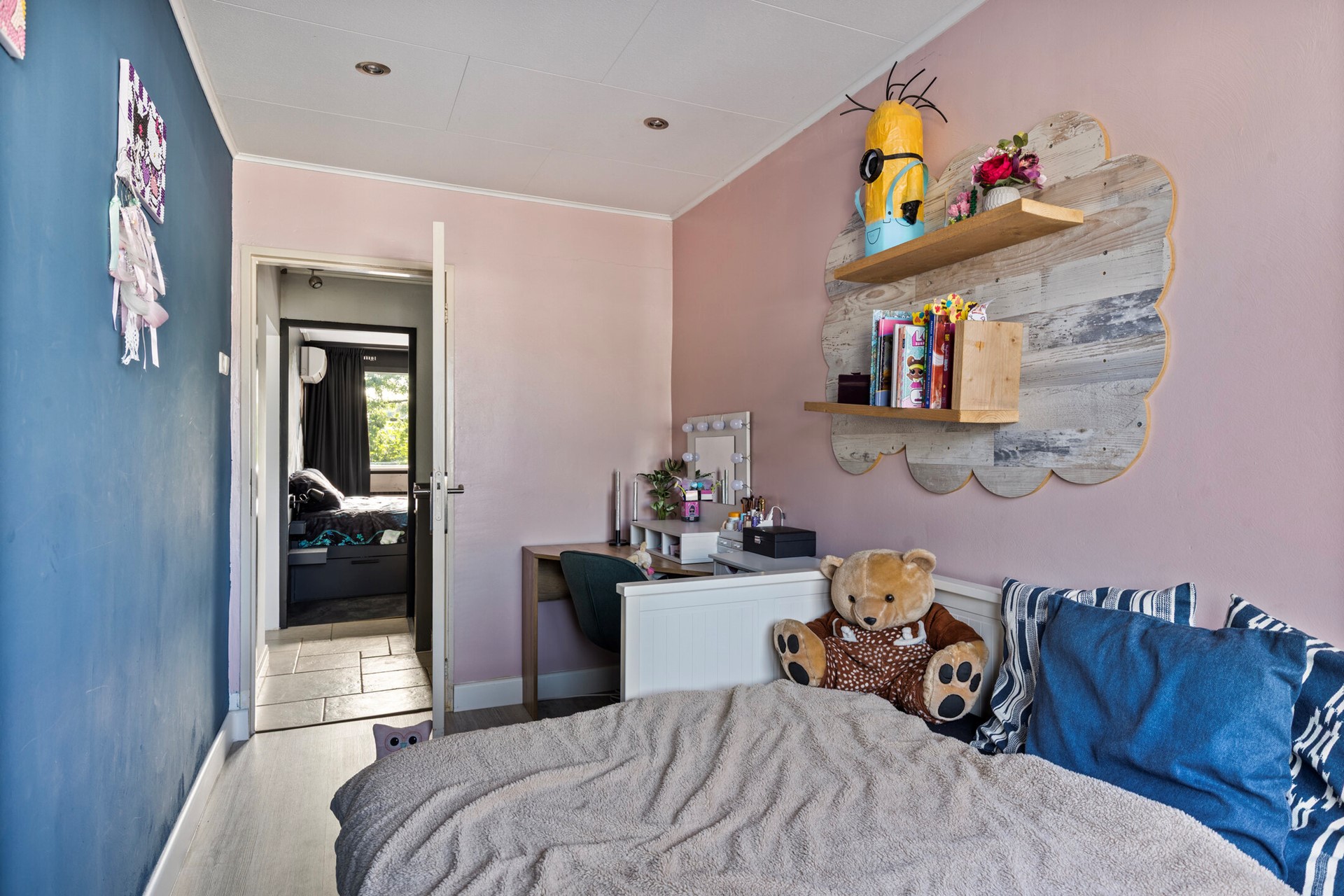 De masterbedroom bevindt zich aan de voorzijde en is opvallend licht door de brede raampartij. De tweede slaapkamer ligt aan de achterzijde en kijkt uit over de tuin. De derde slaapkamer, gelegen boven de zij-aanbouw, is bereikbaar via de walk-in-closet en beschikt eveneens over inbouwspots.