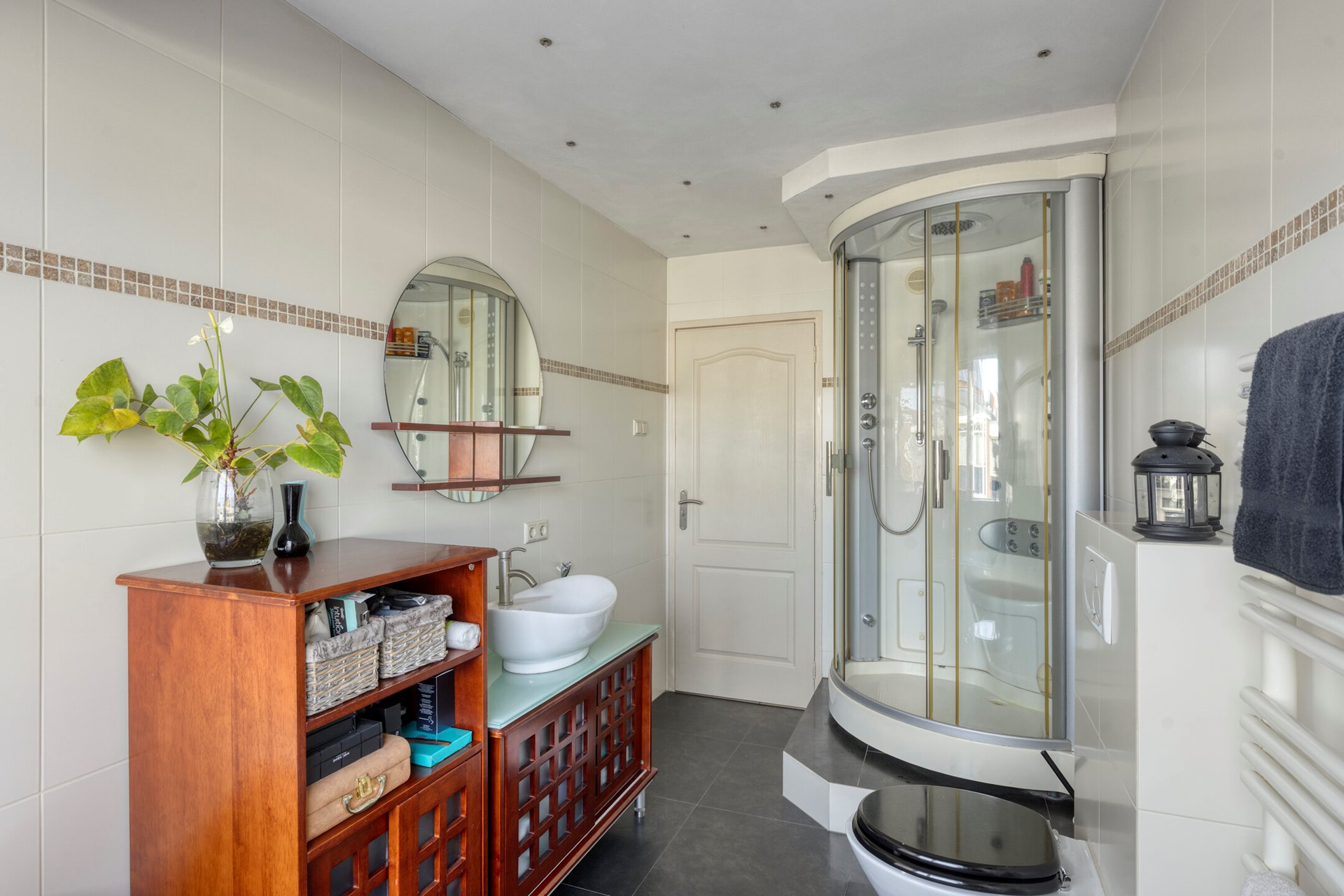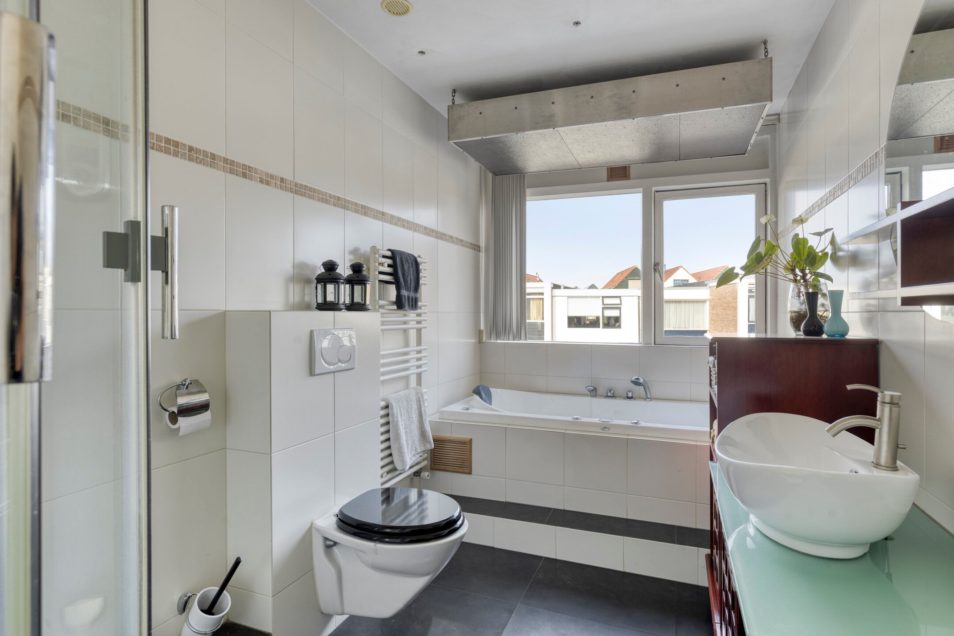 De geheel betegelde badkamer is gelegen aan de achterzijde en voorzien van een wastafelmeubel, douchecabine, whirlpool (kraan links defect), toilet en designradiator.