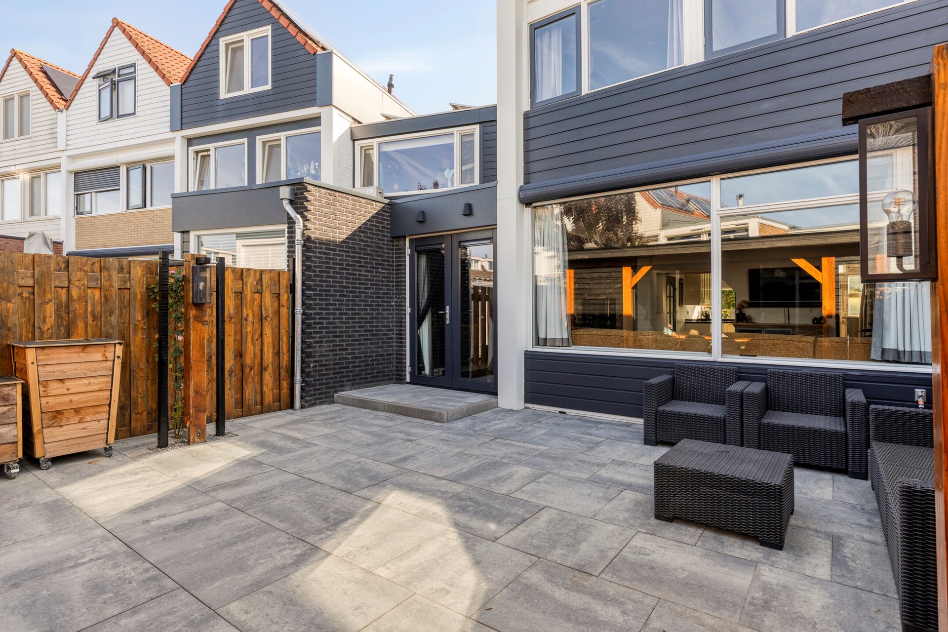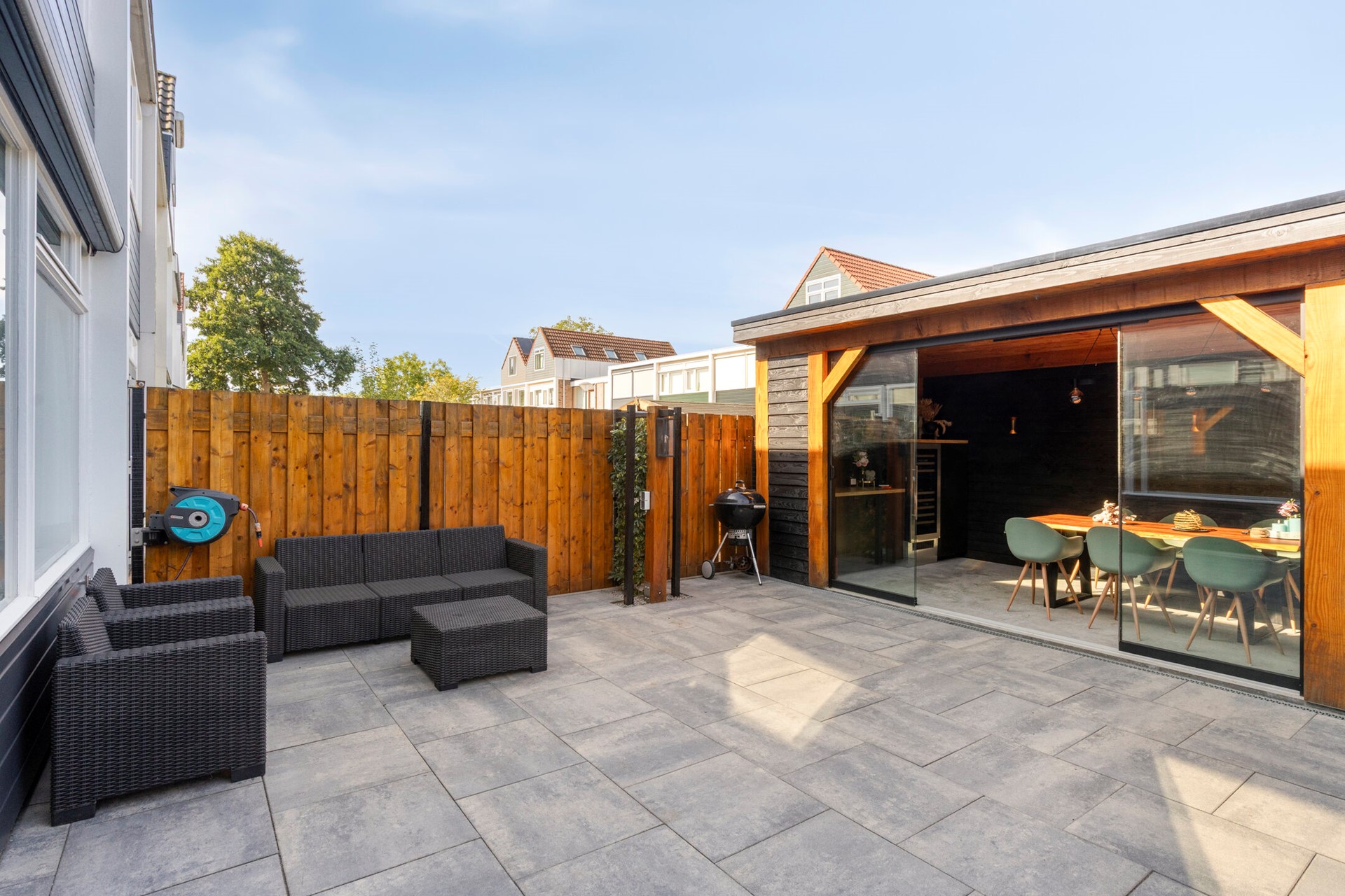 De brede achtertuin is gelegen op het westen en biedt de hele middag en avond zon. De tuin is strak aangelegd met grote antraciet tegels en aan de zijkanten voorzien van schuttingen. Aan de achtergevel is een elektrisch zonnescherm bevestigd, waarmee u op warme dagen eenvoudig voor een fijne schaduwplek zorgt. Achterin de tuin bevindt zich een riante, volledig geïsoleerde en onderheide veranda met glazen schuifwand. Hierdoor kunt u hier zowel in de zomer als in de winter genieten. De veranda is bovendien voorzien van verlichting en elektra: de perfecte plek om te ontspannen of gezellig te borrelen. Aansluitend aan de veranda is nog een praktische berging gerealiseerd, ideaal voor het opbergen van bijvoorbeeld tuingereedschap.