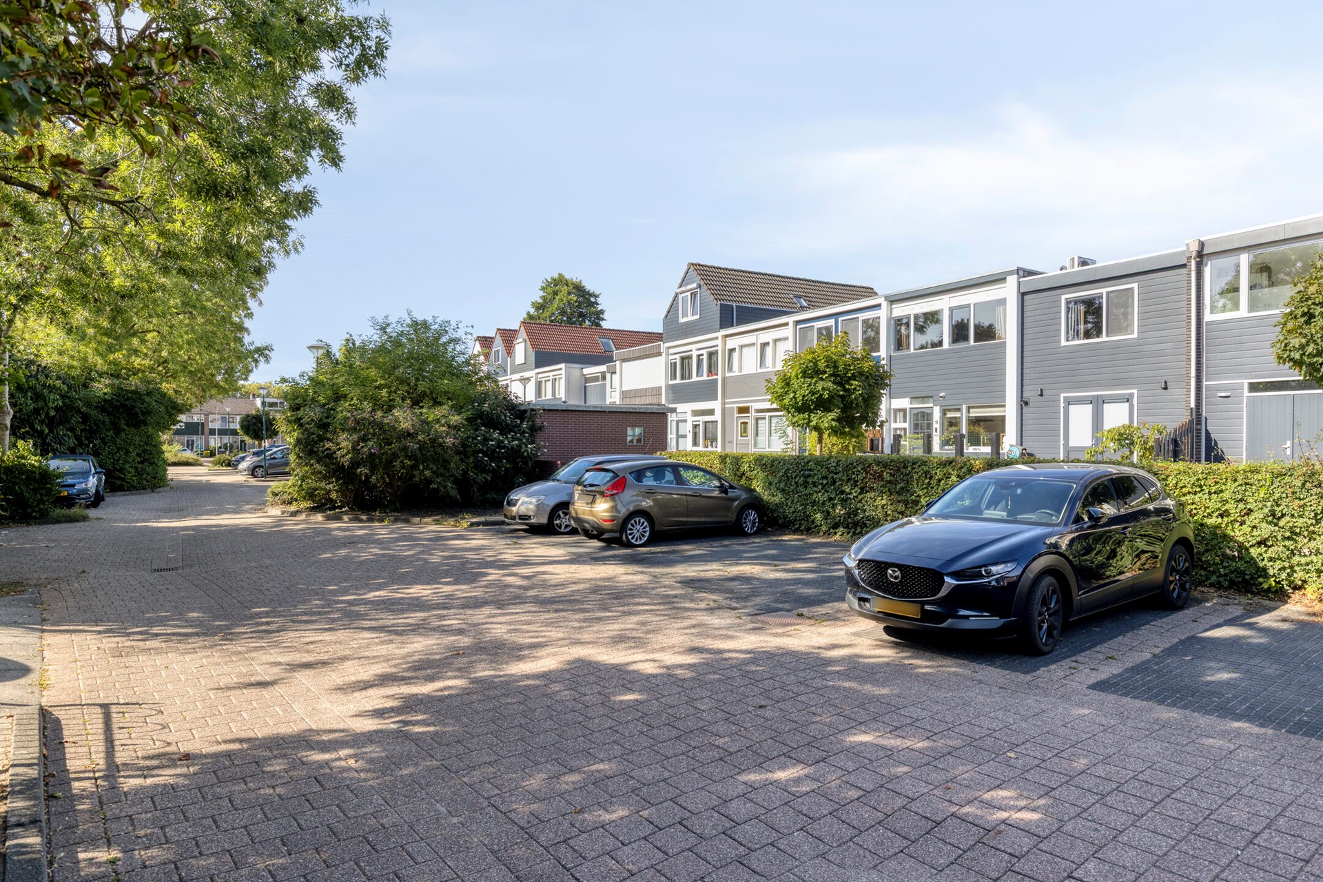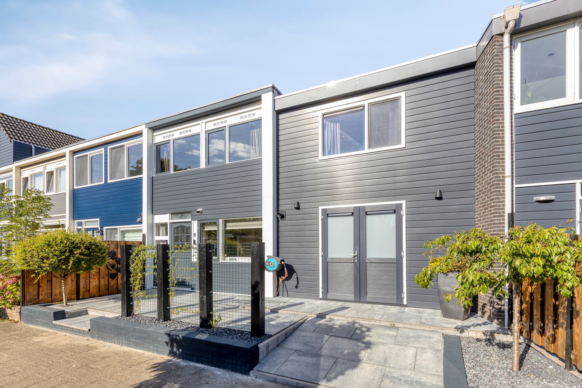 De voortuin is keurig aangelegd in moderne antraciettinten en biedt voldoende ruimte voor een gezellig zitje. Vanuit hier is ook de inpandige berging met dubbele deuren bereikbaar.