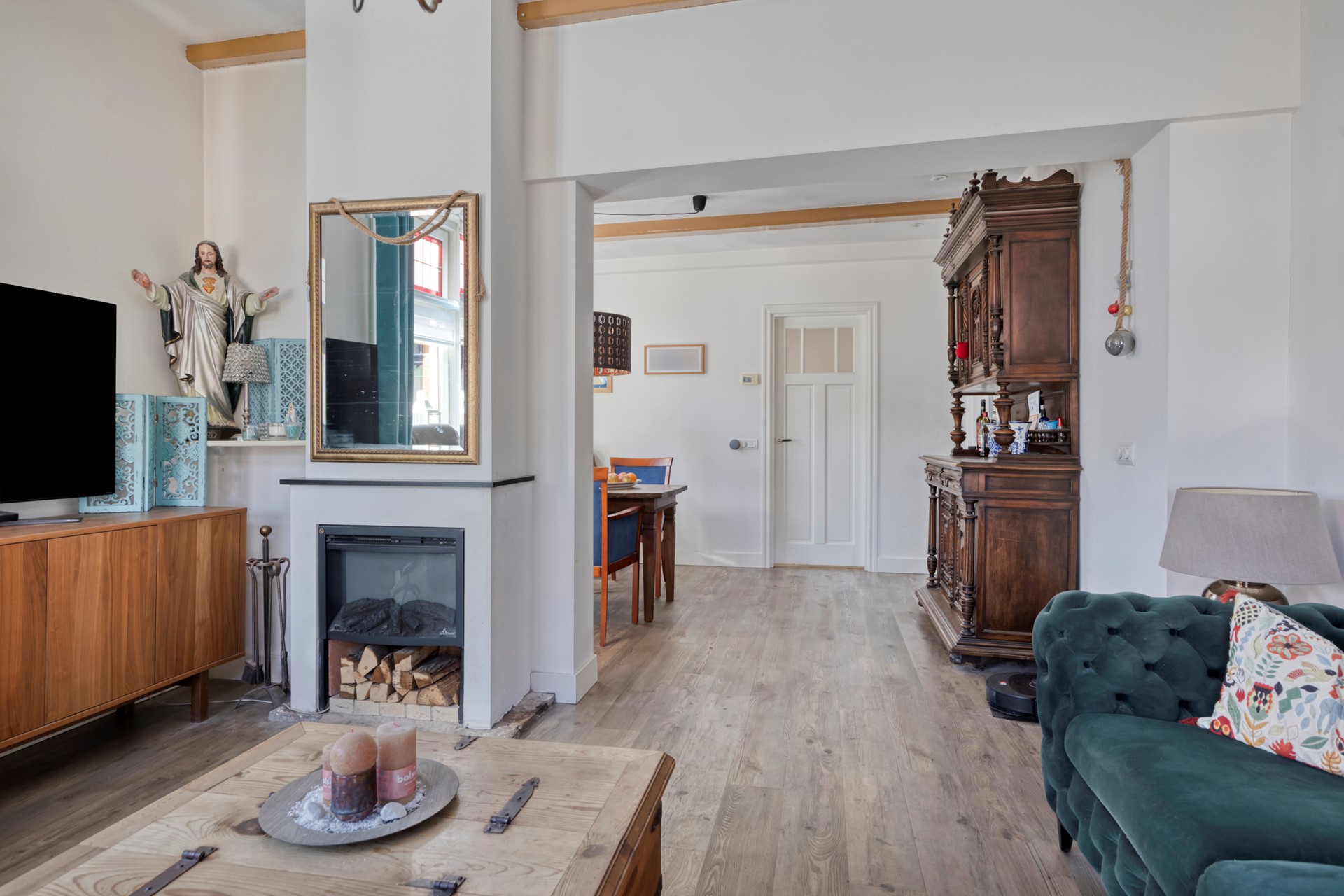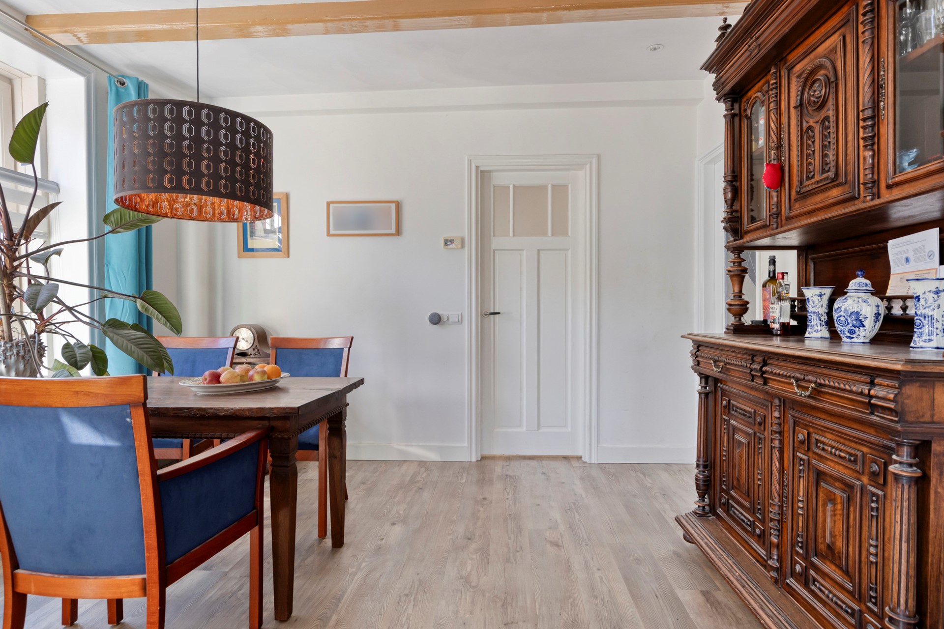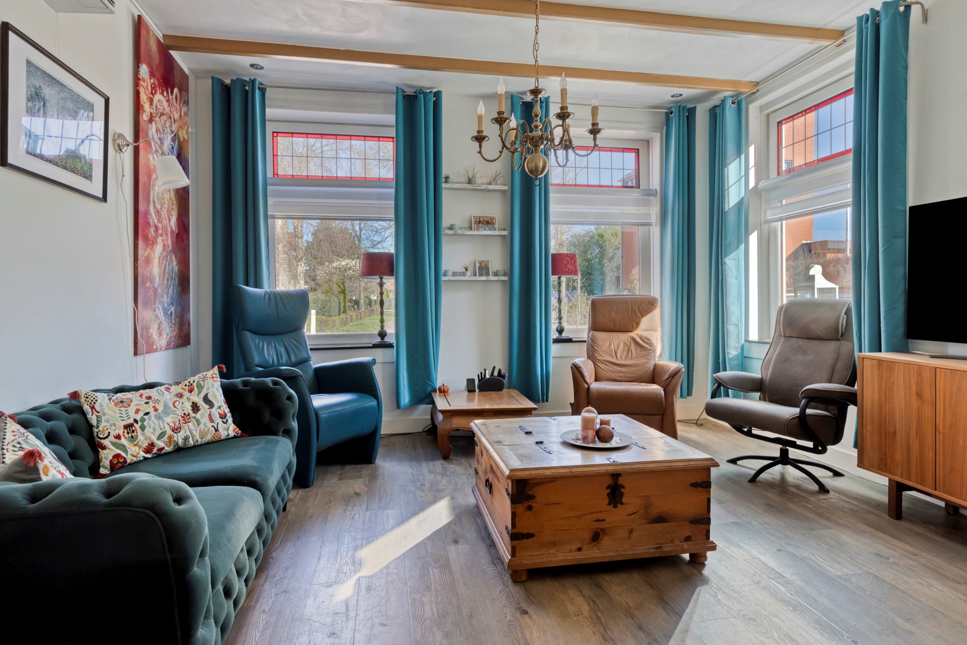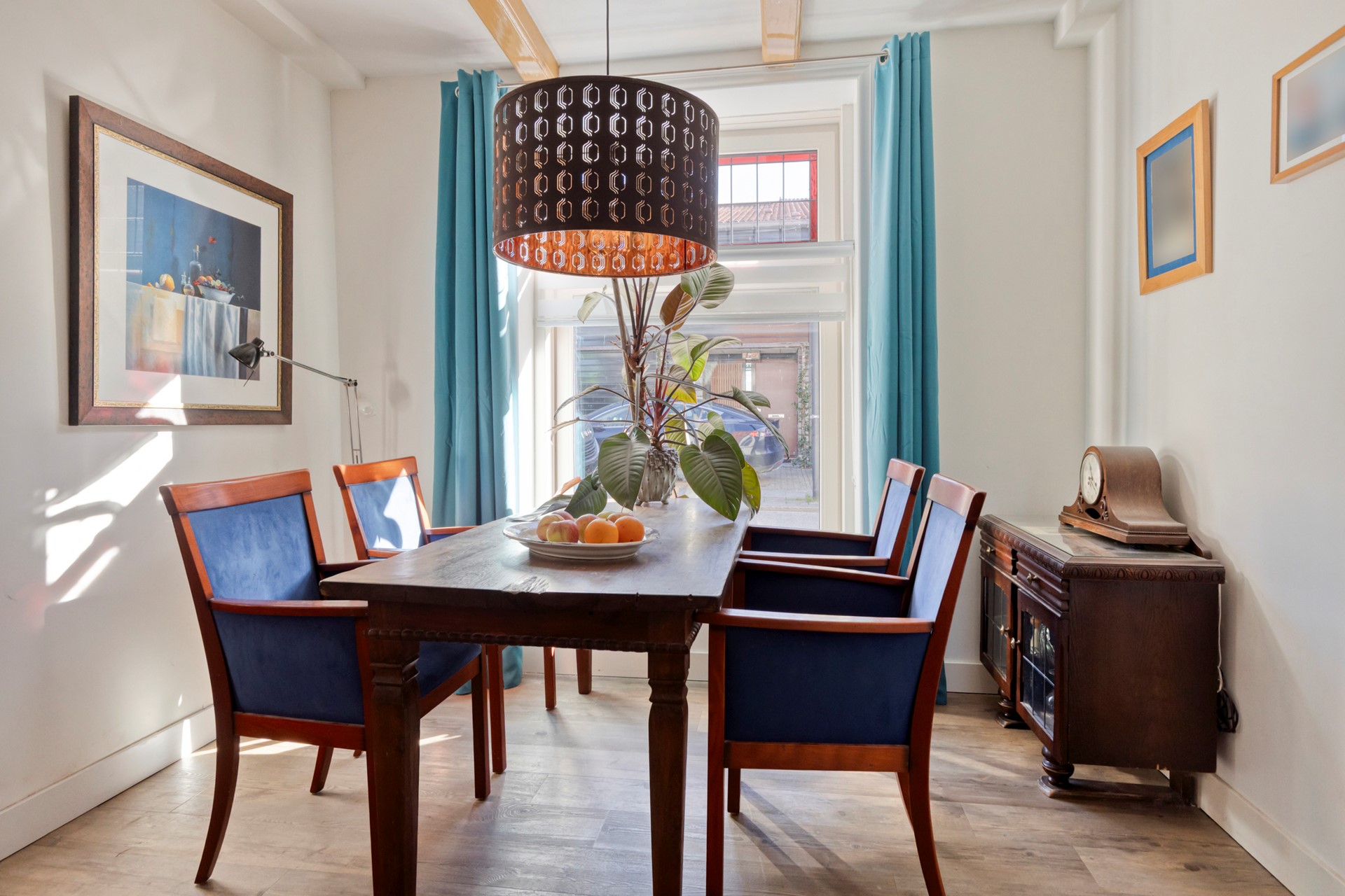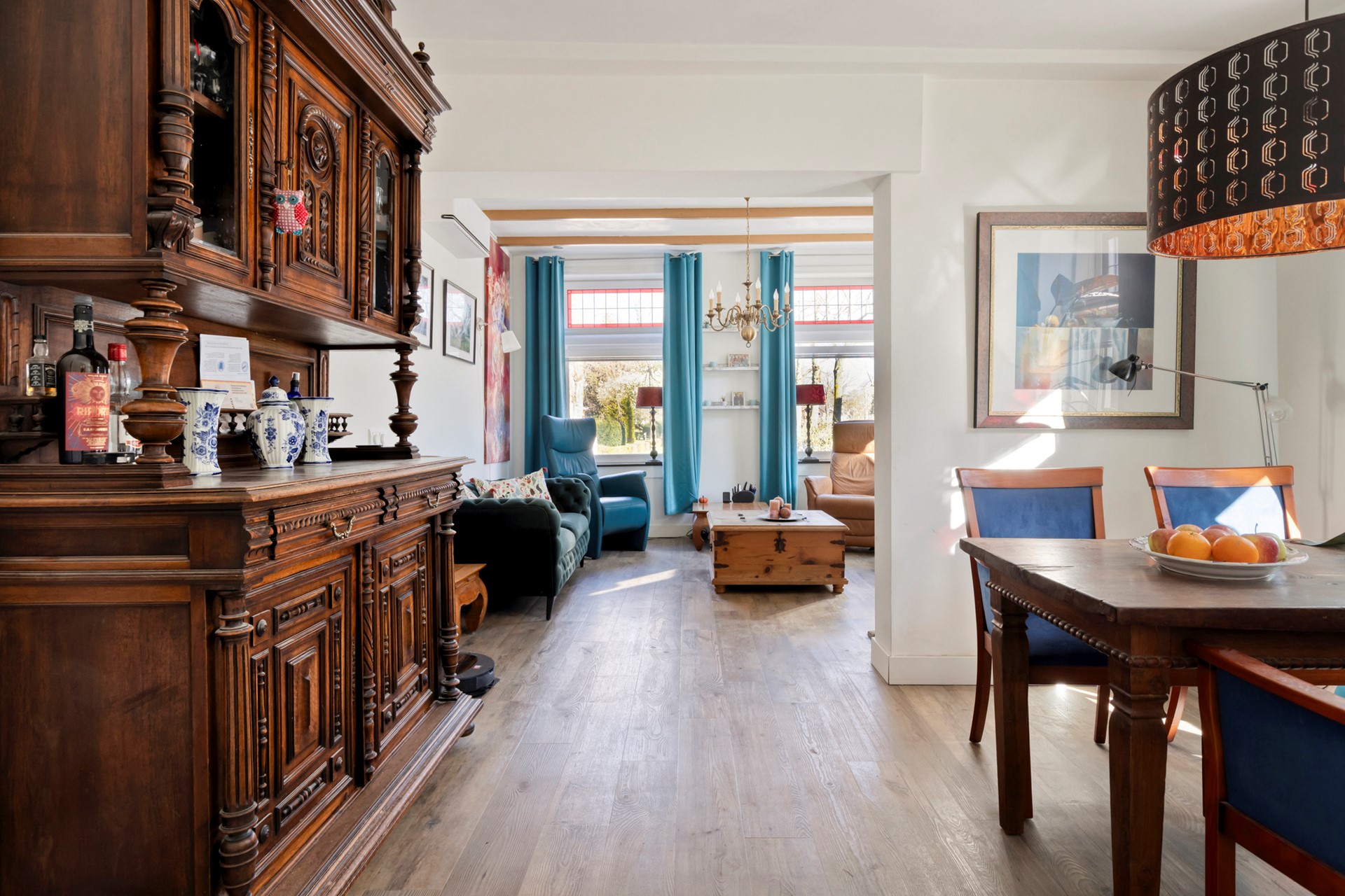 De woonkamer is ingedeeld in een royale eethoek en een lichte zithoek. Dankzij de ramen aan de voor- en zijkant valt er veel daglicht binnen, wat zorgt voor een aangename en open sfeer. De glas-in-lood bovenlichten in trippelglas geven de ruimte karakter en dragen bij aan de isolatie. De (led) open haard zorgt voor extra warmte en gezelligheid.