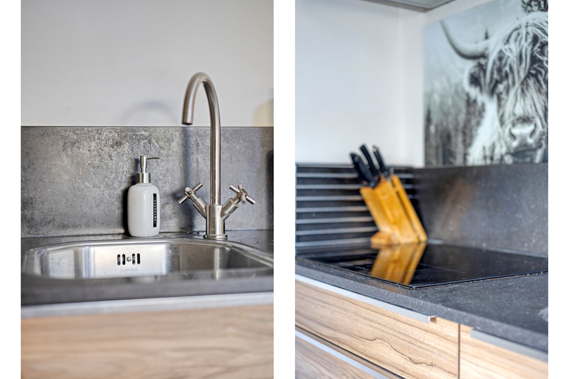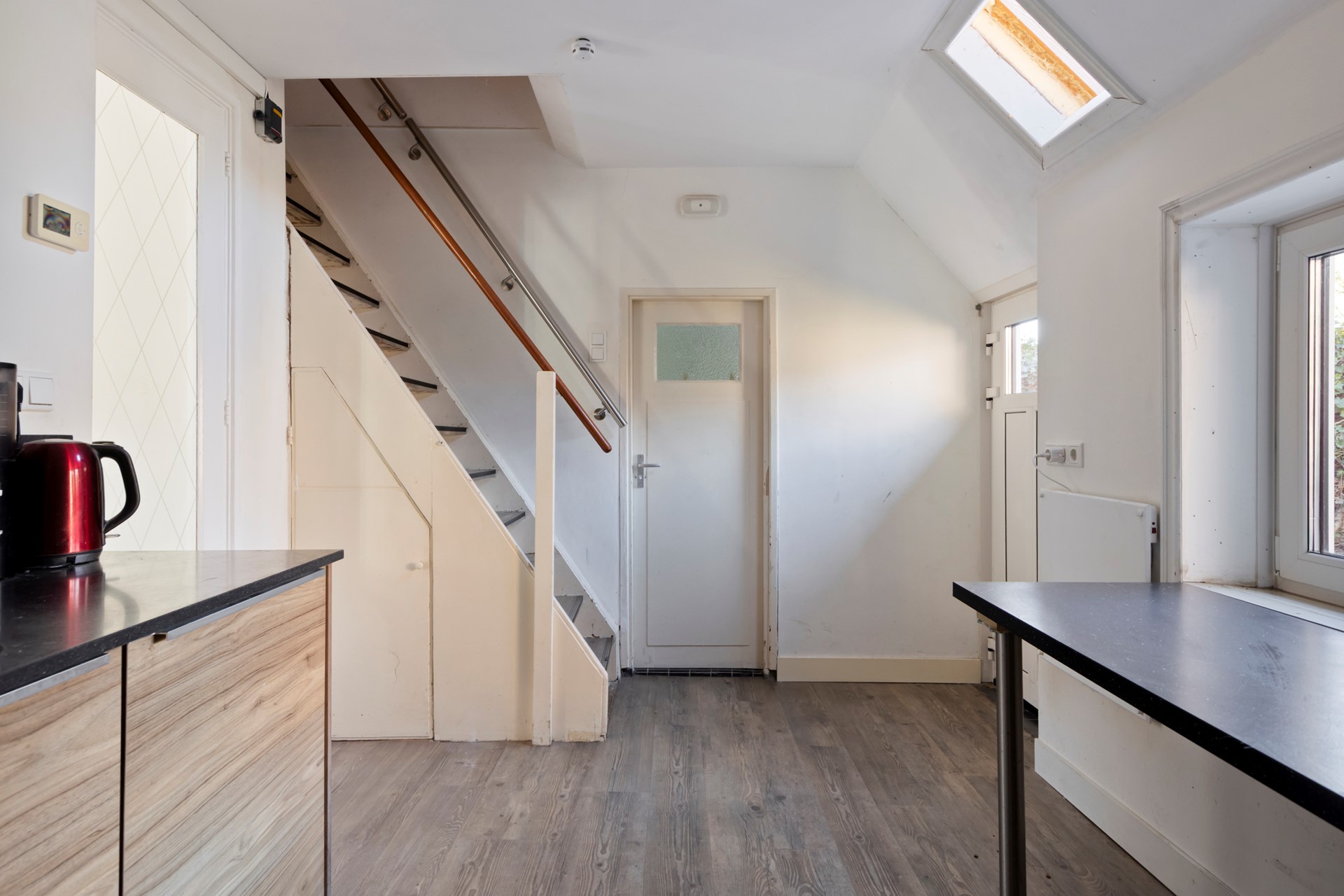 Vanuit de eetkamer bereik je de gesloten keuken. Deze is uitgerust met een combioven/magnetron, inductiekookplaat, afzuigkap en vaatwasser. Vanuit de keuken heb je toegang tot de trap naar de verdieping, de badkamer, de aangebouwde schuur en de achtertuin.