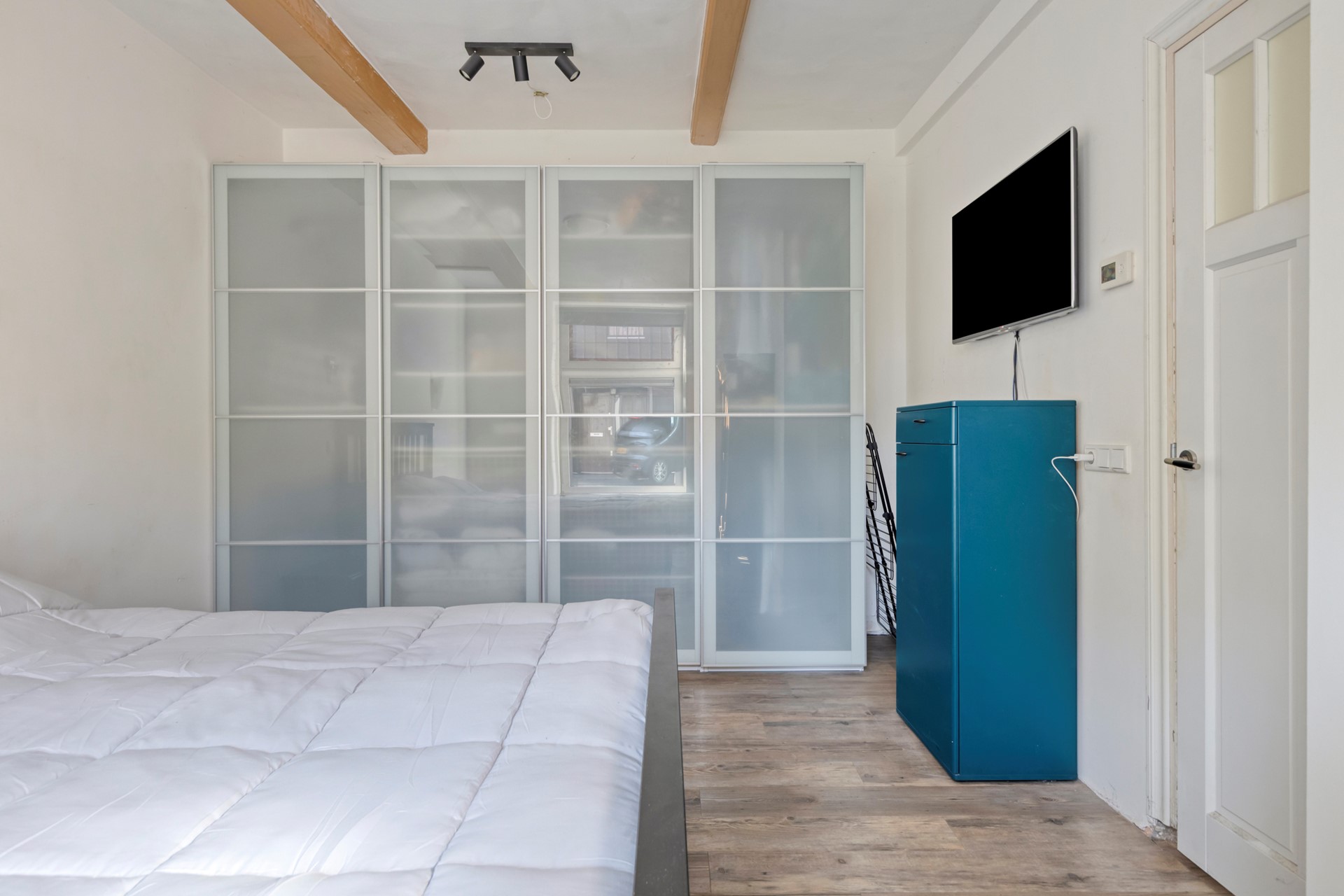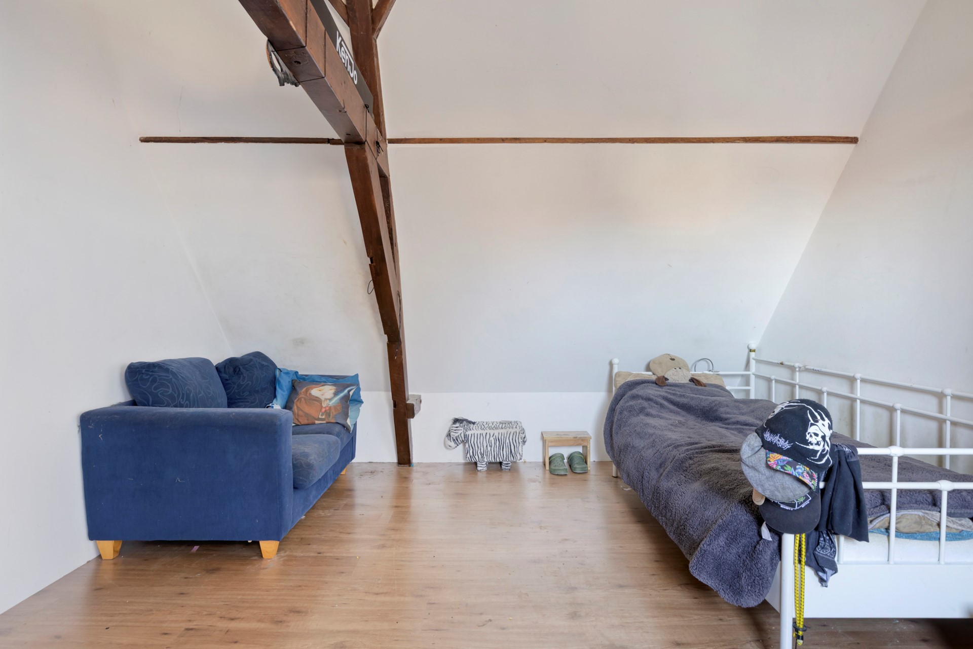 De slaapkamer op de begane grond ligt aan de voorzijde van de woning en is voorzien van een raam met authentieke glas-in-lood bovenlichten. Deze ruimte is ook uitstekend te gebruiken als werk- of hobbykamer.