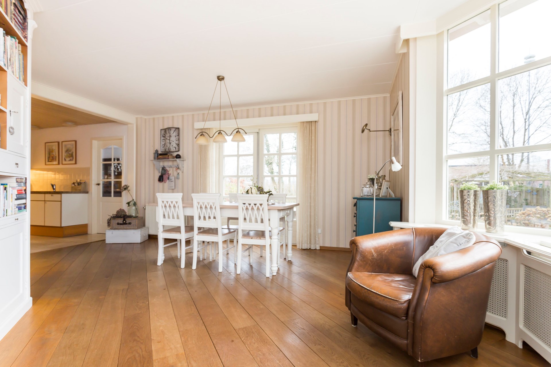 De woonkeuken is zowel vanuit de woonkamer als de bijkeuken bereikbaar en is ruim opgezet in een speelse L-indeling. De vloer bestaat deels uit hout en deels uit plavuizen. De keuken is uitgerust met een combimagnetron, inductiekookplaat, afzuigkap en vaatwasser. Het eetgedeelte van de keuken beschikt over openslaande deuren naar de tuin. De prachtige, aangebouwde erker aan de achterzijde van de woning geeft een ruimtelijk gevoel en bijzonder uitzicht op de tuin met terrassen en vijver.