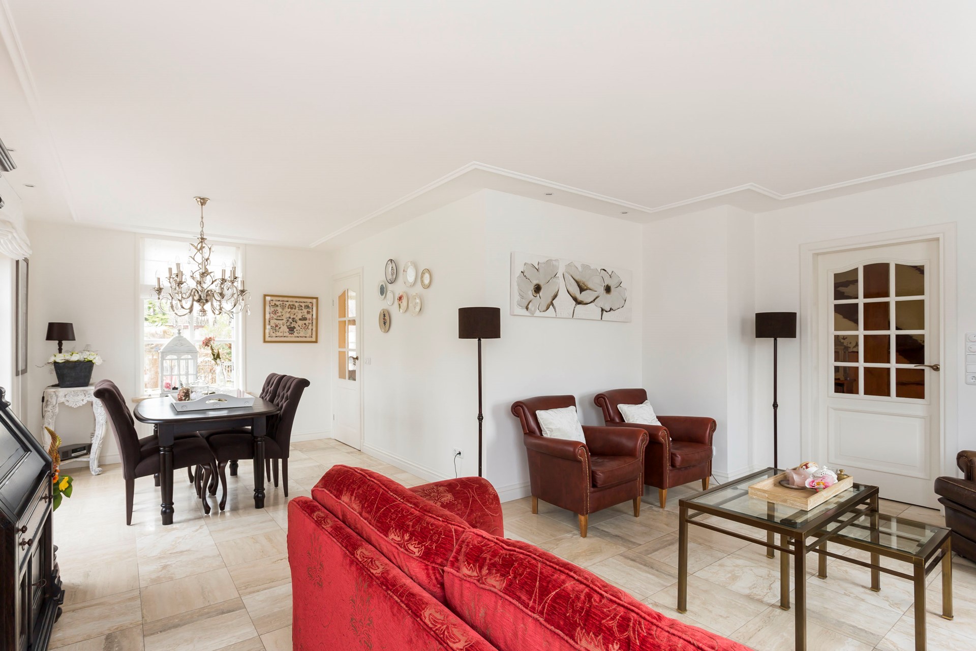 De L-vormige woonkamer is voorzien van vloerverwarming en een natuurstenen vloer. Aan de voorzijde bevindt zich een comfortabele zithoek. De eethoek aan de zijkant van de woonkamer heeft openslaande deuren naar de fraai aangelegde zijtuin. Dankzij de vele raampartijen aan drie zijden is de woonkamer aangenaam licht.
