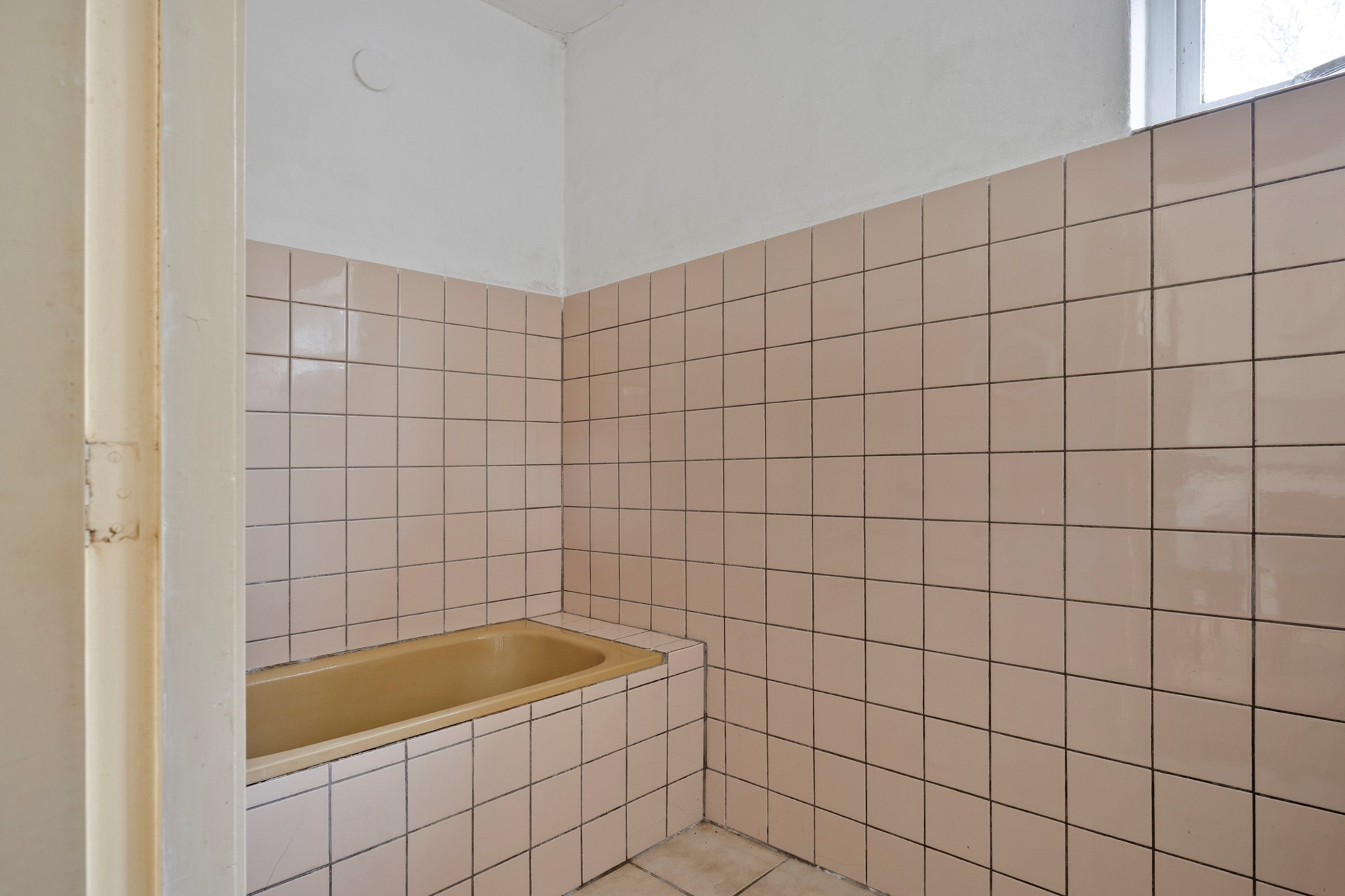 Op de begane grond bevinden zich twee slaapkamers en de badkamer. De badkamer is bereikbaar vanuit de keuken, is grotendeels betegeld en voorzien van een ligbad met douche. Twee bovenraampjes zorgen voor daglicht en natuurlijke ventilatie.