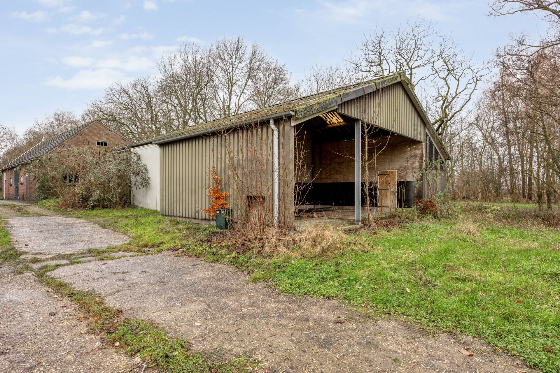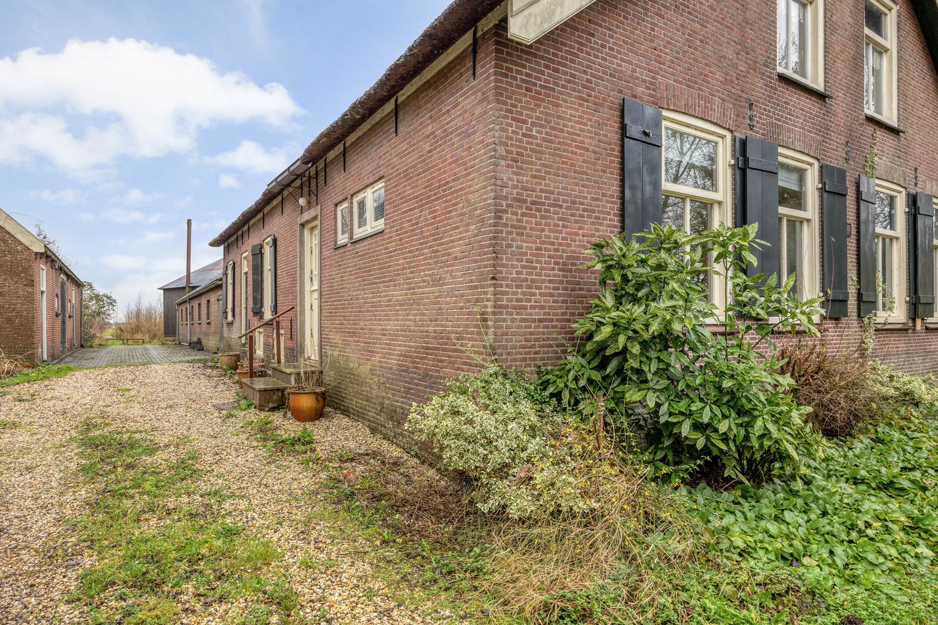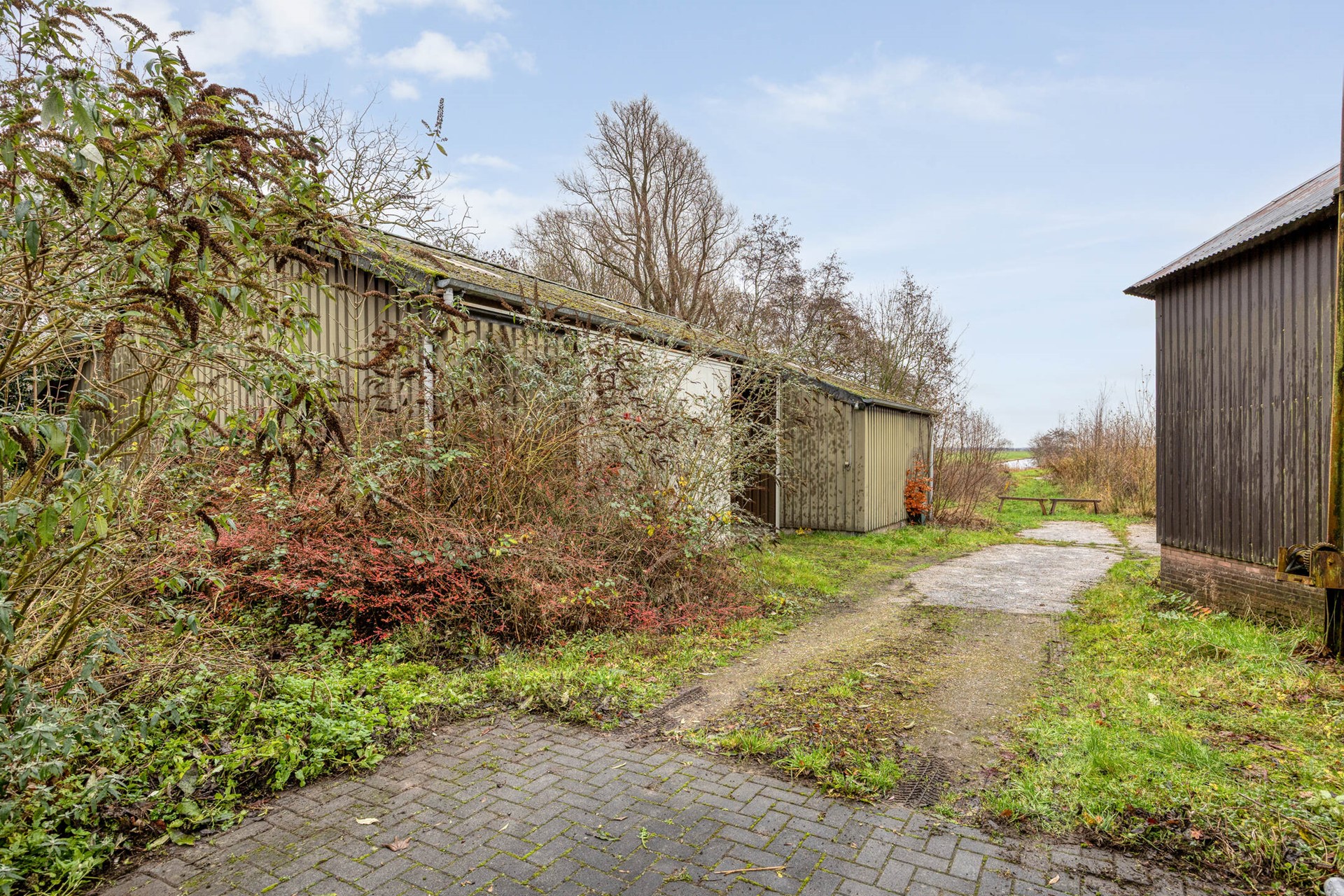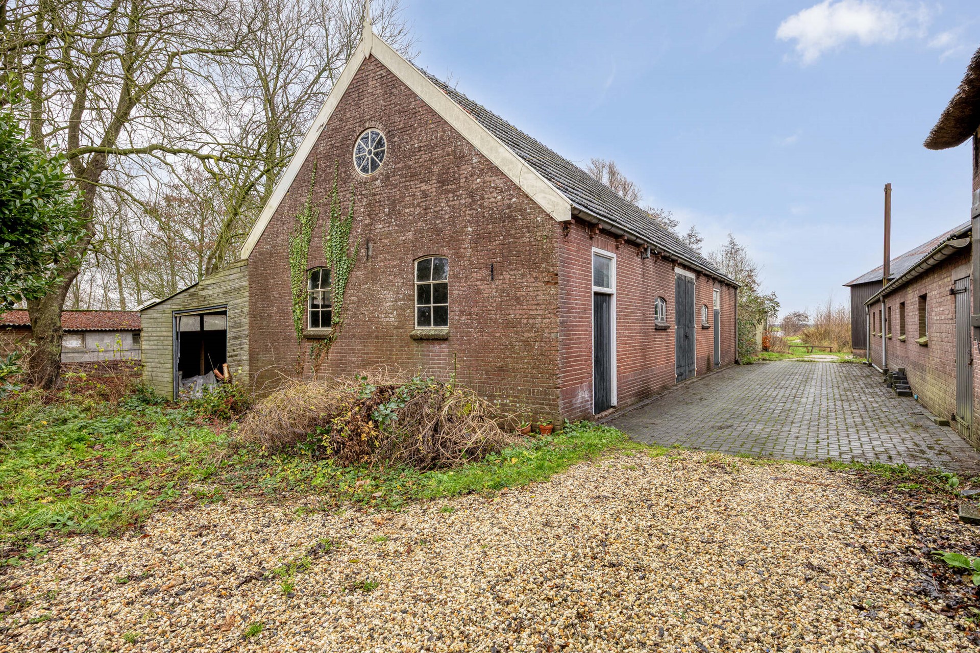 Op het achtererf bevinden zich meerdere bijgebouwen, waaronder een hooiberg die momenteel in gebruik is als parkeerplaats voor auto’s en/of fietsen. Daarnaast is er een grote schuur, verdeeld in drie afzonderlijke delen: een voormalige wagenloods, een open veestal en een aansluitende dichte veestal.