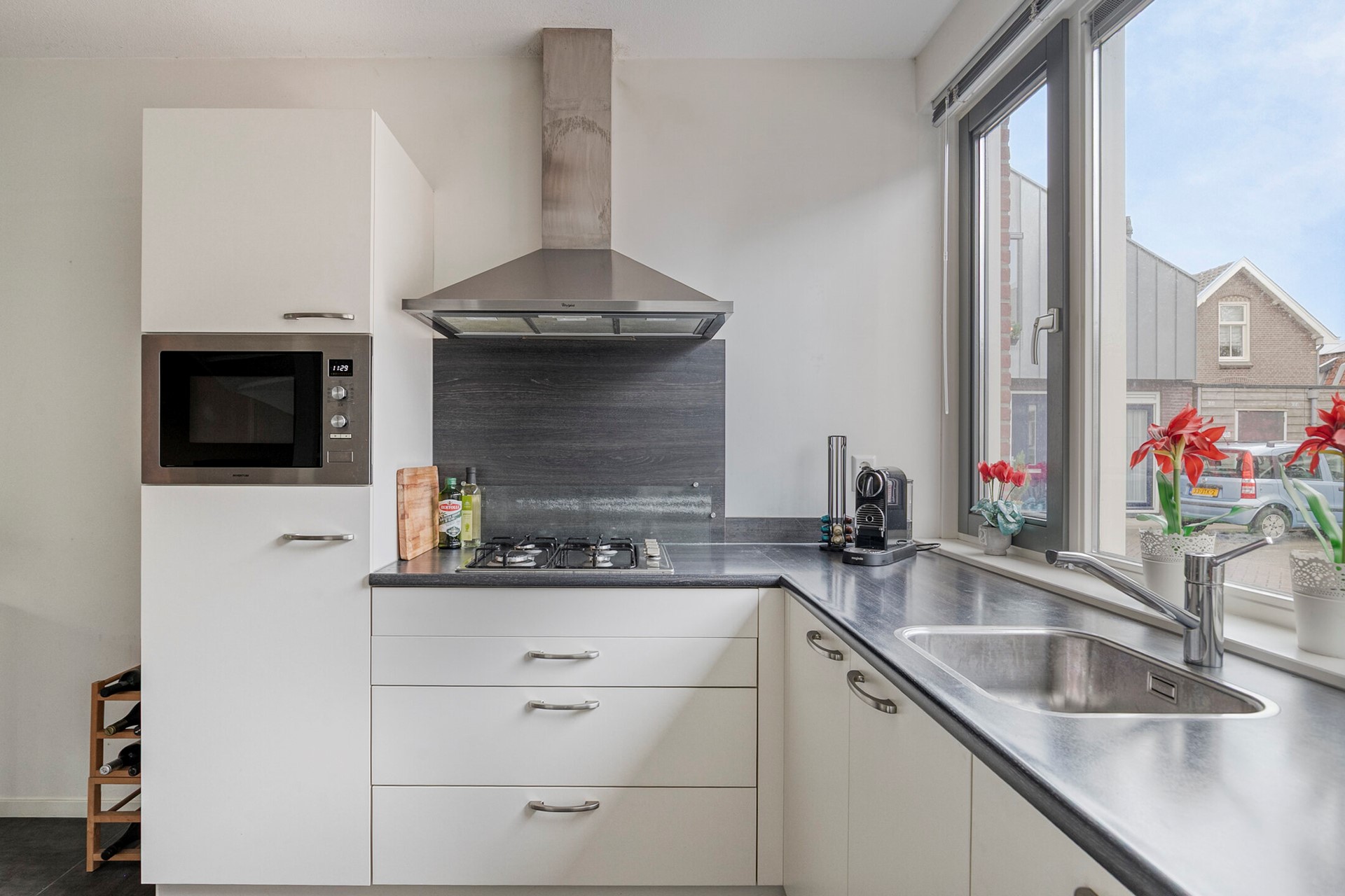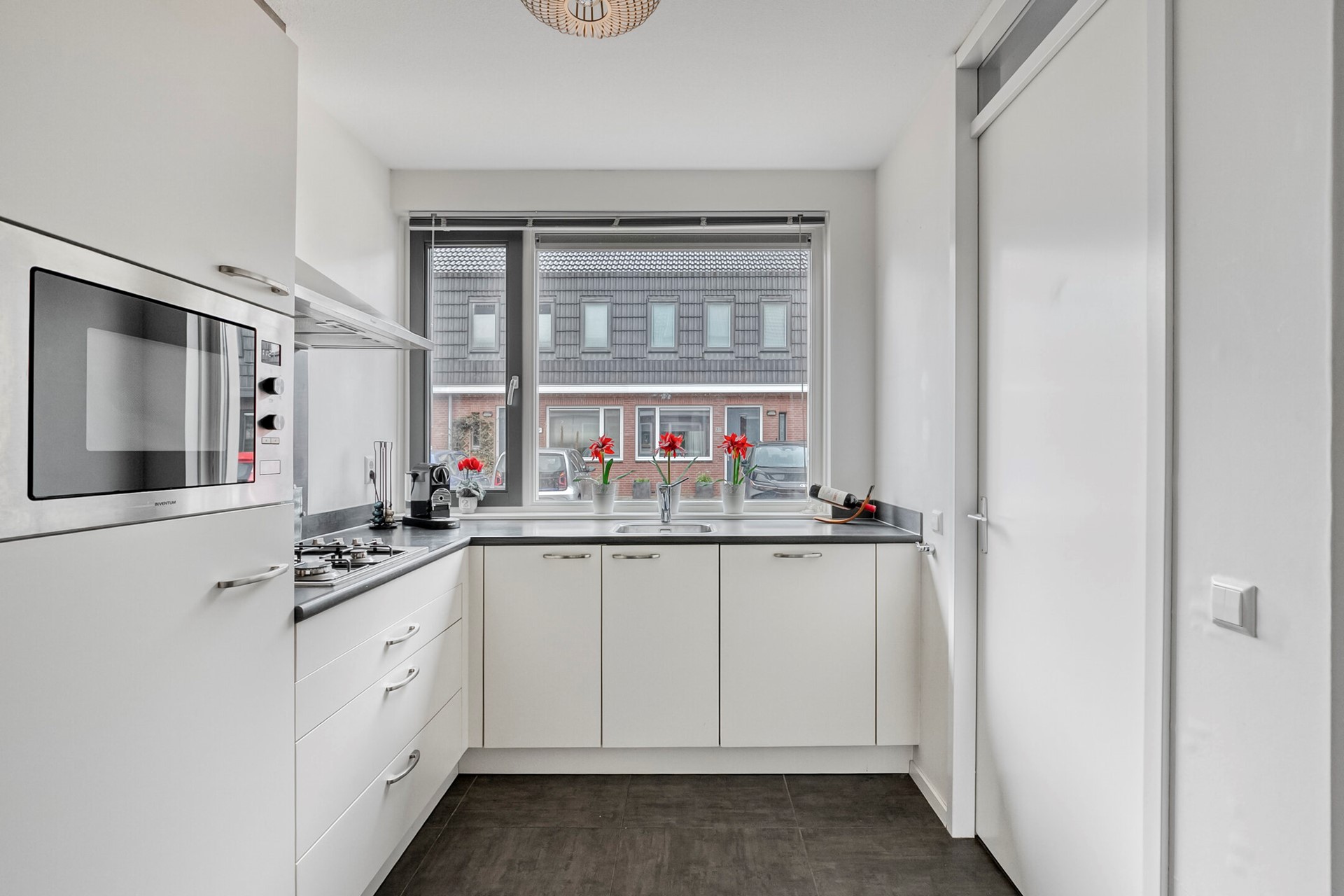 De open keuken bevindt zich aan de voorzijde van de woning en is uitgevoerd in een L-opstelling. De keuken is voorzien van diverse inbouwapparatuur, waaronder een 4-pits gaskookplaat, afzuigkap, vaatwasser, koelkast en combimagnetron (2020). Dankzij het grote raam aan de voorzijde is er volop natuurlijk daglicht en heeft u uitzicht op het woonhof.