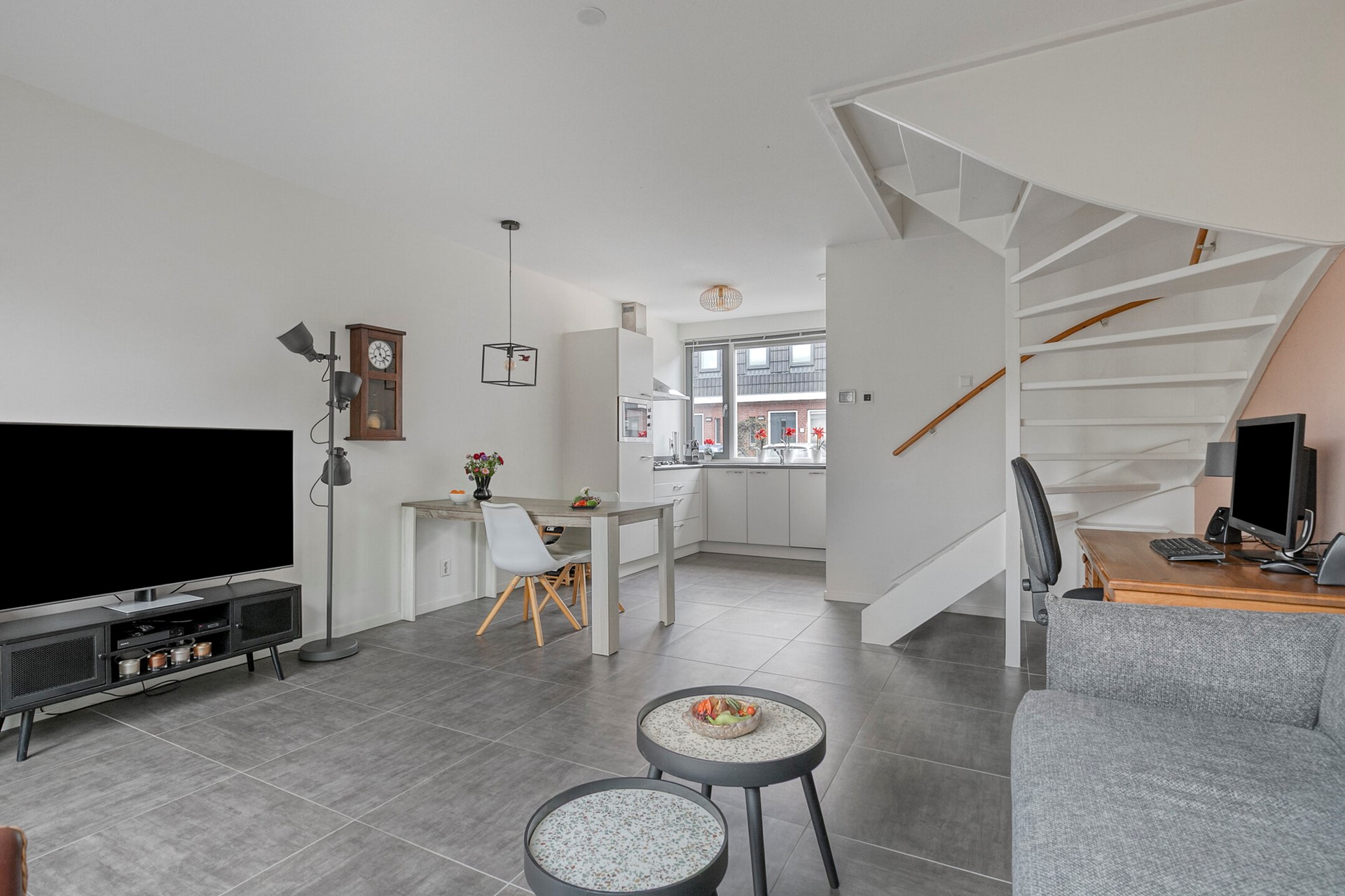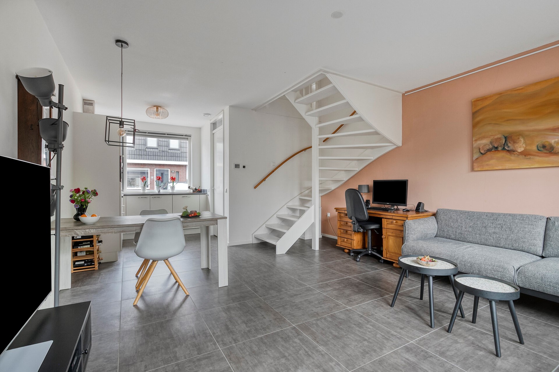 Grenzend aan de keuken is voldoende ruimte voor een royale eettafel. Aan de achterzijde bevindt zich de ruime zithoek, met een vrij uitzicht op de achtertuin, een heerlijke plek om te ontspannen. Via de openslaande deuren is de achtertuin bereikbaar, waardoor binnen en buiten op warme dagen naadloos in elkaar overlopen. In de woonkamer is tevens de vaste trap naar de verdieping aanwezig.