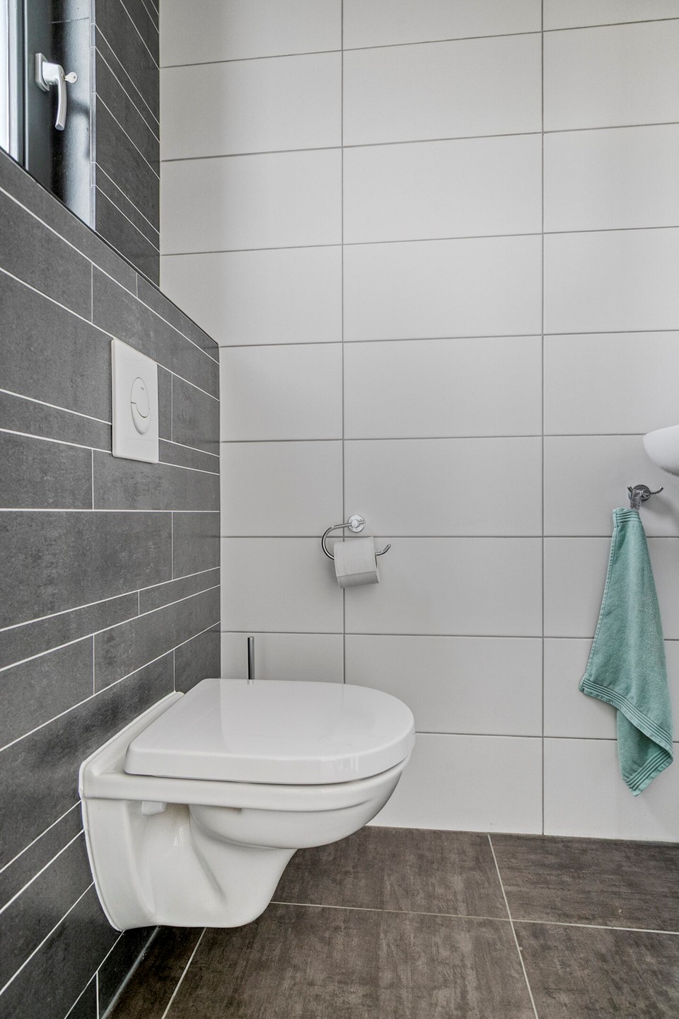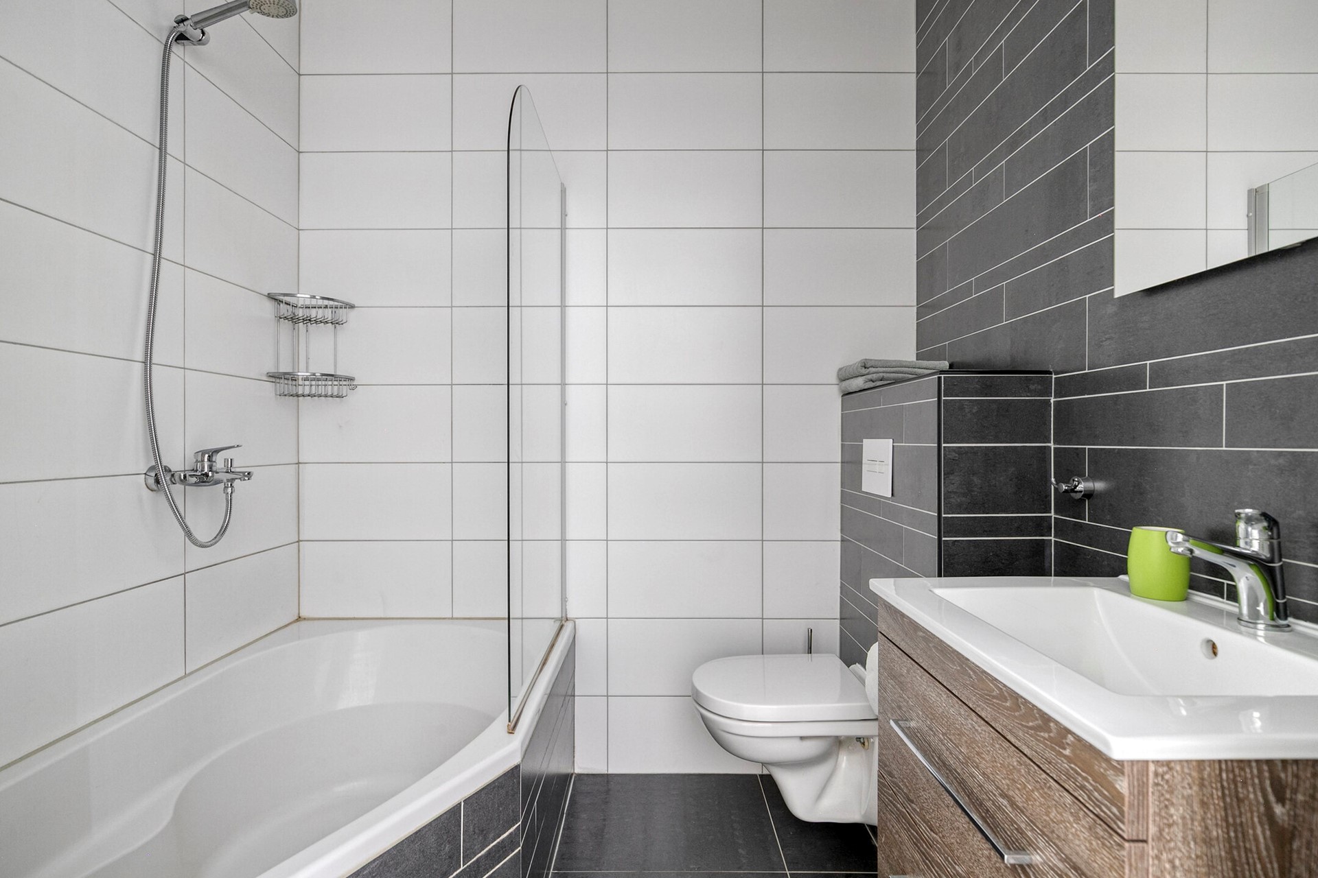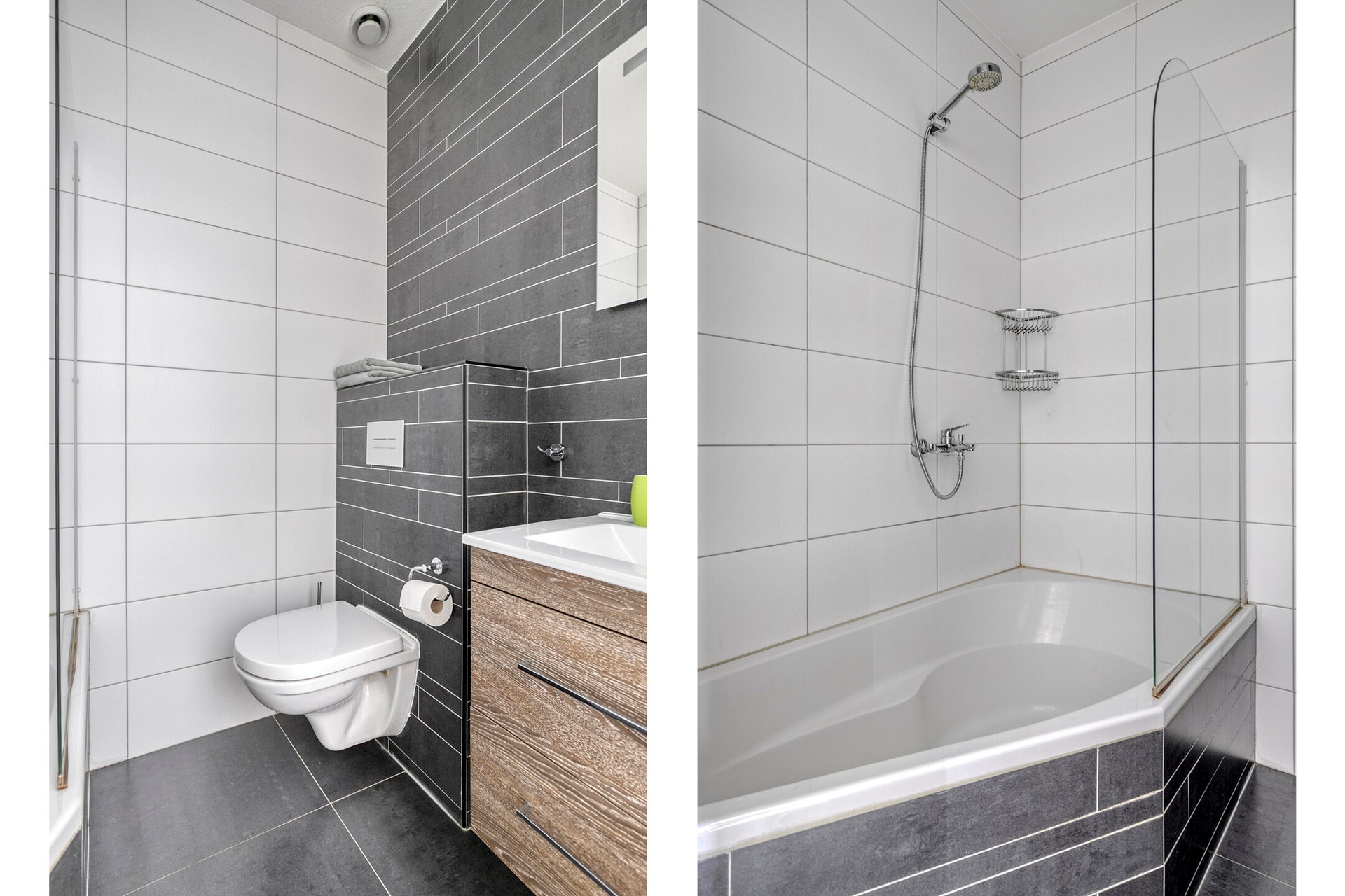 De volledig betegelde badkamer is centraal gelegen en voorzien van een ligbad met douche, een inbouwtoilet, een wastafelmeubel met wastafel en een designradiator. Alle accessoires zijn inclusief. Daarnaast is vloerverwarming aanwezig voor extra comfort.