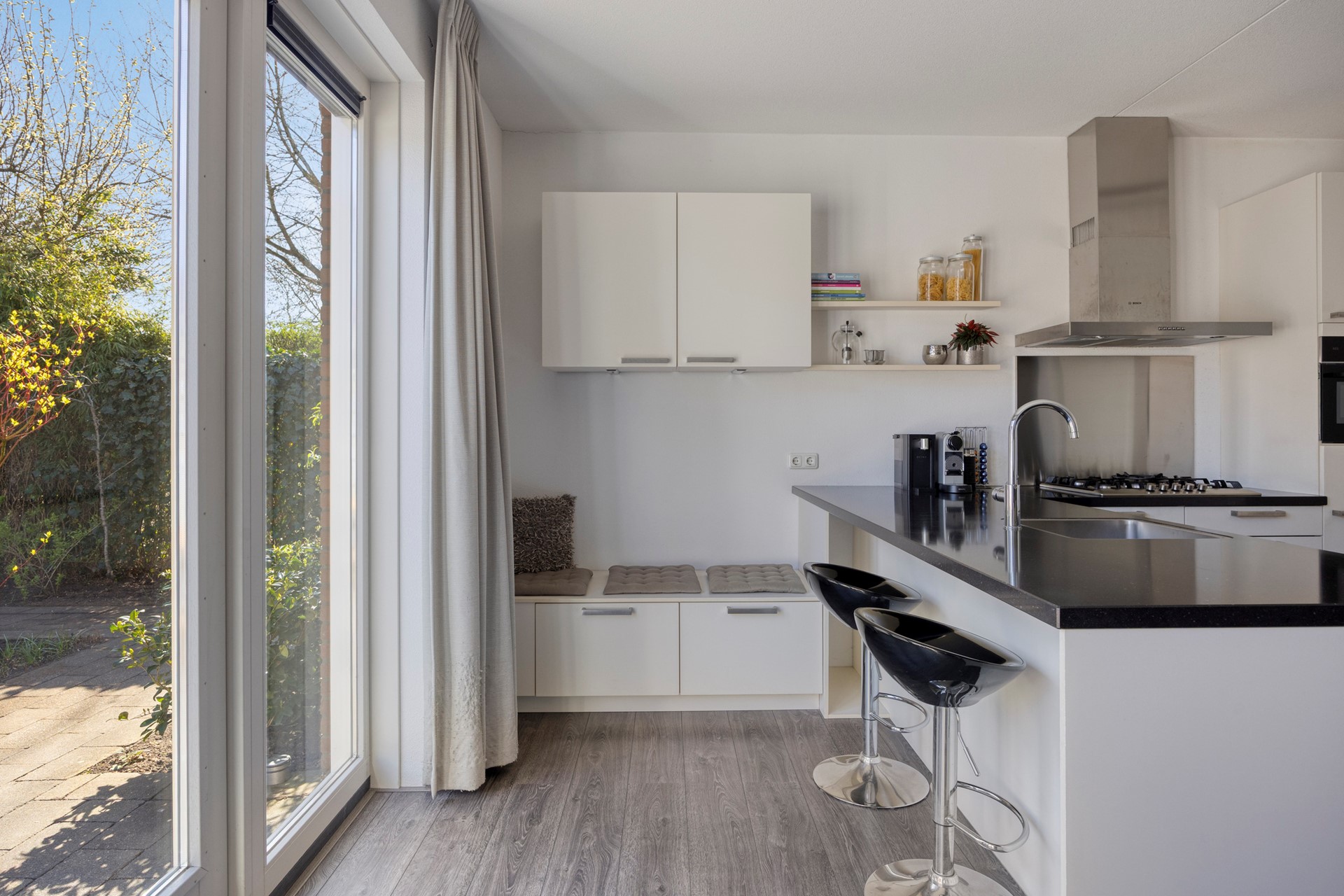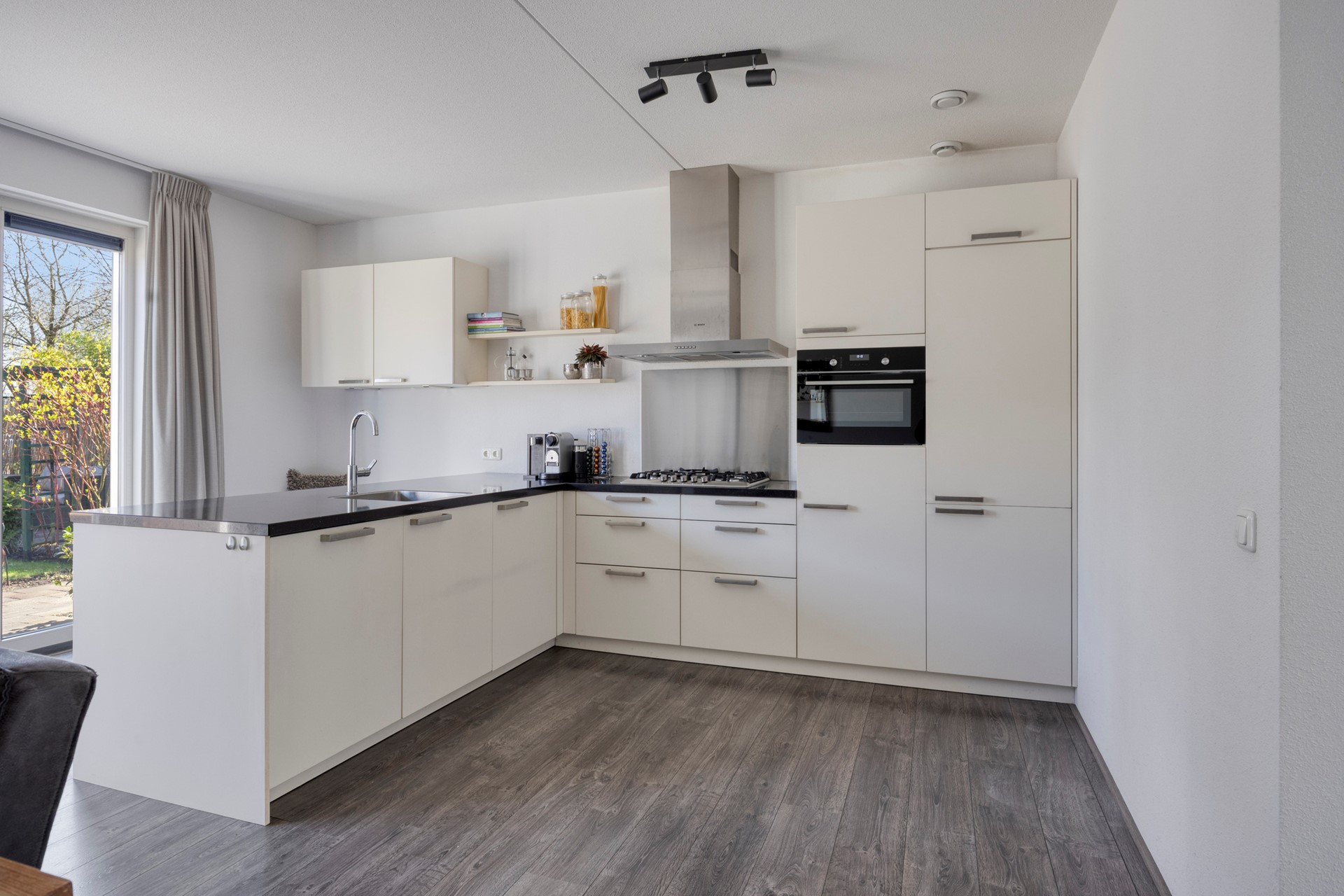 In het midden van de woning bevindt zich de trapopgang met praktische trapkast. De echte eyecatcher ligt aan de achterzijde: de ruime leefkeuken. Deze moderne keuken is uitgevoerd in een rechte opstelling met een schiereiland en voorzien van diverse inbouwapparatuur, waaronder een koelkast, vriezer, oven (2025), gaskookplaat, afzuigkap en vaatwasser. Hier kook je met plezier én sta je altijd in contact met je gezelschap. Er is volop ruimte voor een grote eettafel en een gezellige bar aan het schiereiland. Via de openslaande deuren loop je zo de zonnige achtertuin in.