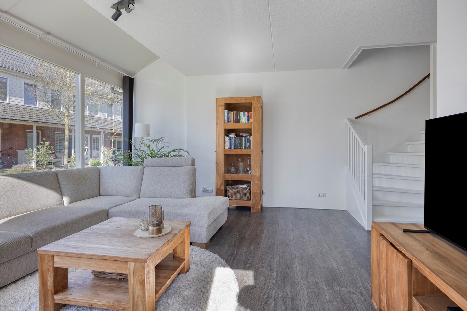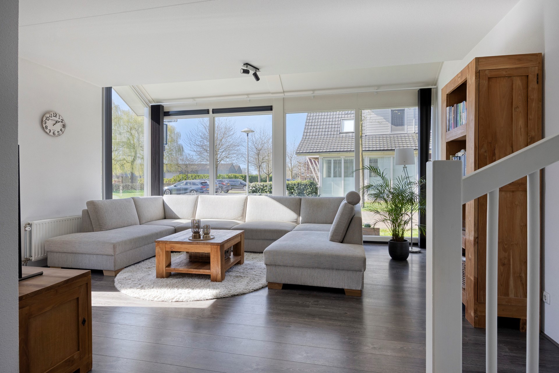 Aan de voorzijde is voldoende plaats om een royale zithoek te plaatsen, waar het daglicht rijkelijk naar binnen valt.