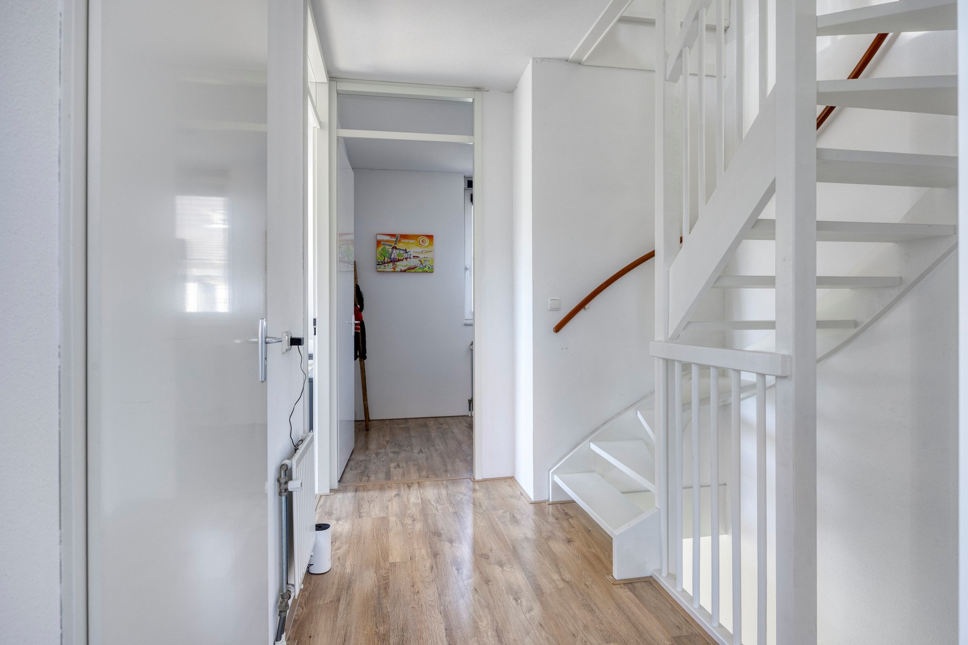 Je parkeert je auto op een van de openbare parkeerplekken in de straat en loopt vervolgens naar de voordeur. Je komt binnen in het hart van de woning, in een nette en ruime hal met toilet (met fontein) en meterkast. Vanuit hier stap je de lichte en sfeervolle woonkamer binnen.