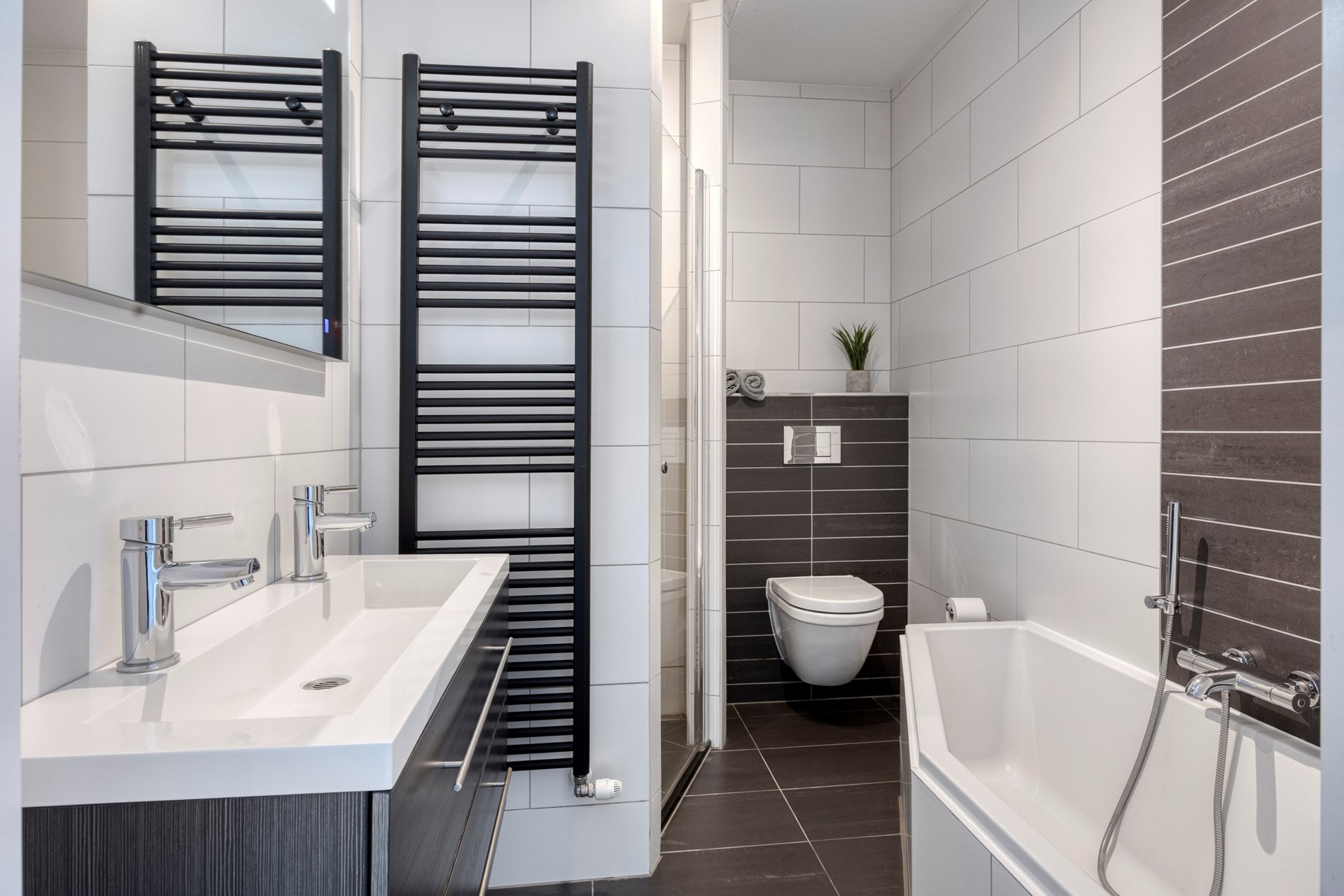 De badkamer ligt centraal en is van alle gemakken voorzien, waaronder een ligbad, douche, dubbele wastafel en toilet.