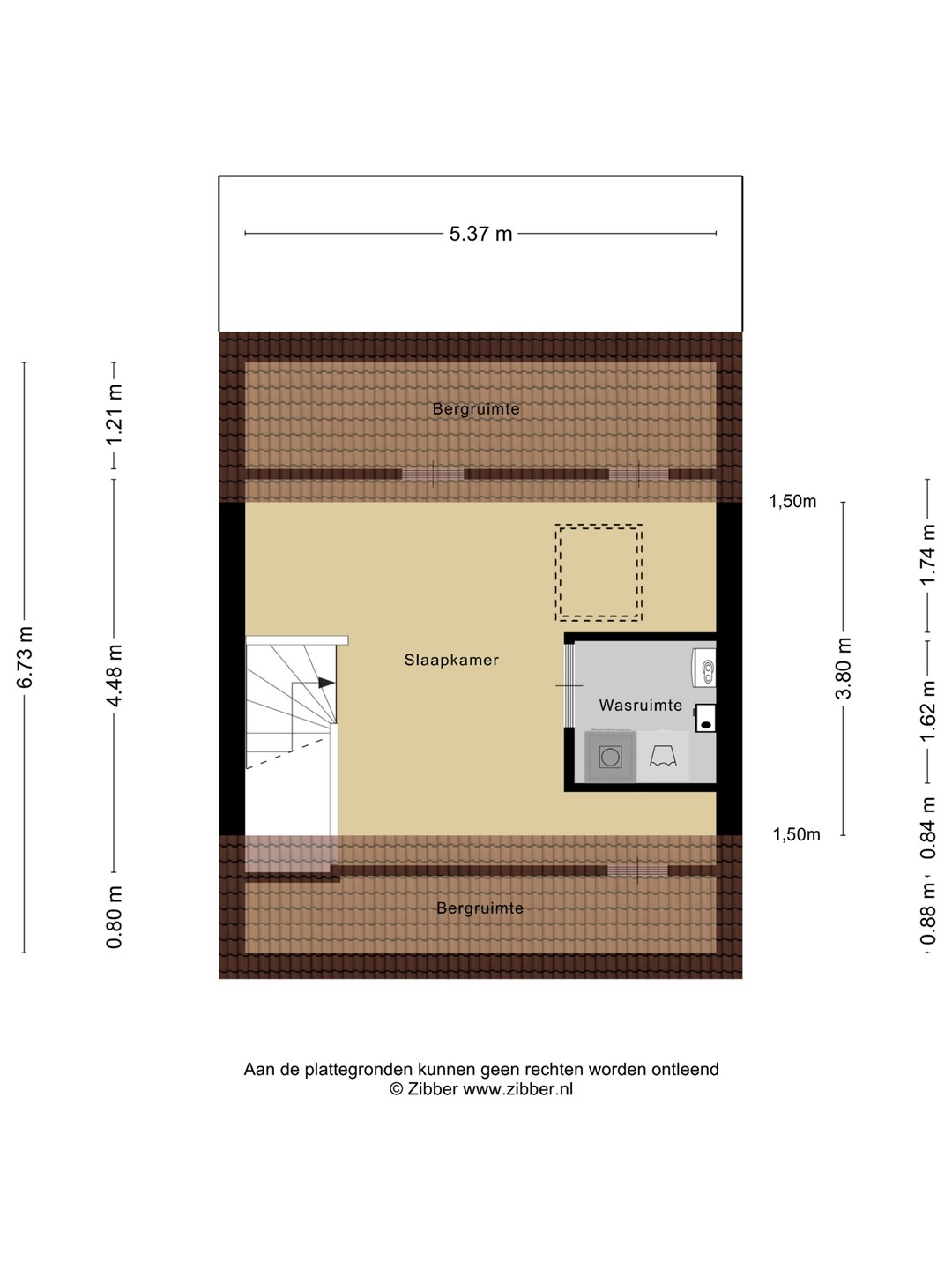 De tweede verdieping biedt een verrassend ruime open zolder met volop mogelijkheden. Hier vind je tevens een aparte wasruimte met de opstelplaats voor de cv-installatie en mechanische ventilatie. Achter de knieschotten is extra bergruimte aanwezig.