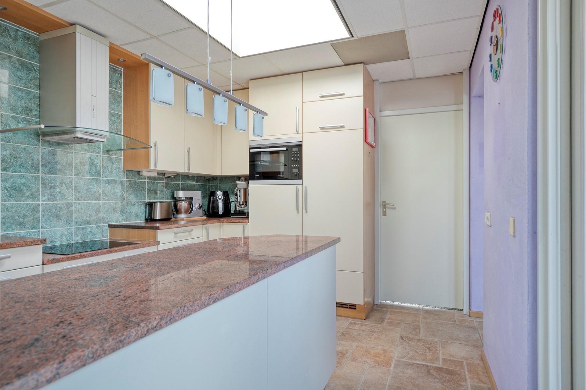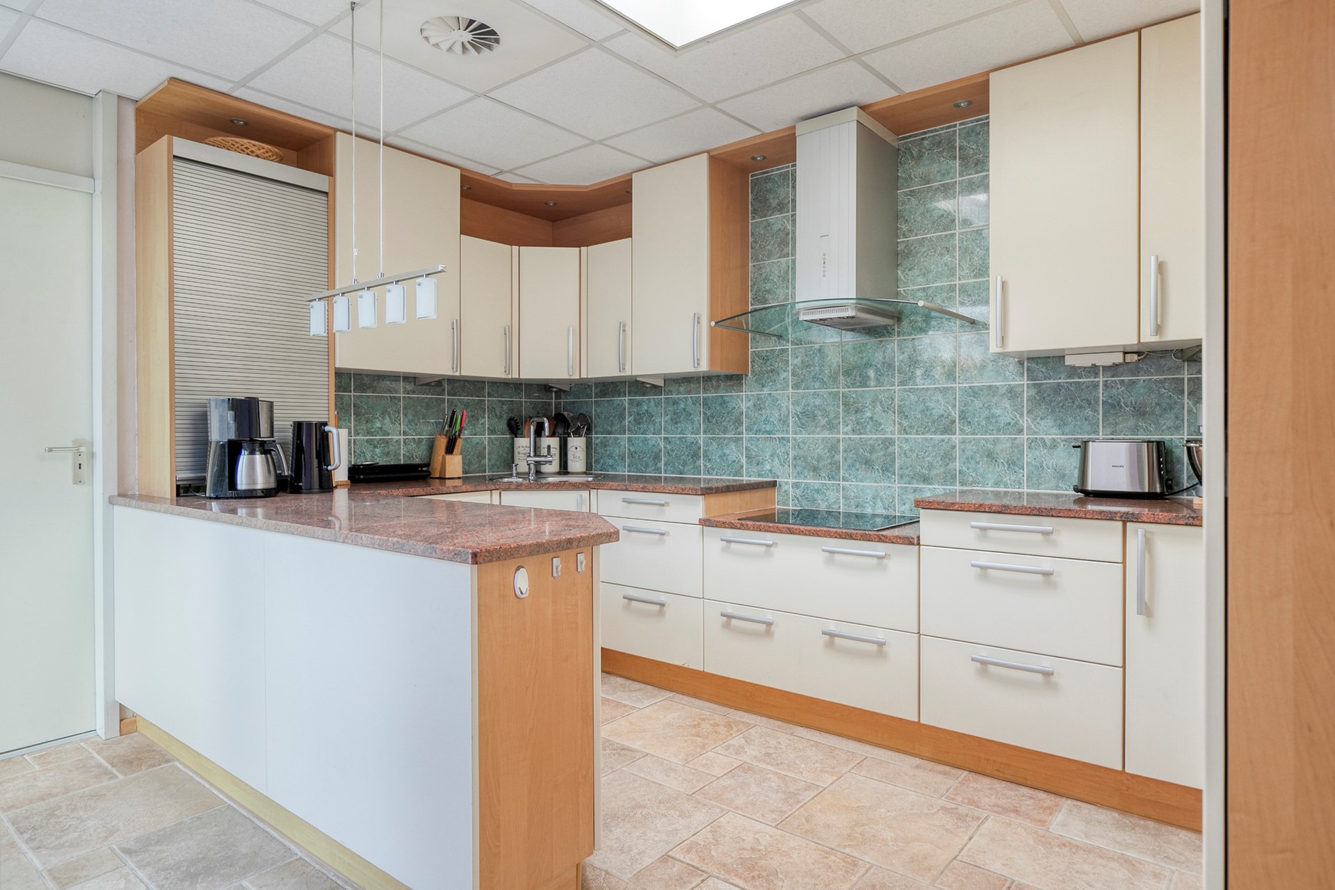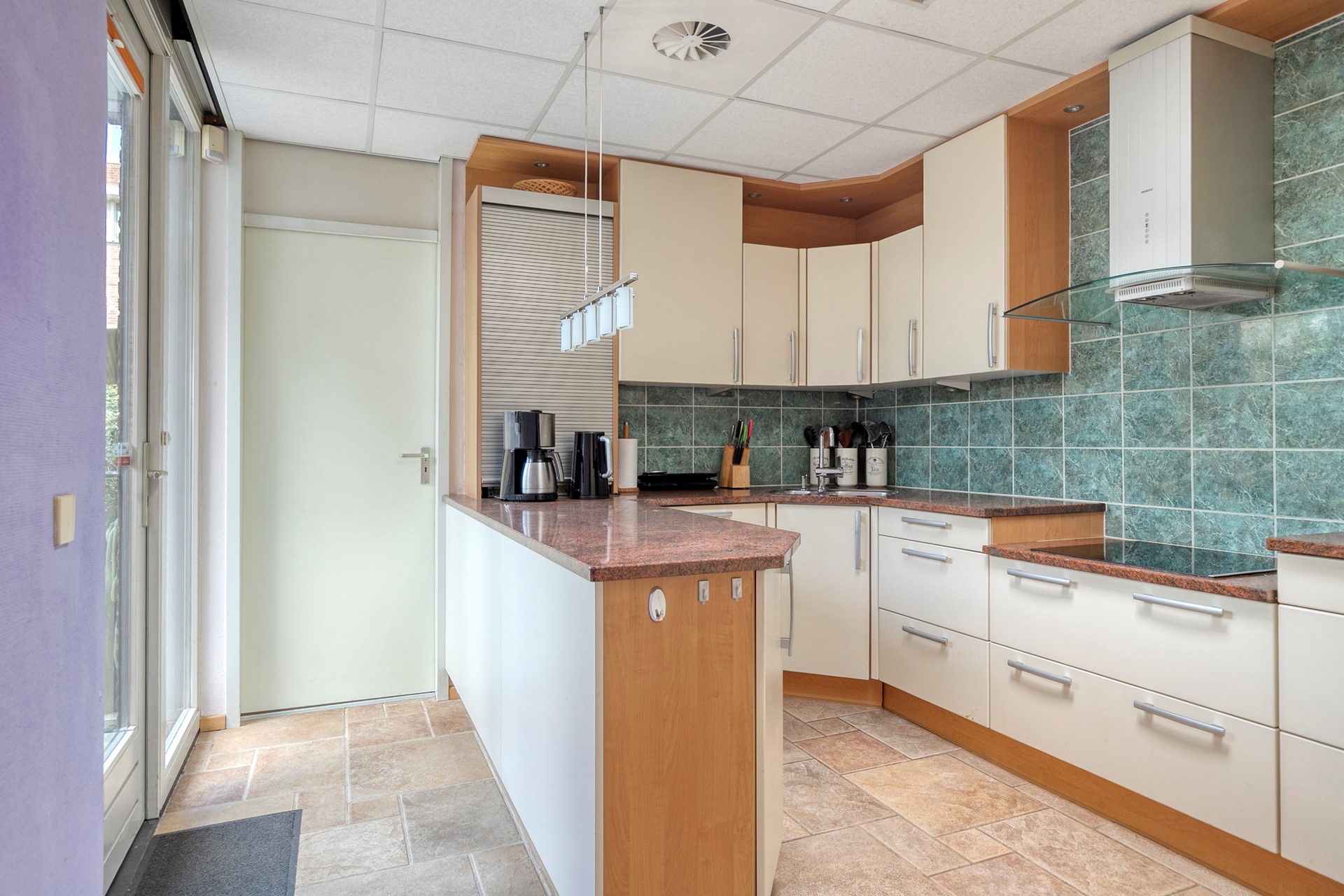 De keuken in U-opstelling is van alle gemakken voorzien, met onder andere oven, inductiekookplaat, afzuigkap, koelkast, vriezer en vaatwasser. Dankzij de lichtkoepel en directe toegang tot de achtertuin is er veel daglicht en een prettige verbinding met de eetkamer.