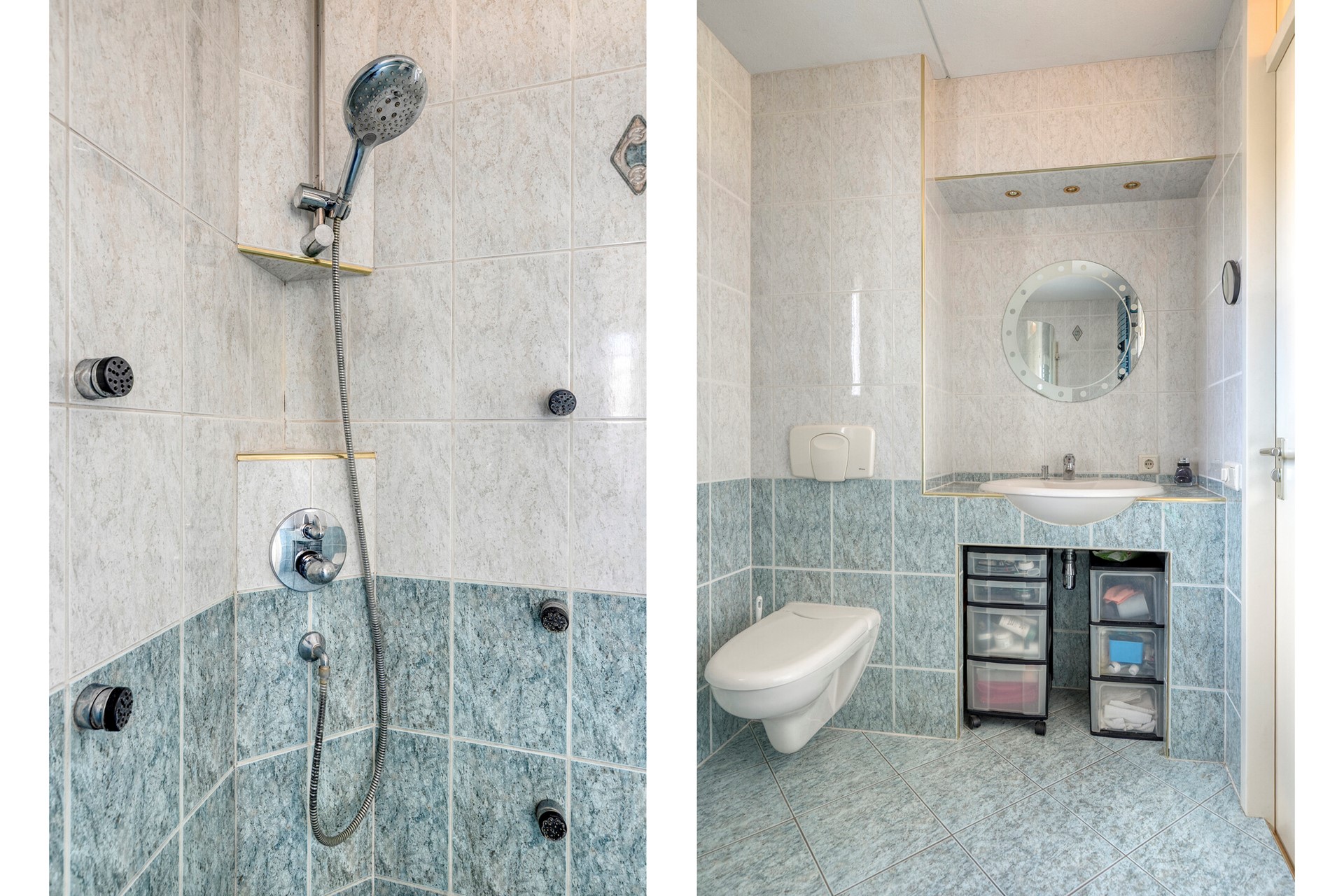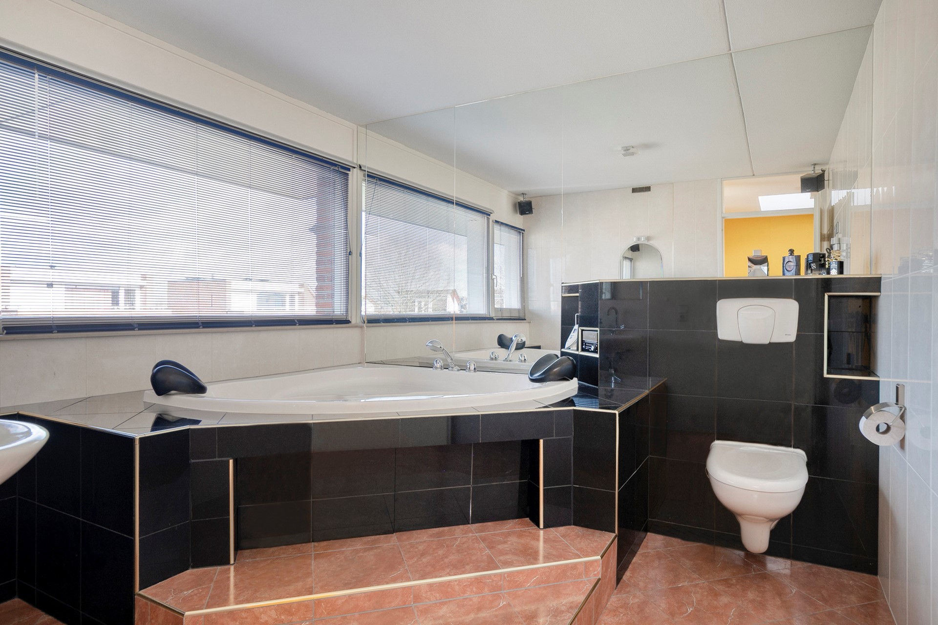Daarnaast is er een tweede badkamer met wastafel, hangend toilet en luxe tweepersoons whirlpool. De wasruimte biedt aansluitingen voor wasmachine en droger en huisvest de cv-ketel, mechanische ventilatie en omvormer voor de zonnepanelen. Boven het trapgat is een extra lichtkoepel geplaatst, die zorgt voor veel daglicht in de overloop en tevens toegang biedt tot het dak.