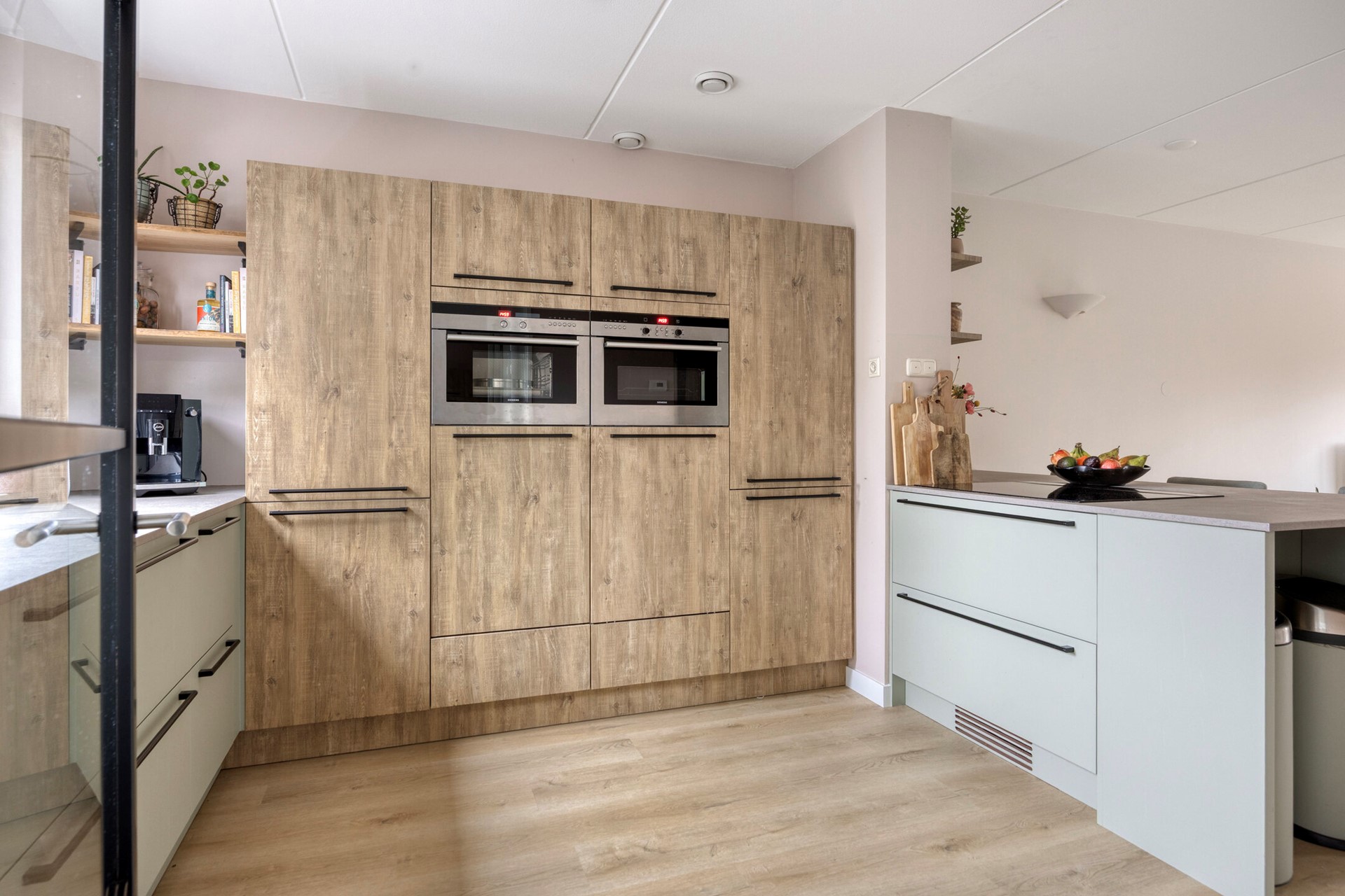 De moderne keuken combineert stijl met functionaliteit en biedt uitzonderlijk veel kast- en laderuimte. De ruimte is uitgerust met een royale mengkraan en spoelbak, een koel-vriescombinatie, vaatwasmachine, oven-magnetron en stoomoven. Het schiereiland met bar vormt het hart van de keuken en verbindt de ruimte op een natuurlijke manier met de woonkamer. Het beschikt over een inductiekookplaat met glazen spatblad en een recirculerende ingebouwde afzuiginstallatie. Bovendien is de keuken sfeervol ingericht, heeft ze uitzicht op de voorzijde en zorgen twee grote ramen voor een fijne natuurlijke lichtinval. Kortom: een eigentijdse, complete leefkeuken met alle comfort en apparatuur die u zich kunt wensen.