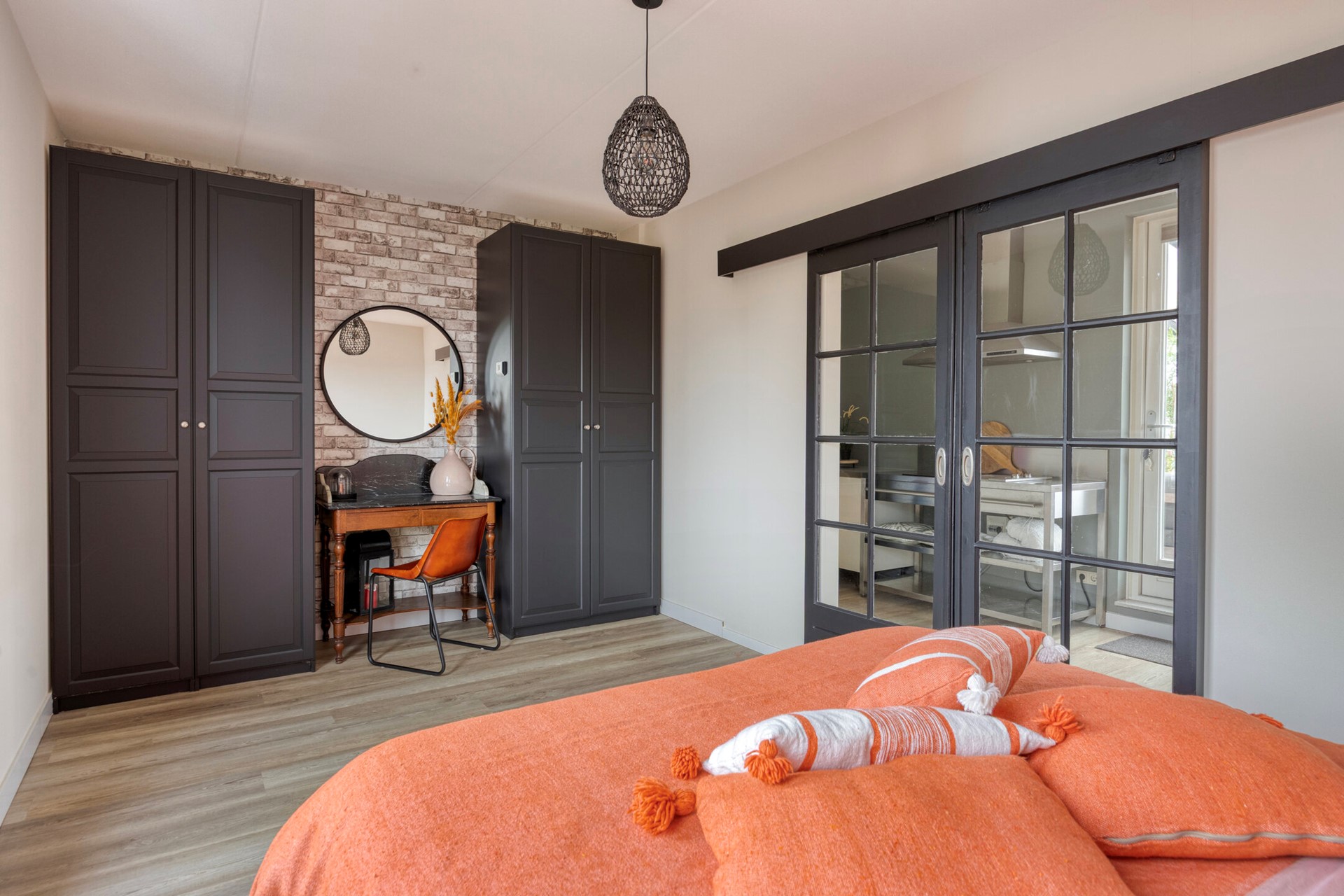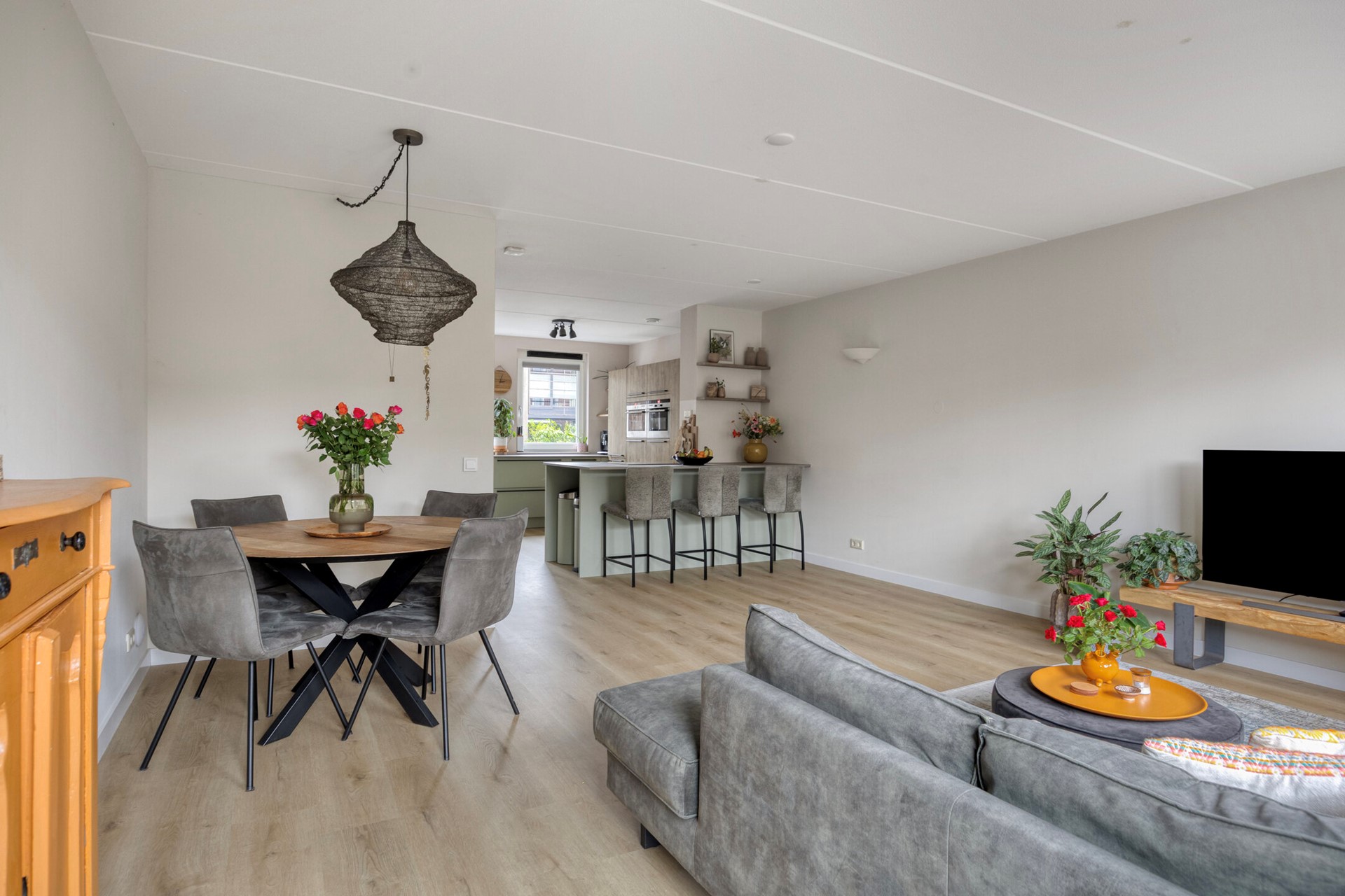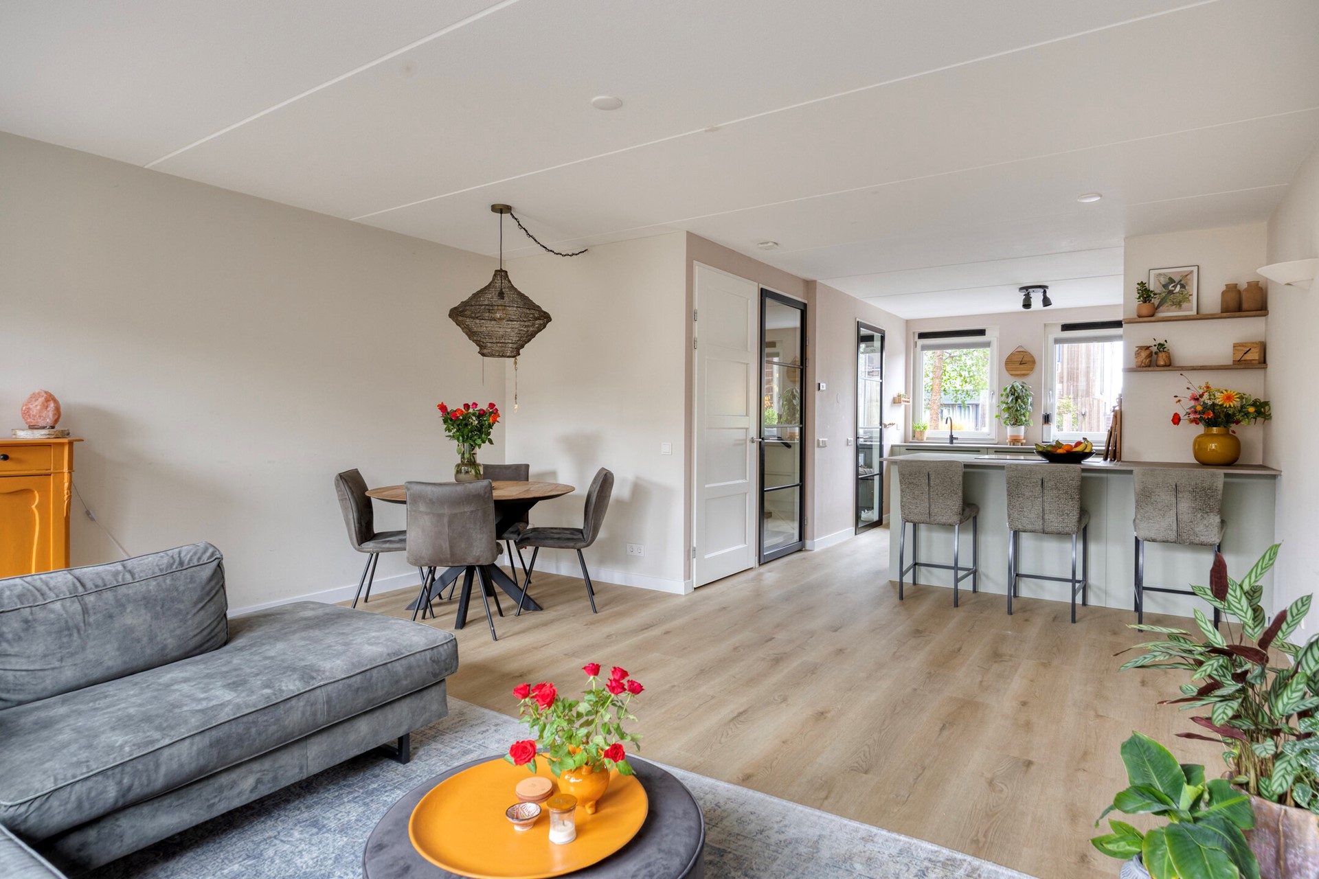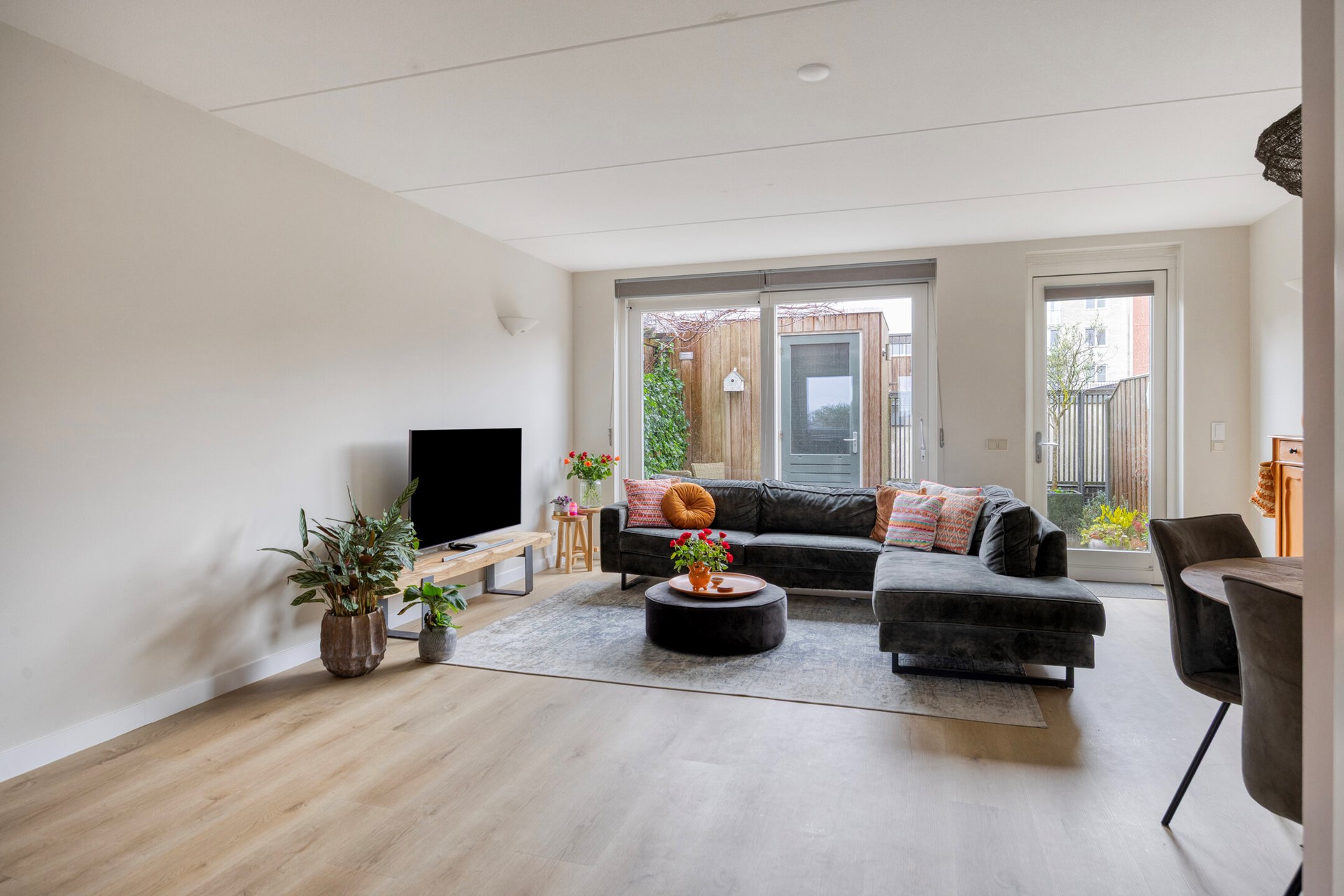 De ruime, tuingerichte en uitgebouwde woonkamer voelt direct uitnodigend aan en biedt volop mogelijkheden voor een comfortabele zithoek en een sfeervolle eettafel. Dankzij de grote raampartijen aan de achterzijde valt er royaal daglicht naar binnen. Via zowel een loopdeur als een aparte schuifpui heeft u toegang tot de achtertuin, waardoor binnen en buiten op natuurlijke wijze in elkaar overlopen.