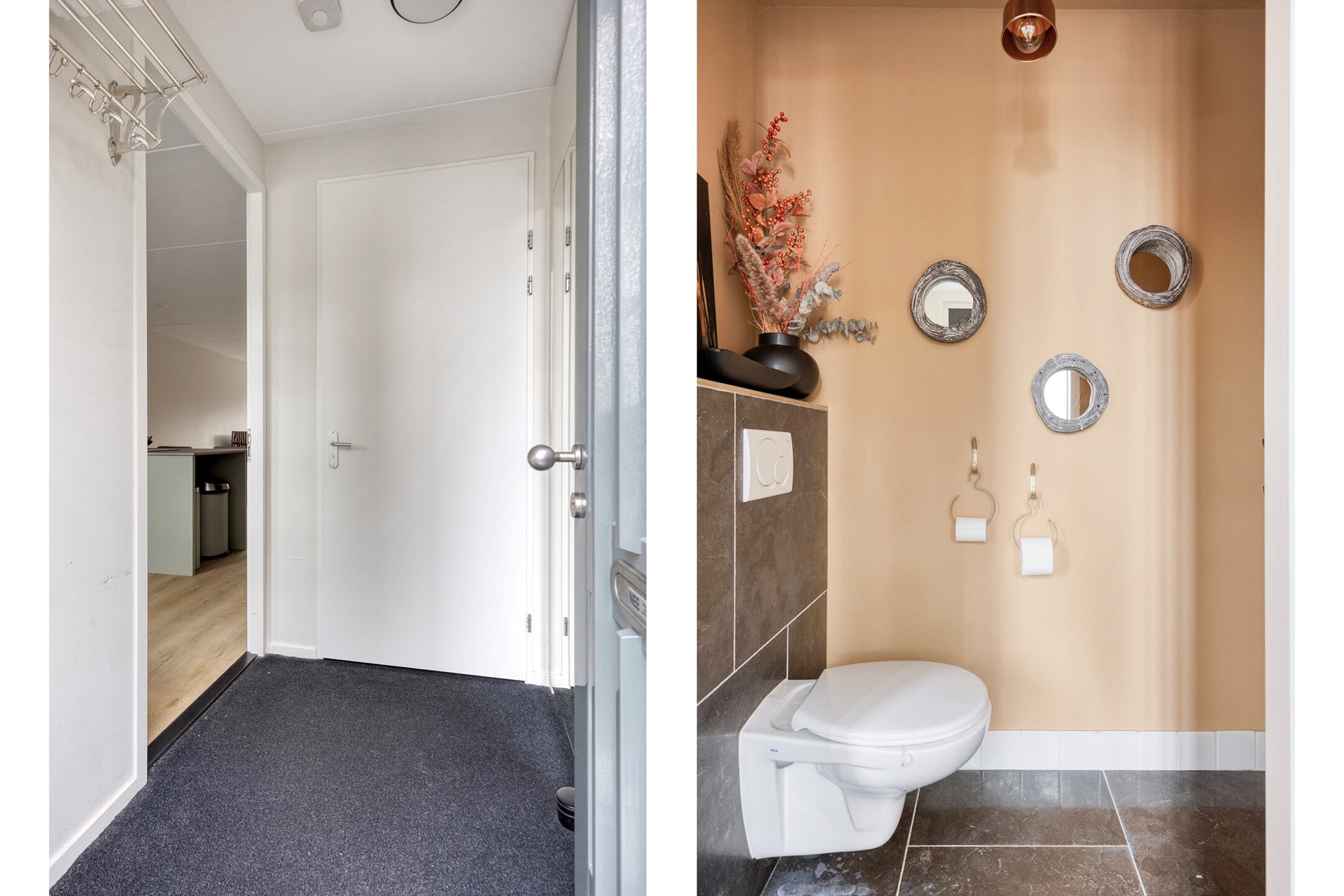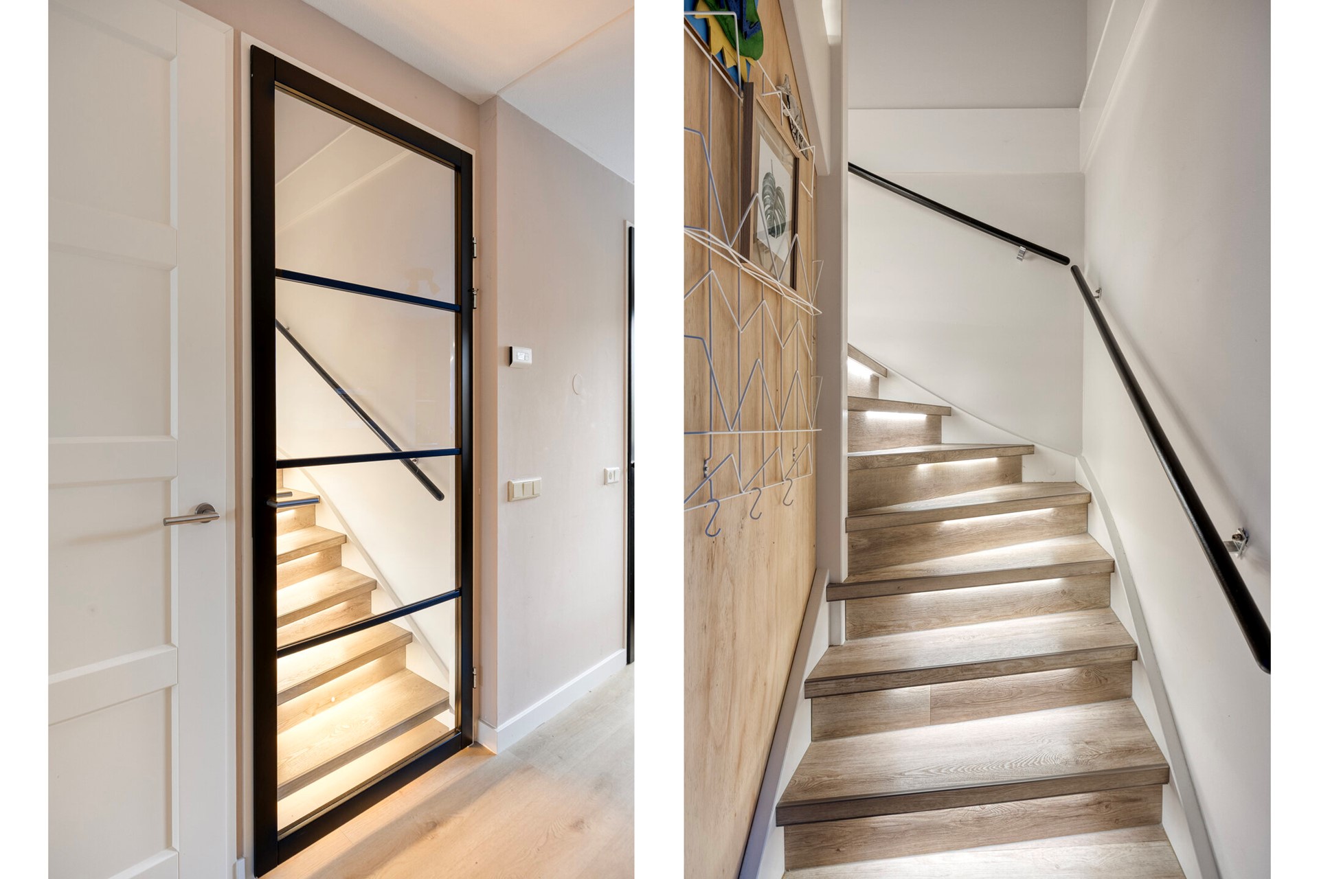 Uw auto parkeert u op uw eigen overdekte parkeerplaats in de achtergelegen parkeergarage of desgewenst op een van de openbare parkeerplaatsen in de buurt. Via een trapje met twee treden betreedt u de woning en komt u binnen in een ruime, lichte hal. Deze is voorzien van een garderobe en meterkast en geeft toegang tot het toilet met fontein. De hal opent naar de moderne, open keuken – het warme hart van het huis – via een stijlvolle houten scharnierdeur met glas, afgewerkt met de strakke, zwarte uitstraling van staal.