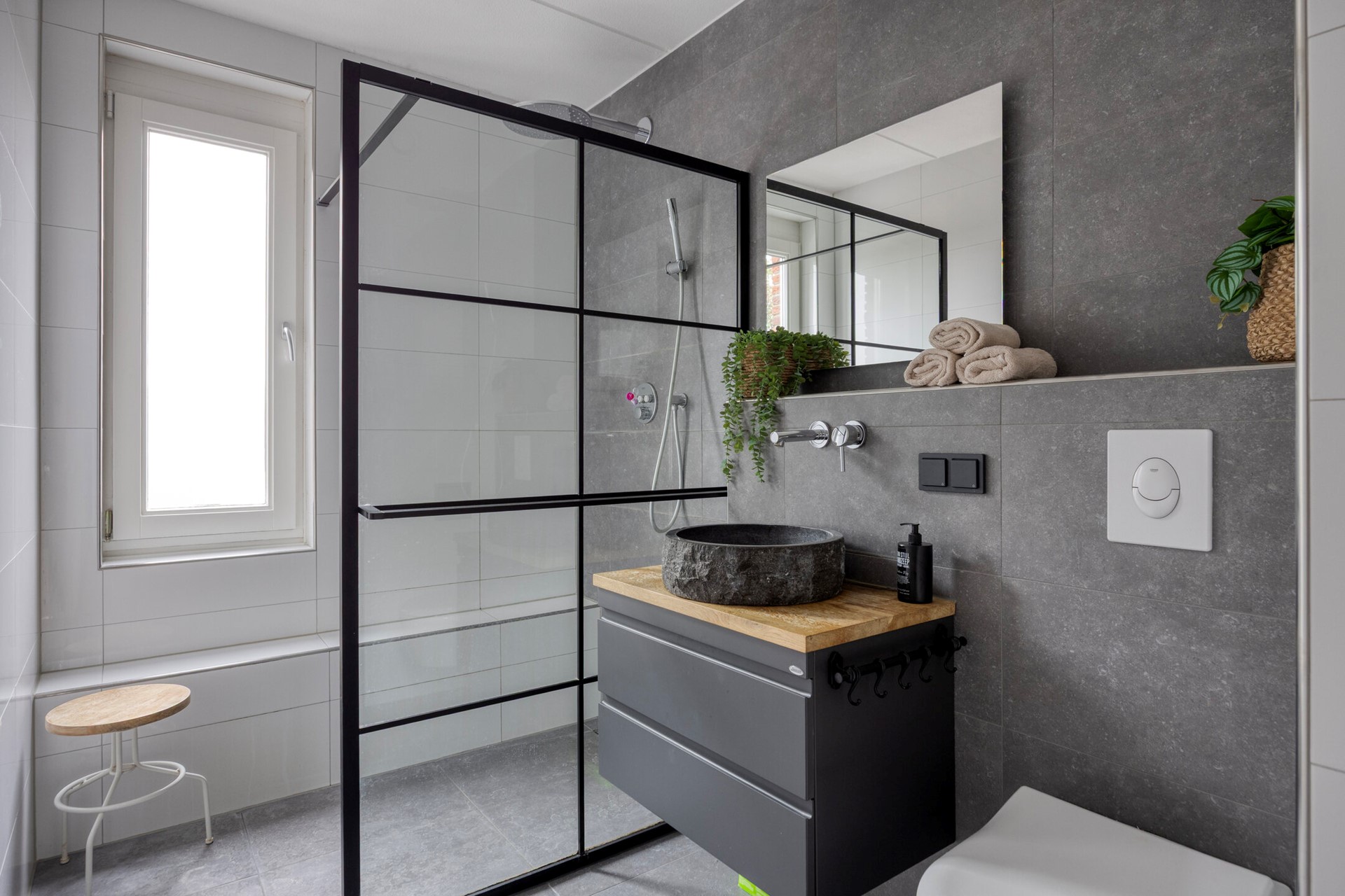 De luxe badkamer ligt aan de voorzijde en is uitgerust met een inloopdouche, een stijlvol wastafelmeubel en een tweede toilet.