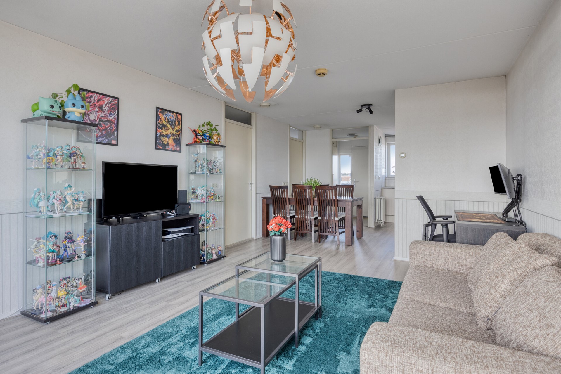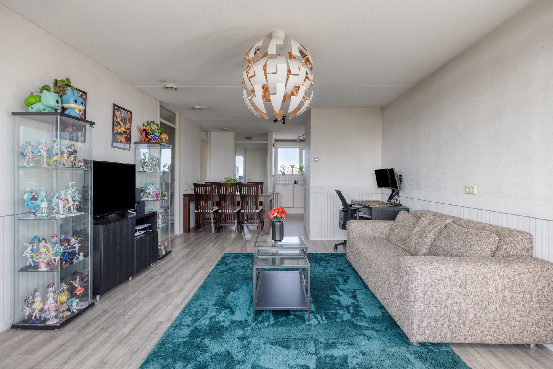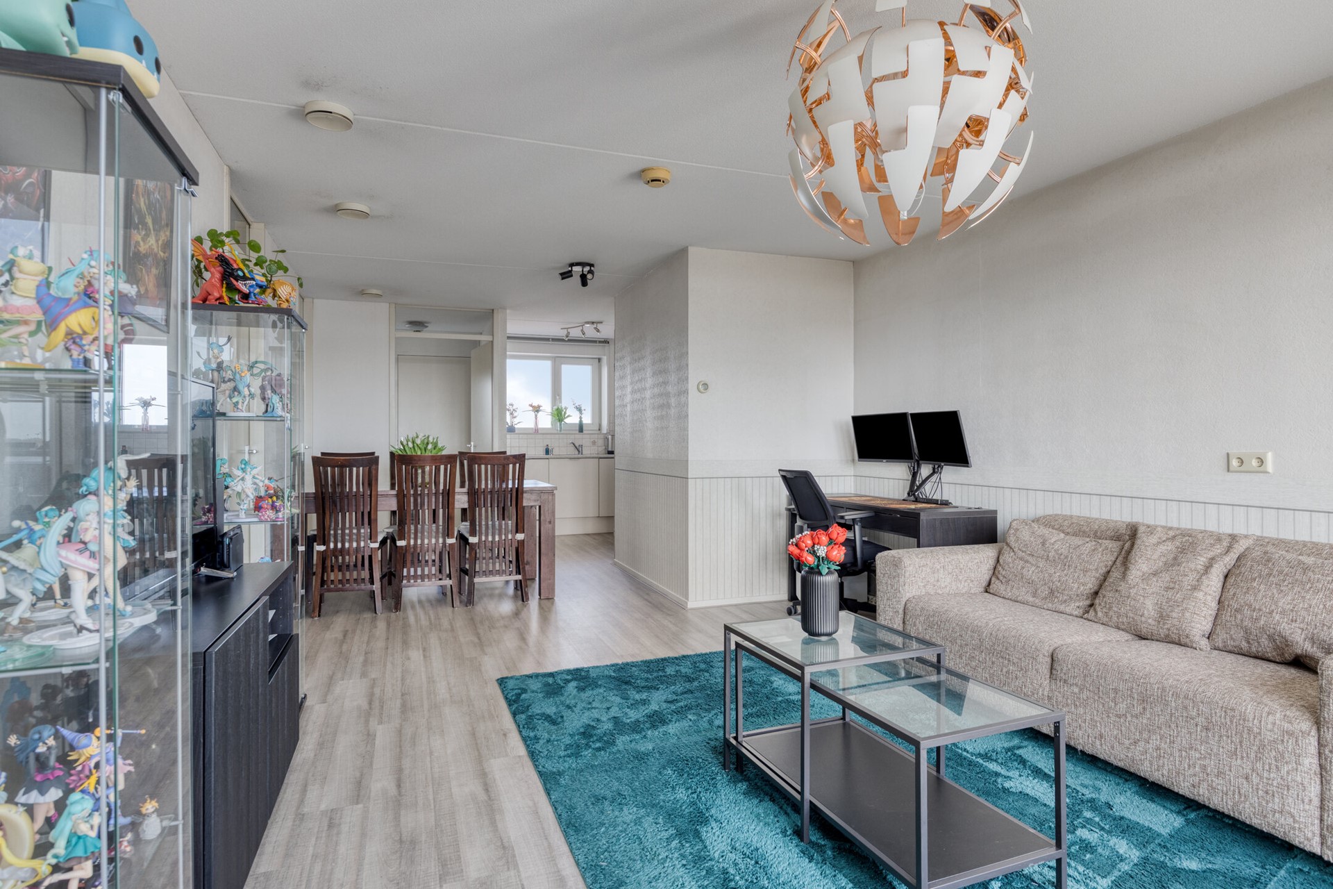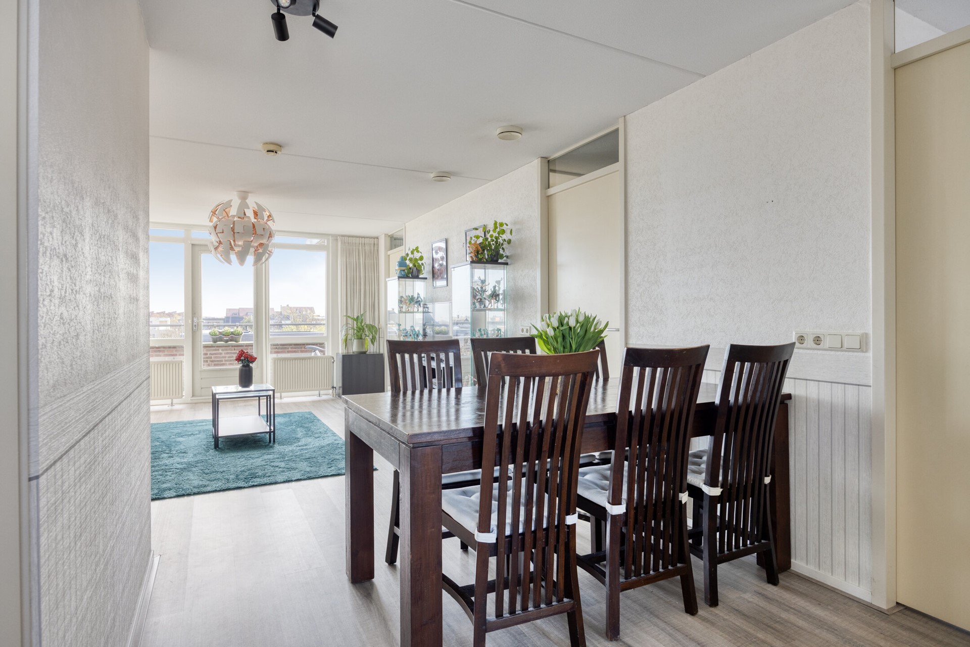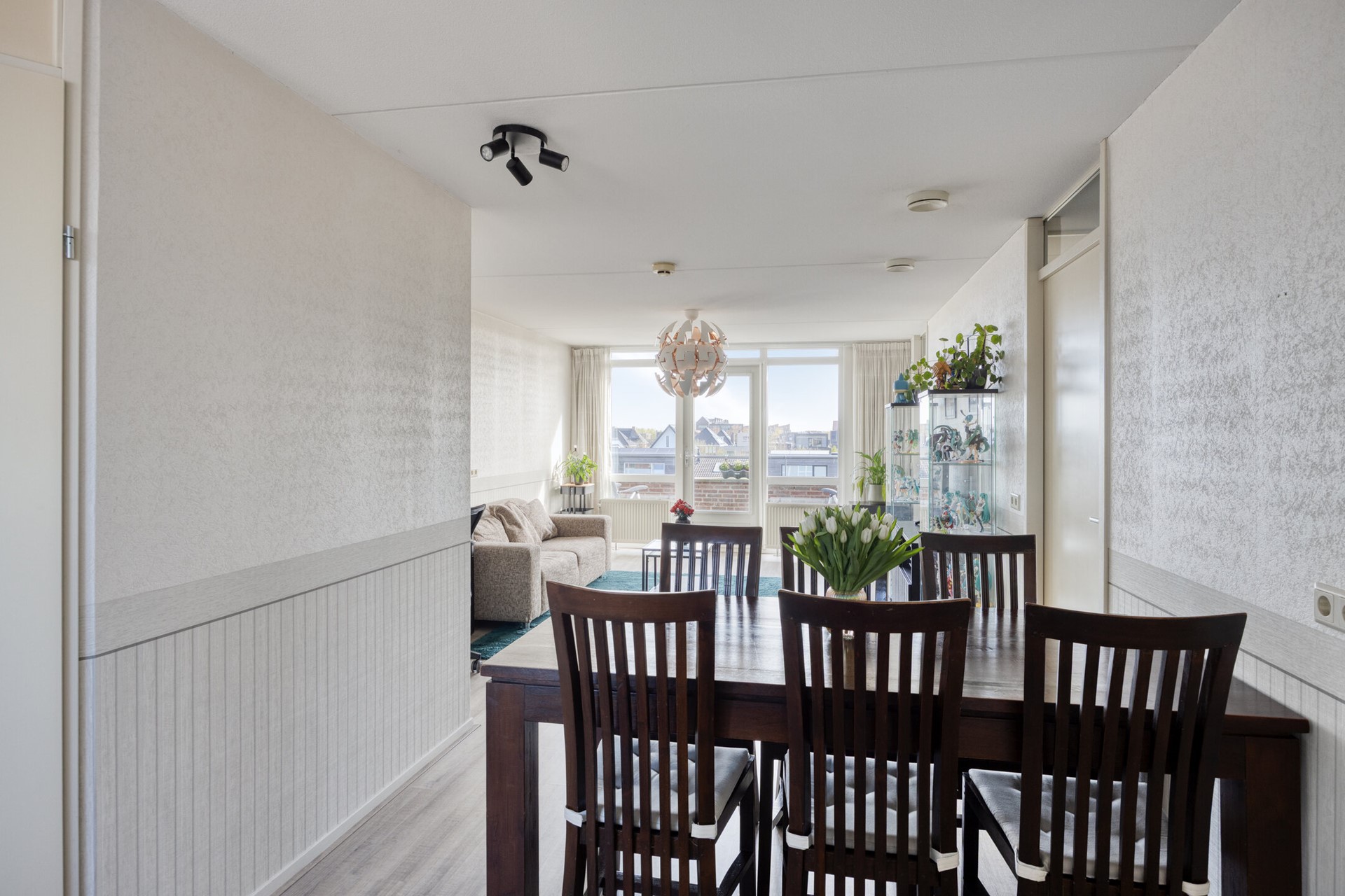 De woonkamer ligt aan de achterzijde en biedt voldoende ruimte voor een comfortabele zit- en eethoek. Vanuit hier bereikt u de slaapkamers, de badkamer en het balkon.