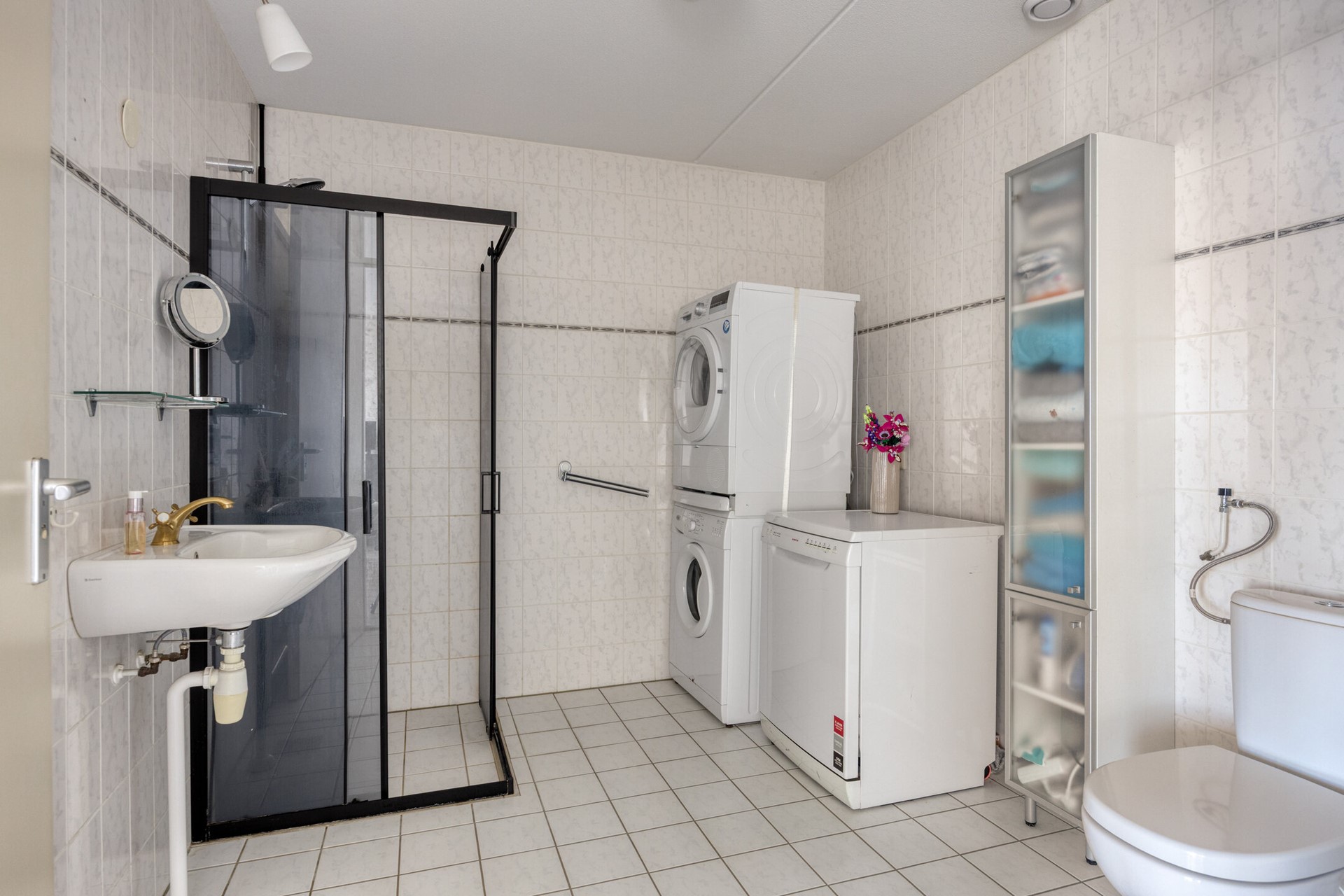De badkamer is praktisch ingericht en voorzien van een douche, wastafel, toilet en een aansluiting voor de wasmachine.