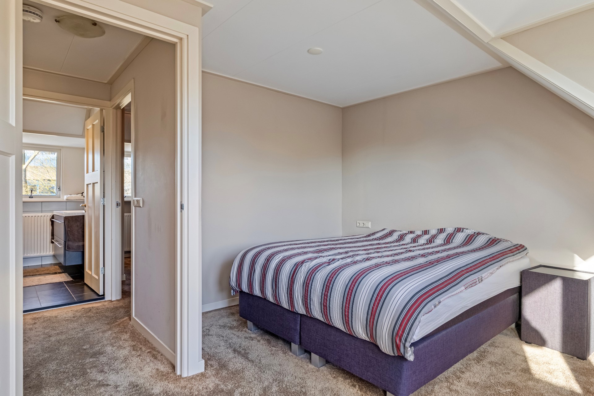 De ruime hoofdslaapkamer bevindt zich aan de achterzijde en is voorzien van een dakkapel, inbouwspots en een deur naar het platte dak. De tweede slaapkamer ligt aan de voorzijde en beschikt eveneens gedeeltelijk over een dakkapel.
