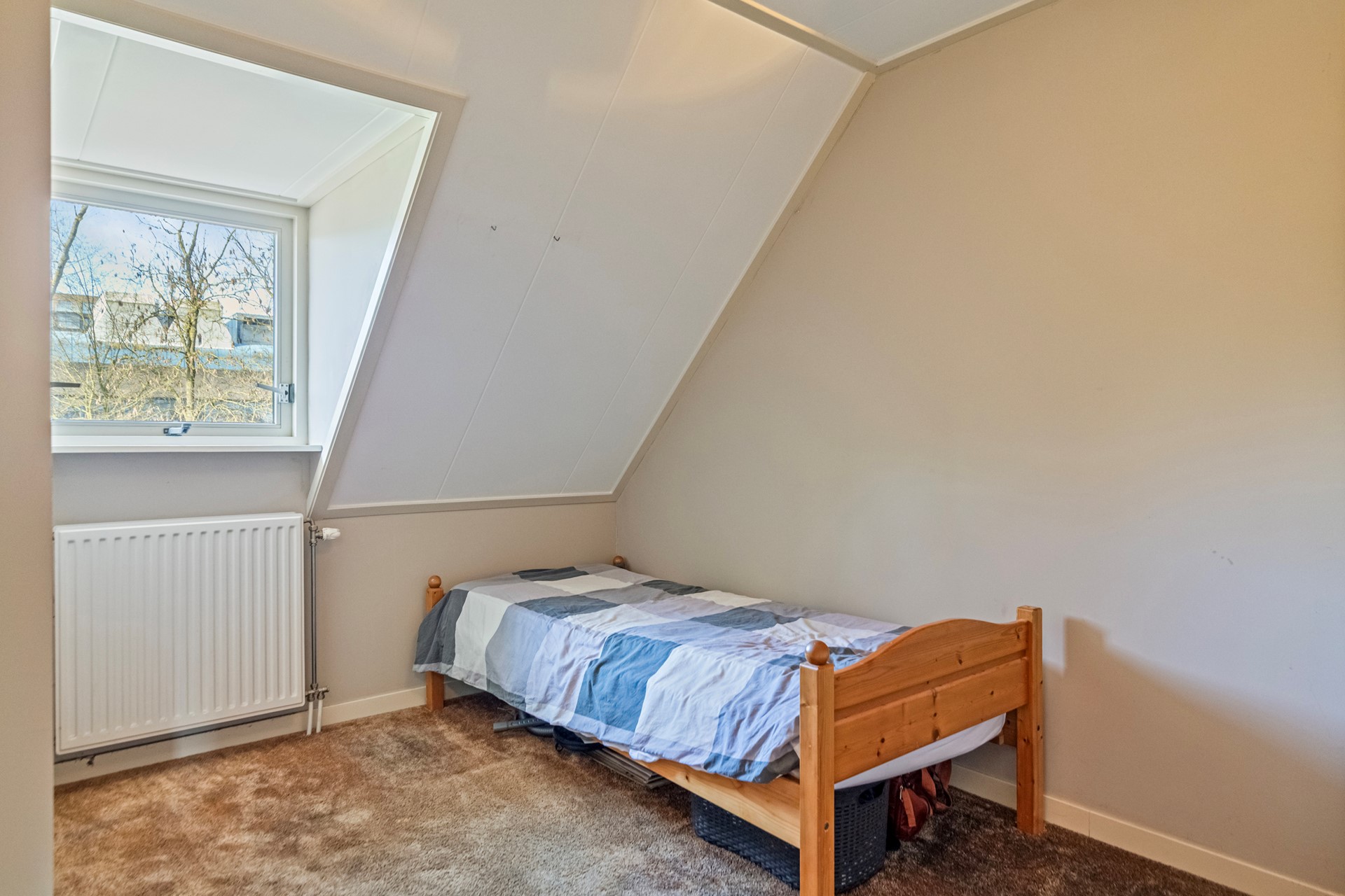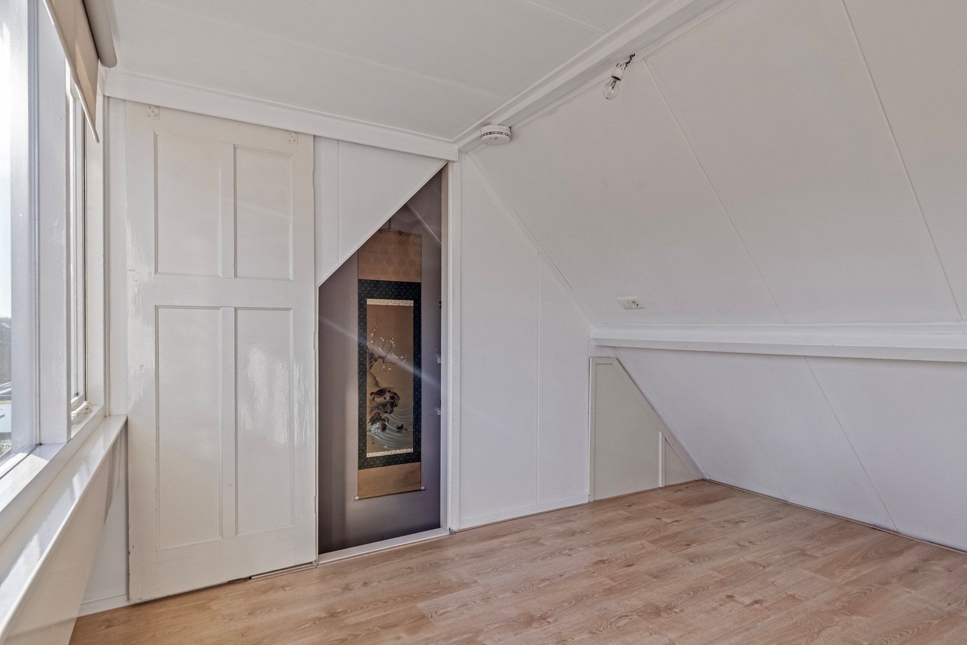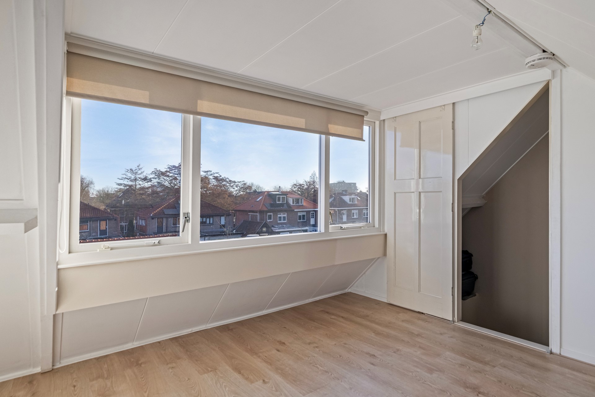 De tweede verdieping biedt een derde slaapkamer met een grote dakkapel aan de achterzijde. Deze ruimte is afgewerkt met een laminaatvloer en biedt voldoende ruimte voor een slaapkamer, werkplek of hobbyruimte.