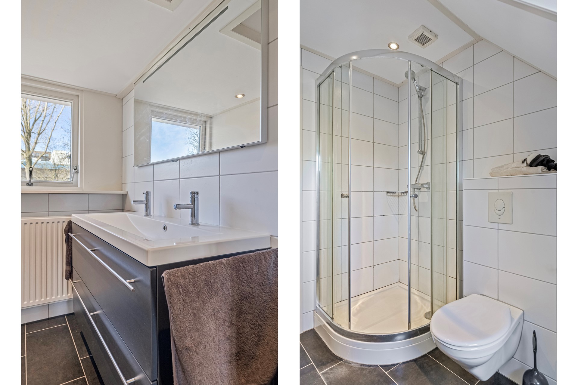 De badkamer is volledig betegeld en ingericht met een douche, een dubbele wastafel met lades en spiegel en een toilet.