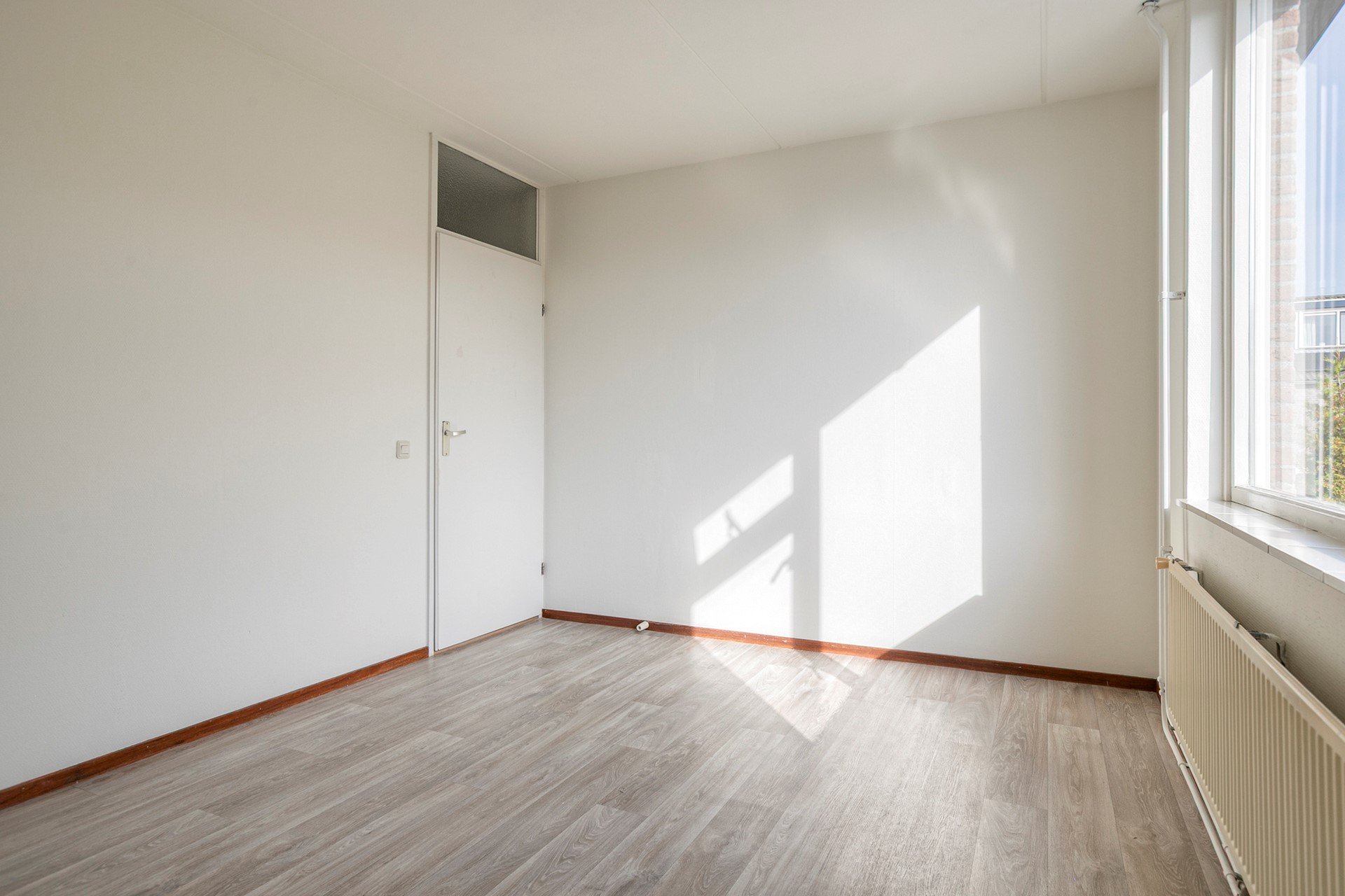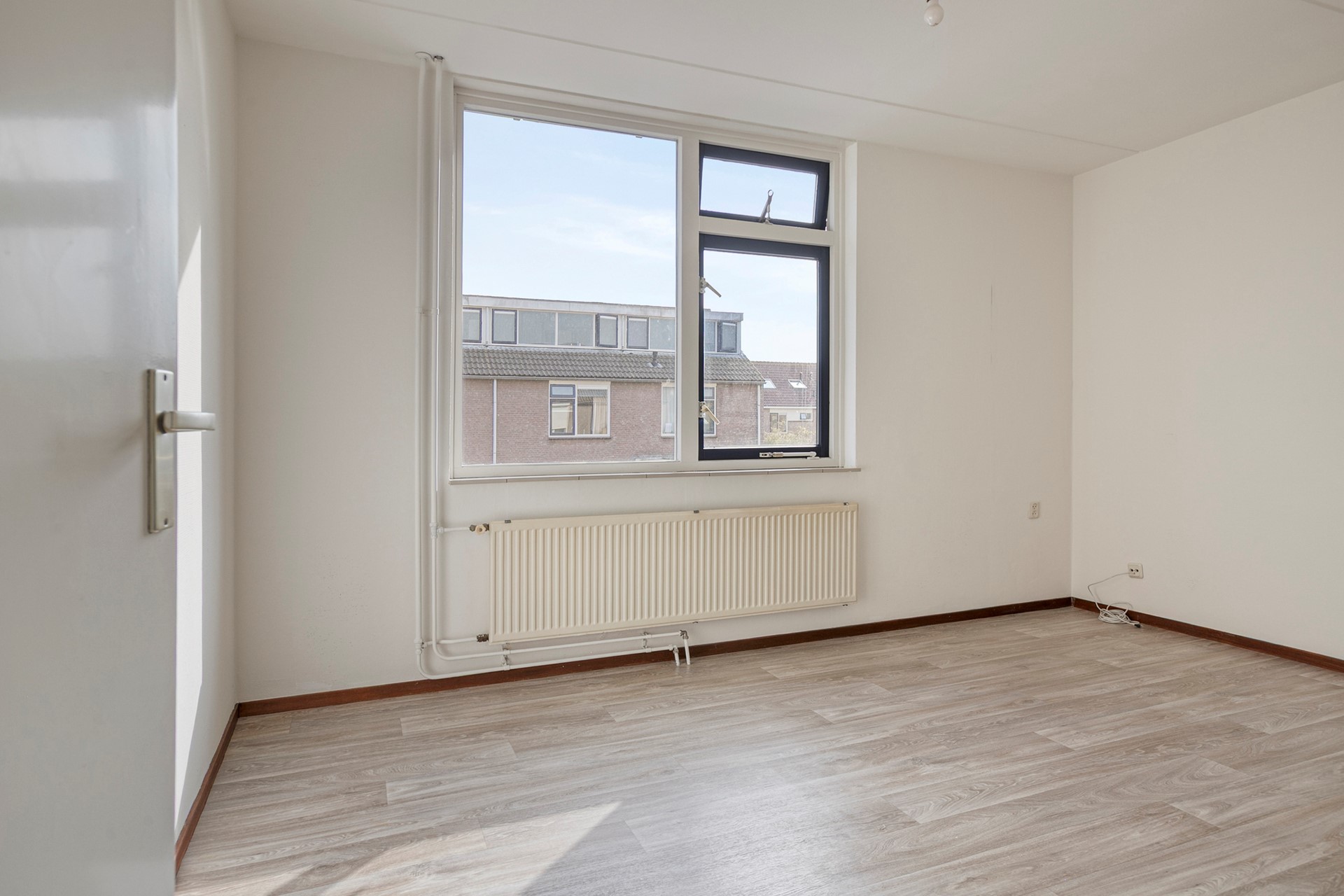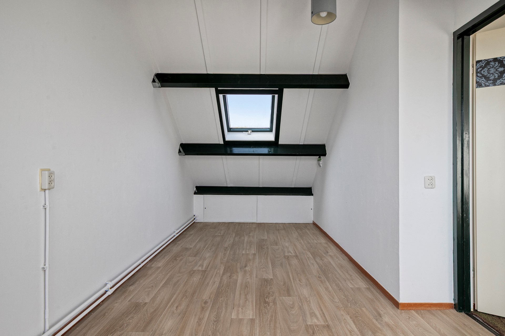 Een vaste trap leidt naar de tweede verdieping met overloop, waar de cv-installatie en de aansluiting voor de wasmachine zijn geplaatst. Achter de knieschotten vindt u extra bergruimte. Vanaf de overloop is de derde slaapkamer bereikbaar, een verrassend ruime kamer met zowel een dakkapel als een dakraam. Ook hier is bergruimte achter de knieschotten aanwezig.