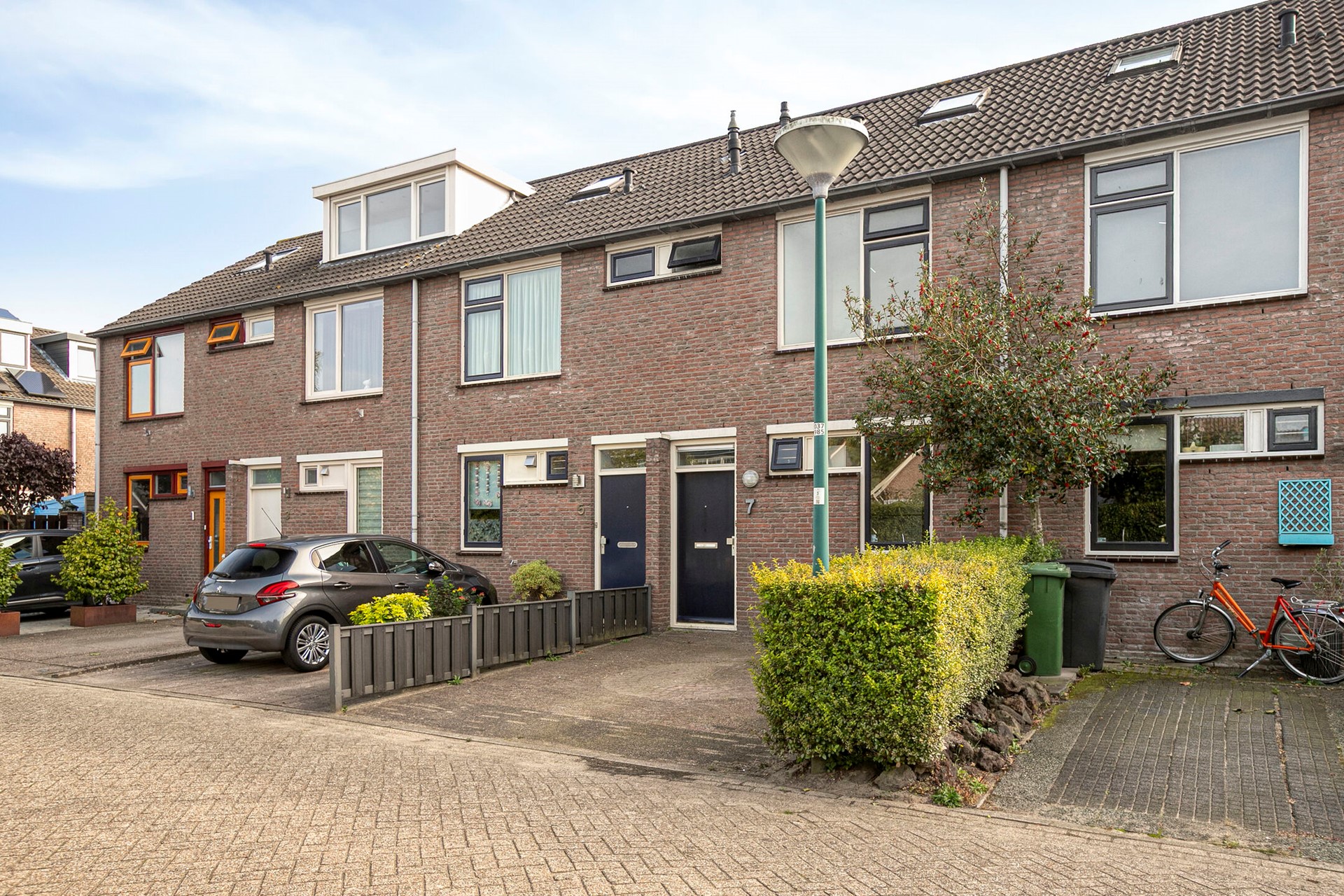 De voortuin, gelegen op het noorden, is volledig bestraat en biedt ruimte om de auto te parkeren. De erfafscheiding bestaat aan de rechterzijde uit een groene haag en aan de linkerzijde uit een lage schutting.